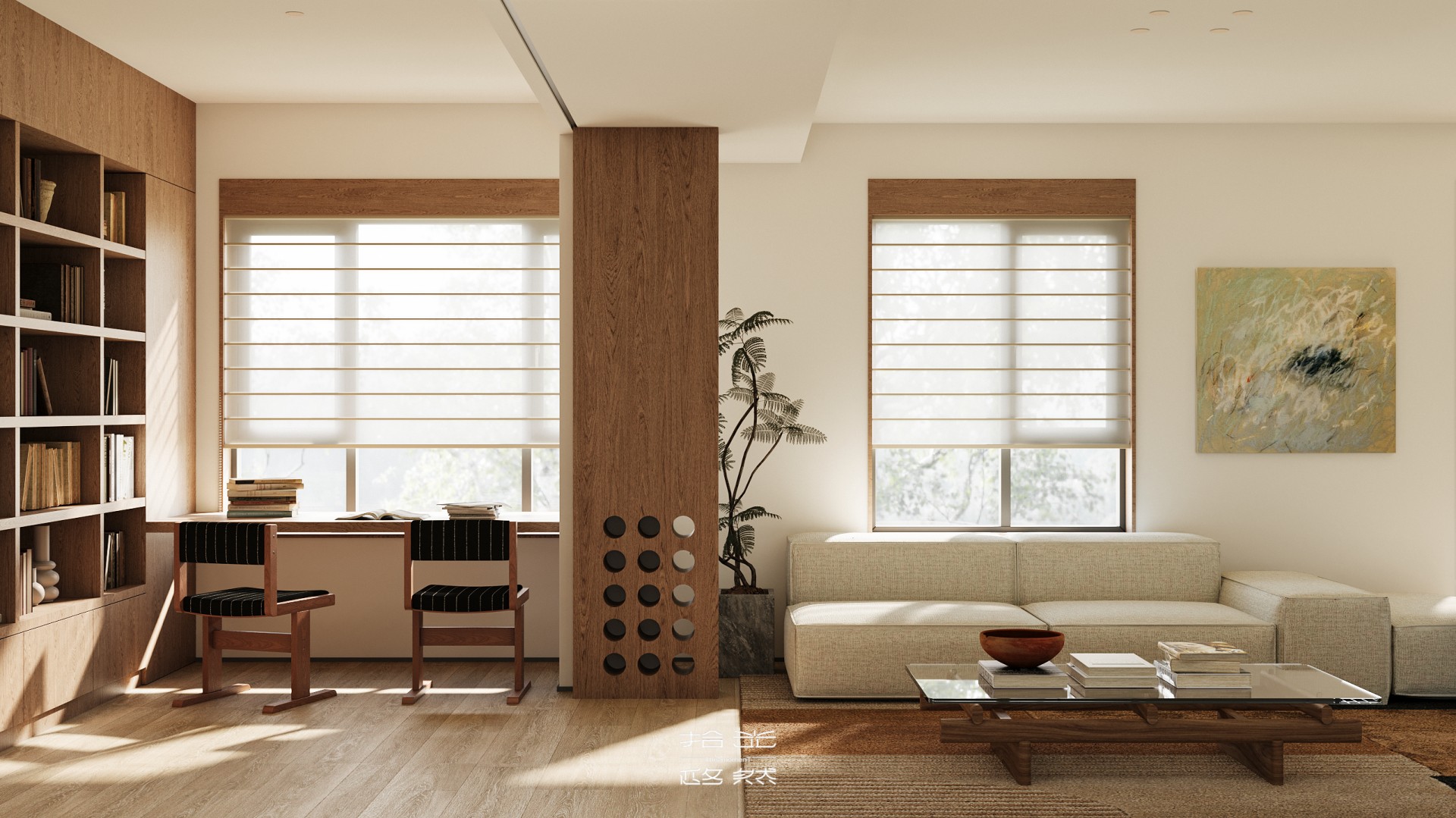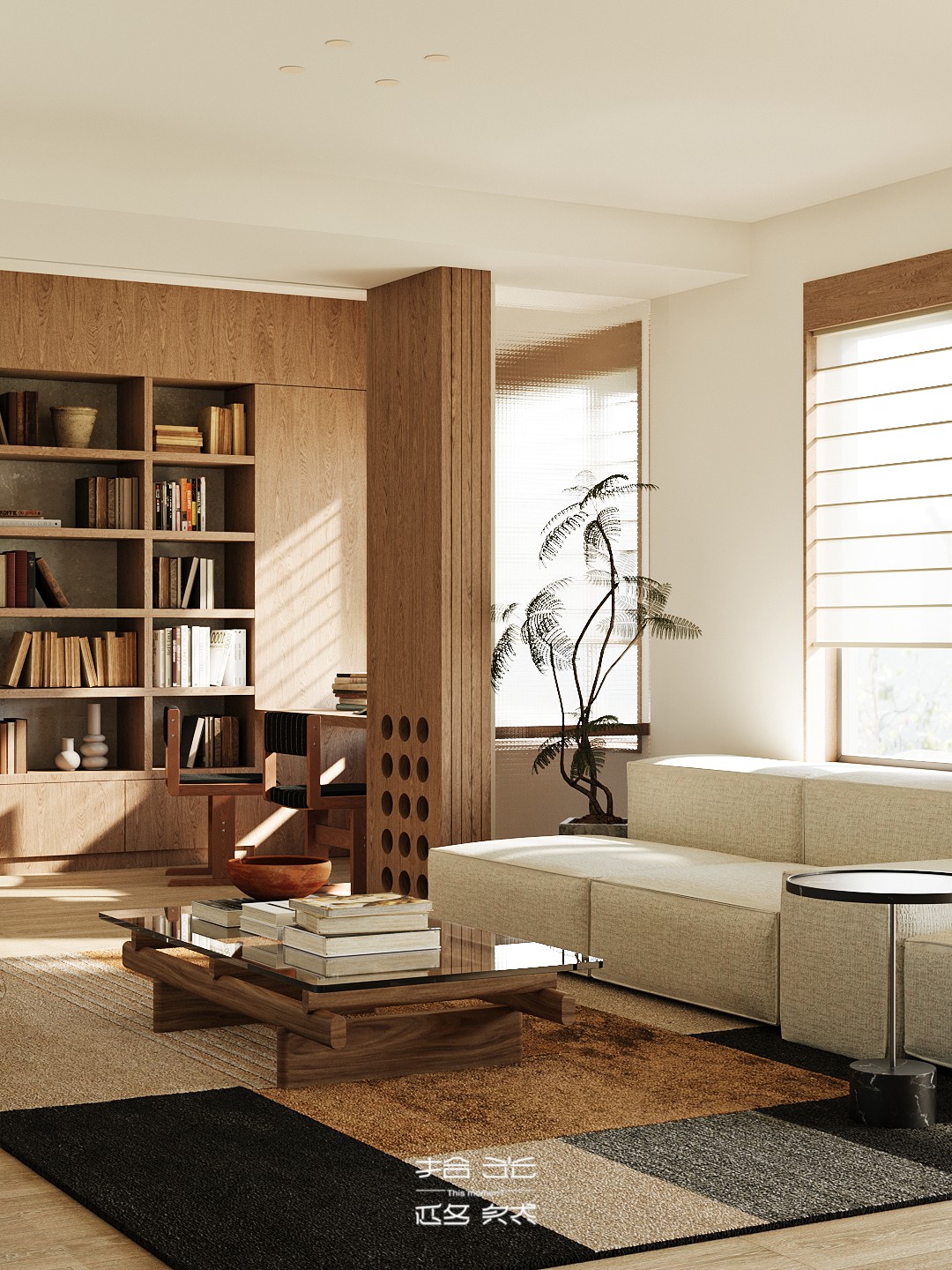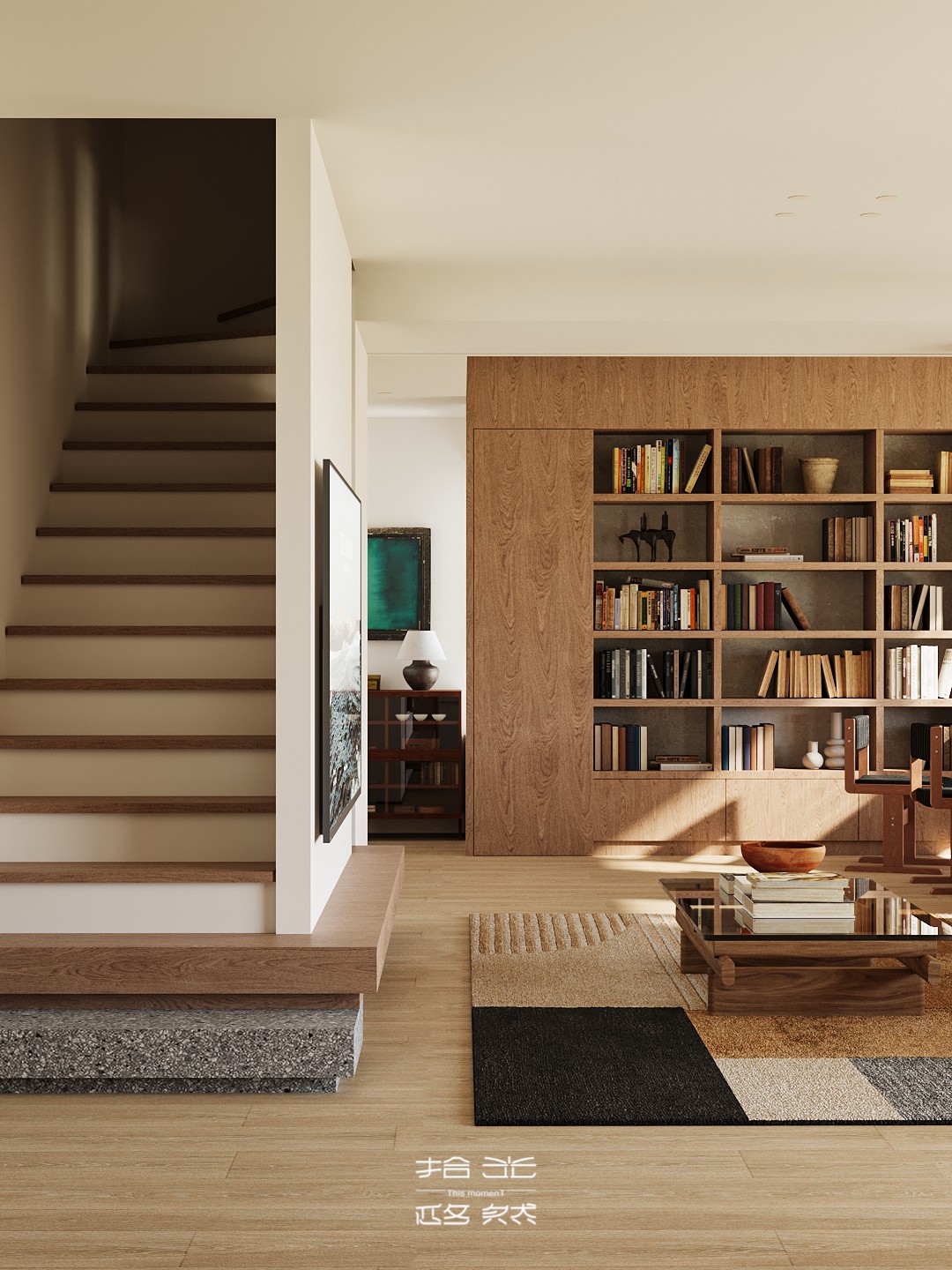 家的温度,藏在材质的呼吸里。这套跃层设计,采用原木自然的诠释,融合空间韵律 —— 温润木色贯穿上下,书架、隔断、家具,以质朴肌理串联起客厅、阅读区、餐厨。光影落在木纹上,每一处转角都藏着「让时间慢下来」的松弛,把日常过成与自然共生的散文诗 。