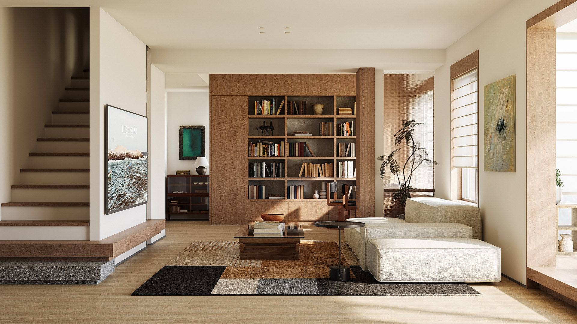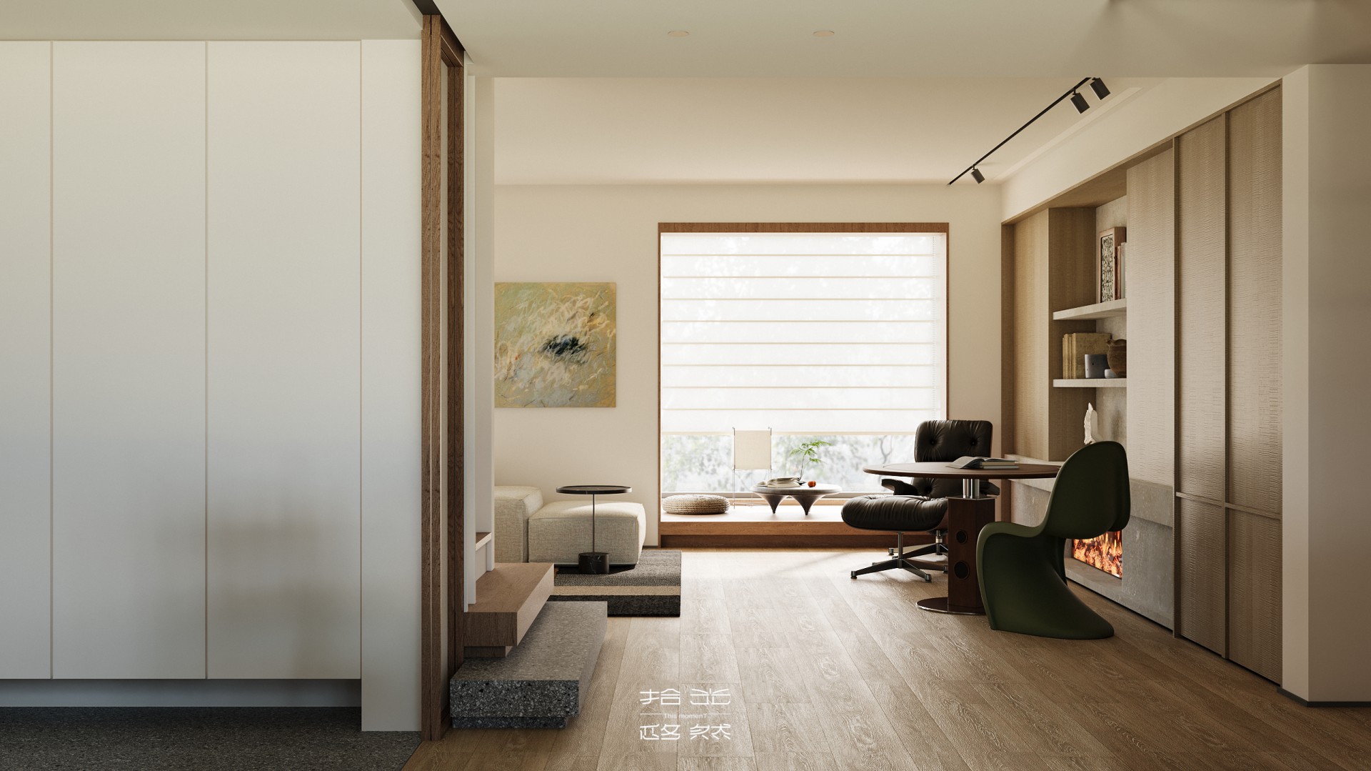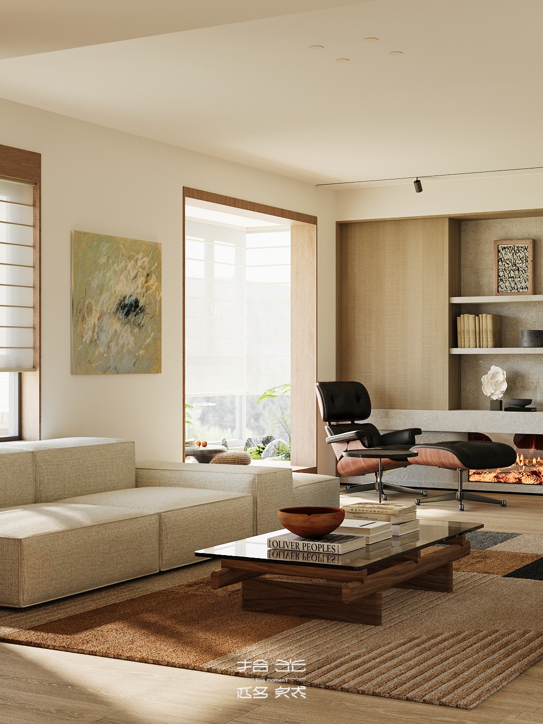 家的温度,藏在材质的呼吸里。这套跃层设计,采用原木自然的诠释,融合空间韵律 —— 温润木色贯穿上下,书架、隔断、家具,以质朴肌理串联起客厅、阅读区、餐厨。光影落在木纹上,每一处转角都藏着「让时间慢下来」的松弛,把日常过成与自然共生的散文诗 。