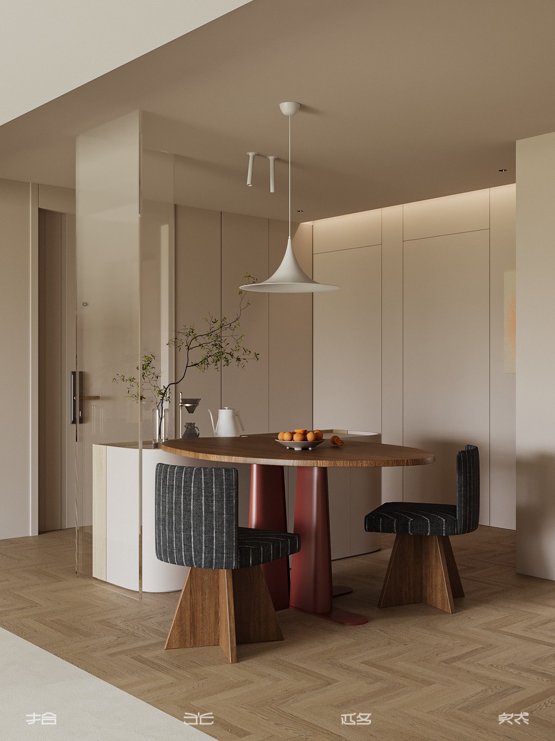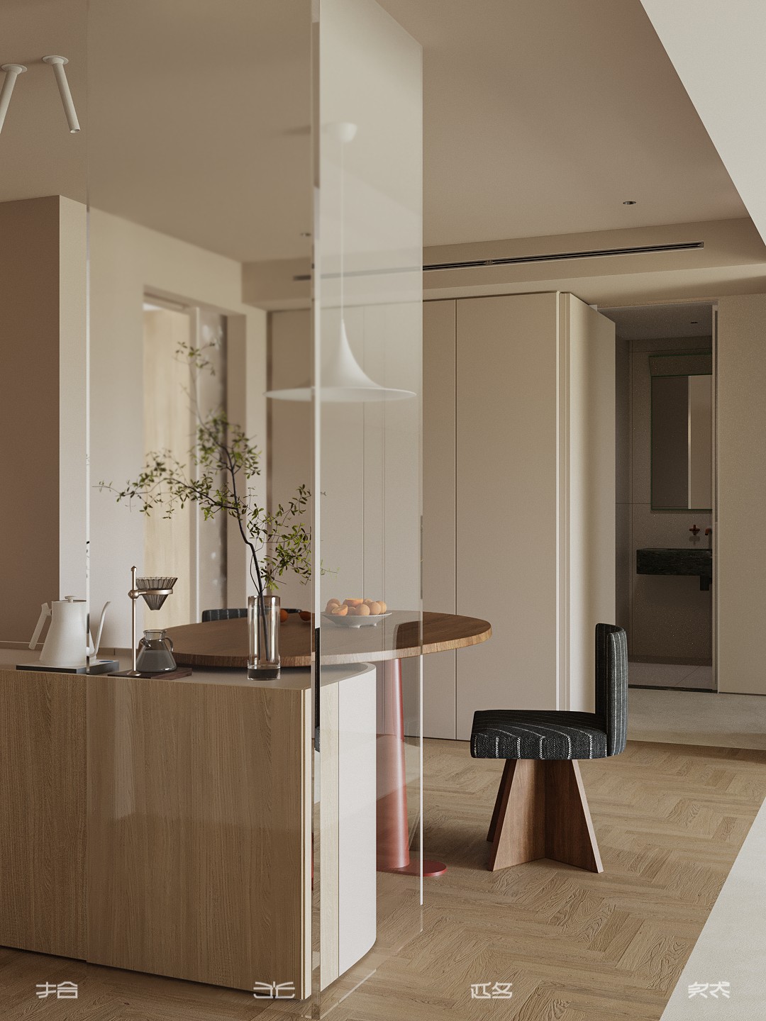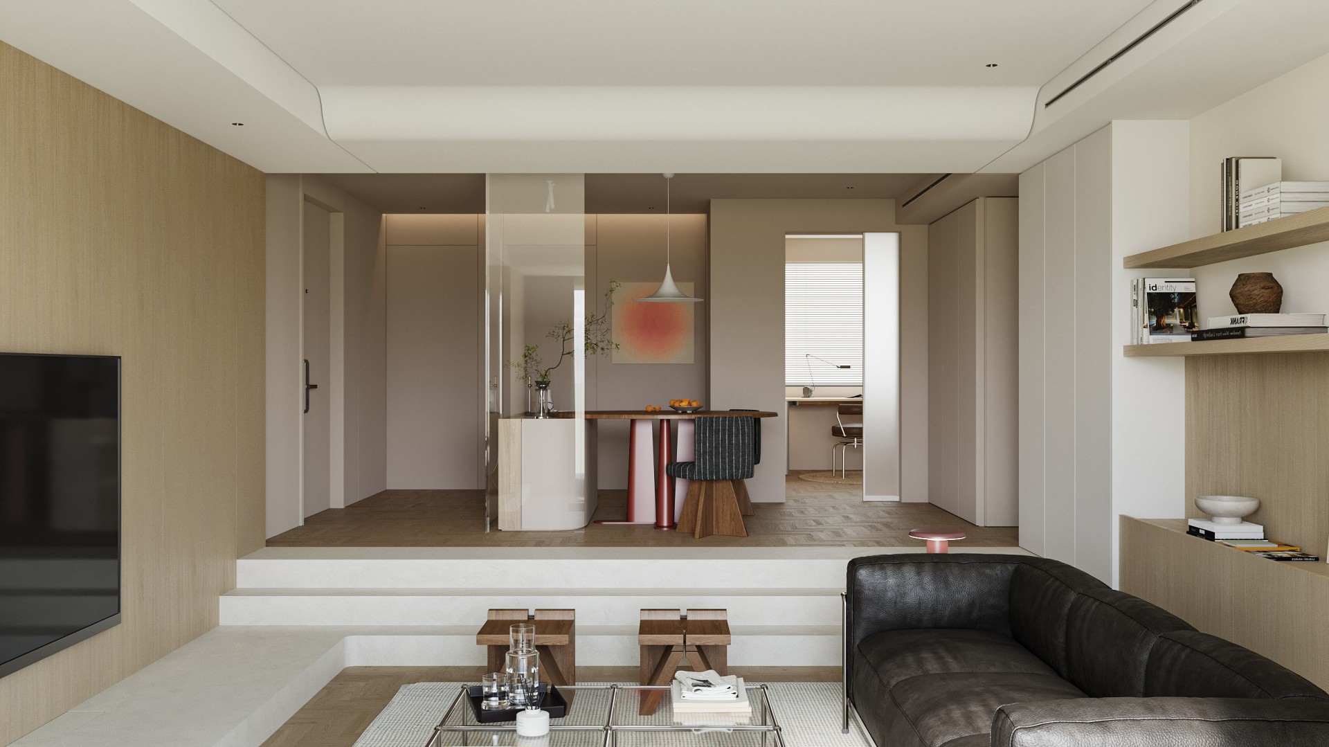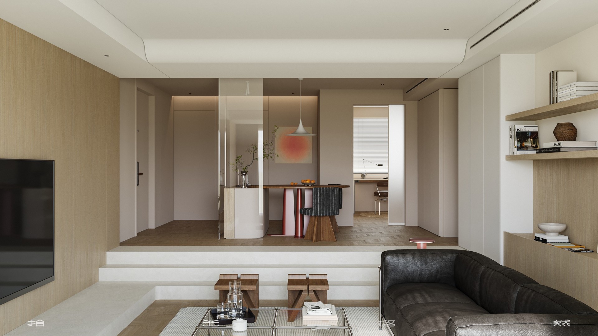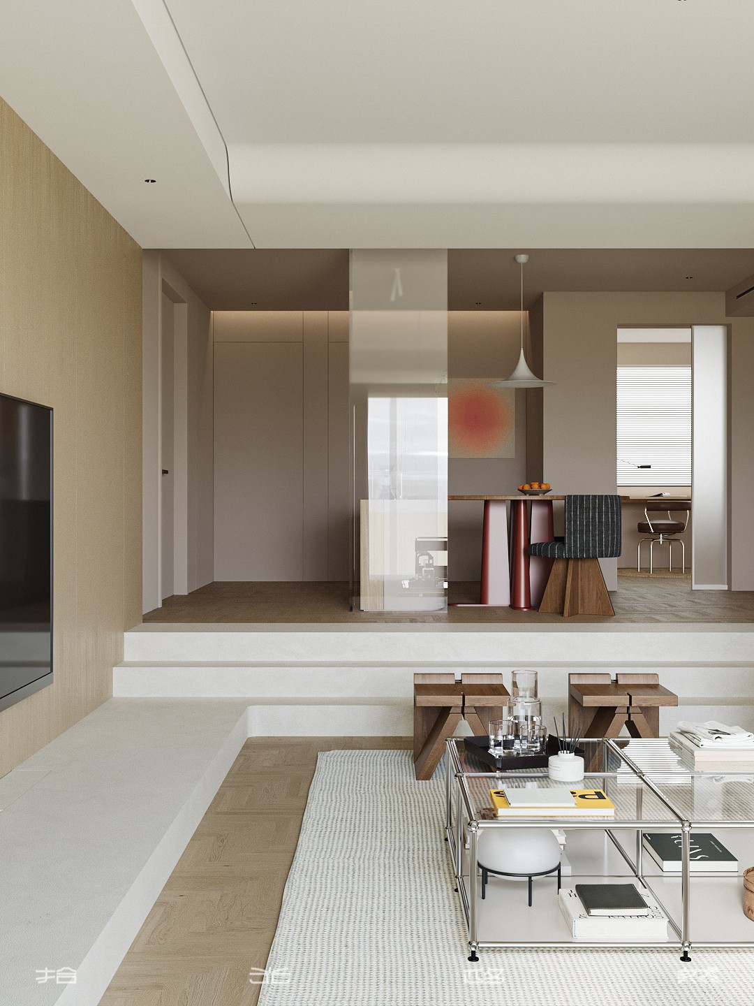 当入户门与餐厅直面对话,空间便面临隐私与通透的双重命题。本案以“隔而不断”为设计哲学,通过材质碰撞、光影渗透与错层叙事,将功能分区转化为流动的艺术装置。 米色艺术涂料墙面与橡木人字拼地板构成温暖底色,墙面以纵向木饰面线条延伸视觉高度,弱化层高限制。餐桌选用胡桃木椭圆桌,桌腿融入金属细腿设计,与皮质餐椅的哑光皮质形成“刚柔对冲”。 悬浮式电视背景墙采用双层结构——外层为烤漆玻璃隔断,内嵌线性灯带;内层为错层台阶,台阶侧面嵌入镜面,反射光线至餐厅区域,形成“光之瀑布”。