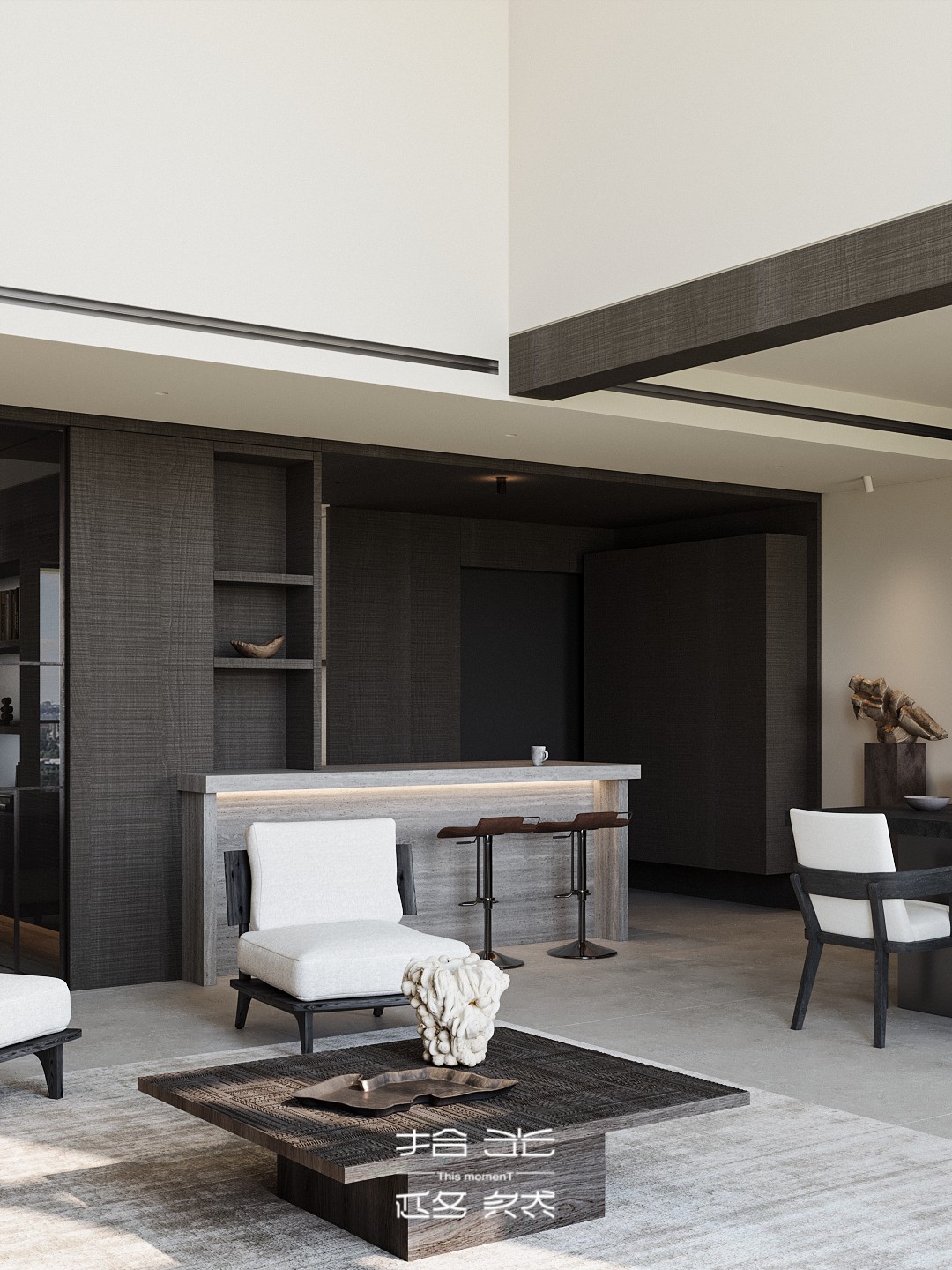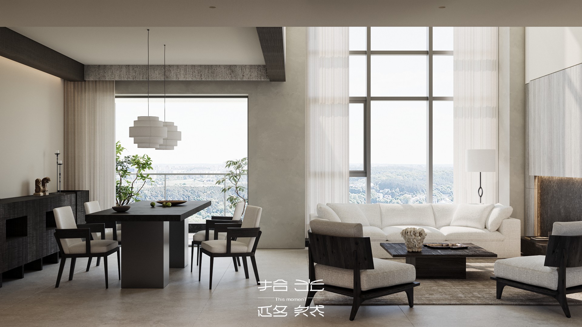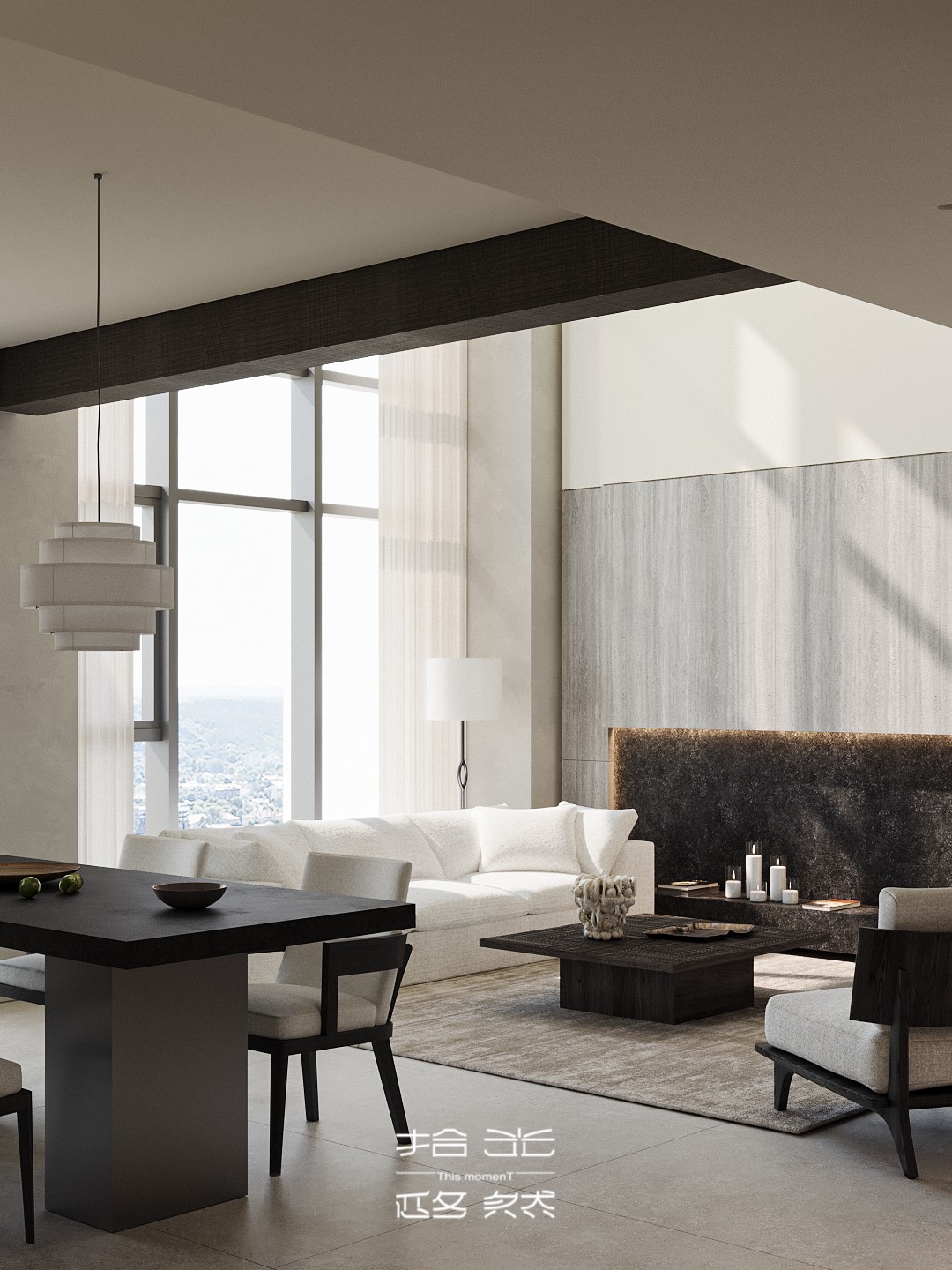 建筑的诗意,往往藏在对自然的邀约里。这座挑空大平层以超高层高为序,将巨幅落地窗化作取景框,让天光云影成为每日更迭的天然画卷。当晨曦穿透玻璃漫过地面,暮色裹挟着城市灯火流淌而入,空间便成了承载时光流转的容器,无需多余装饰,自然的韵律已是最美的片段。