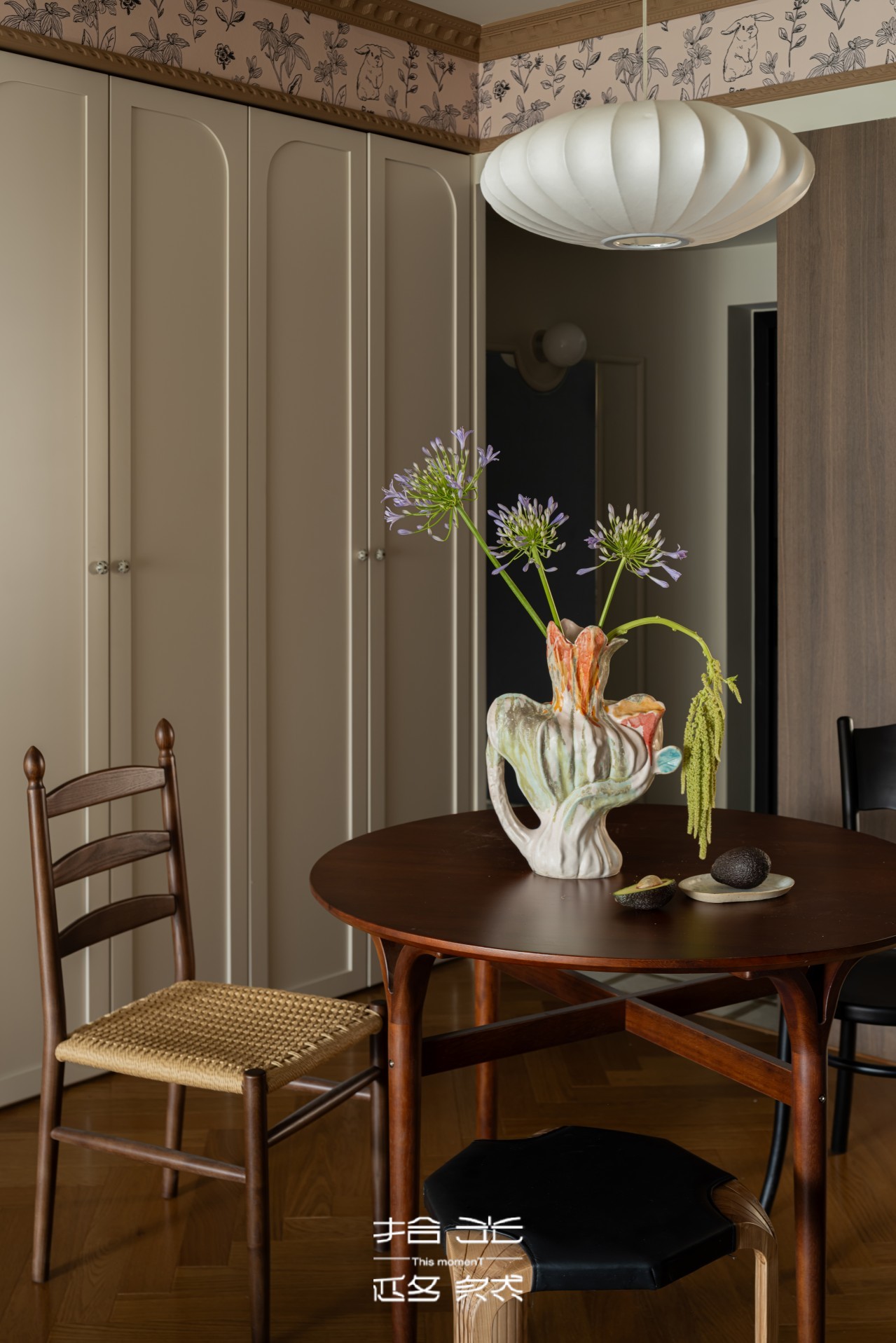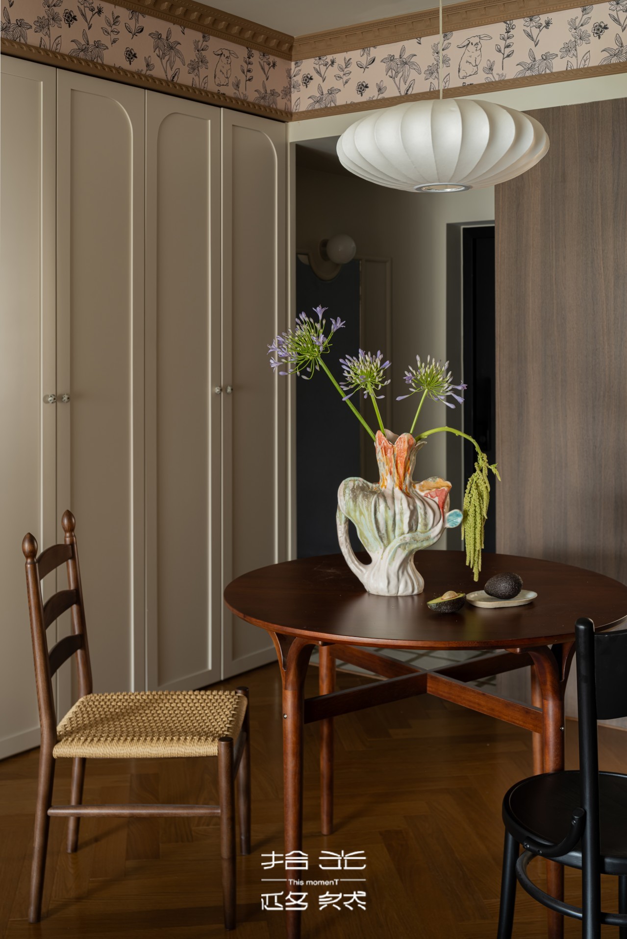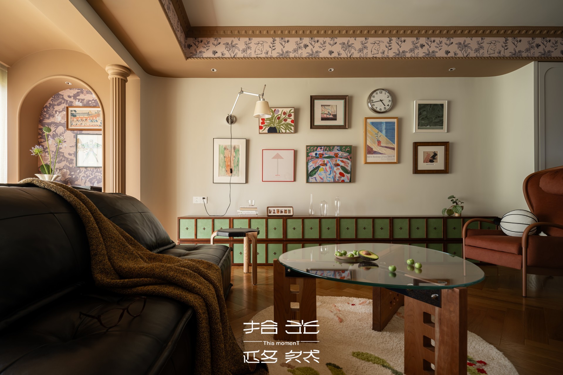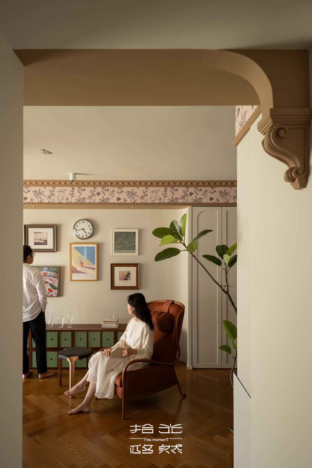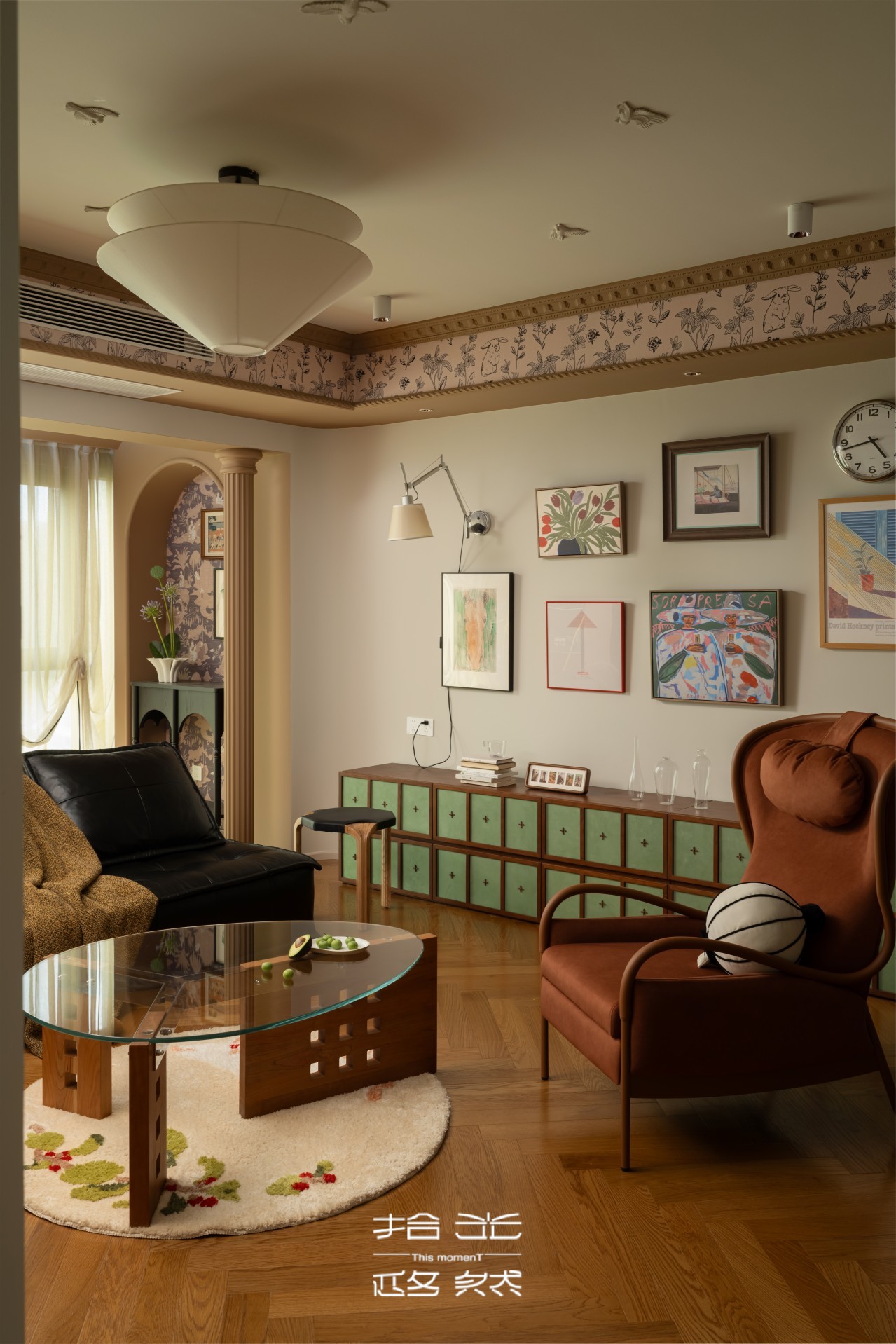 推开屋主家门的瞬间,我们被那抹跳脱的复古棕和复古绿抓住了目光。复古花纹墙纸,藏着长辈们念叨的旧时光,又暗暗和屋主钟爱的暗绿呼应,就像家里老人默默支持她的喜好,不动声色却满是温度。