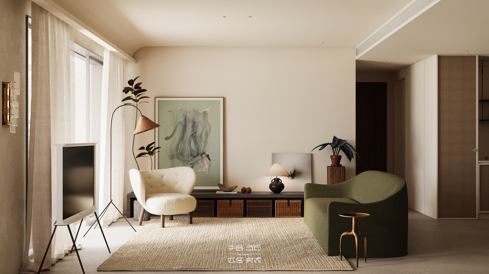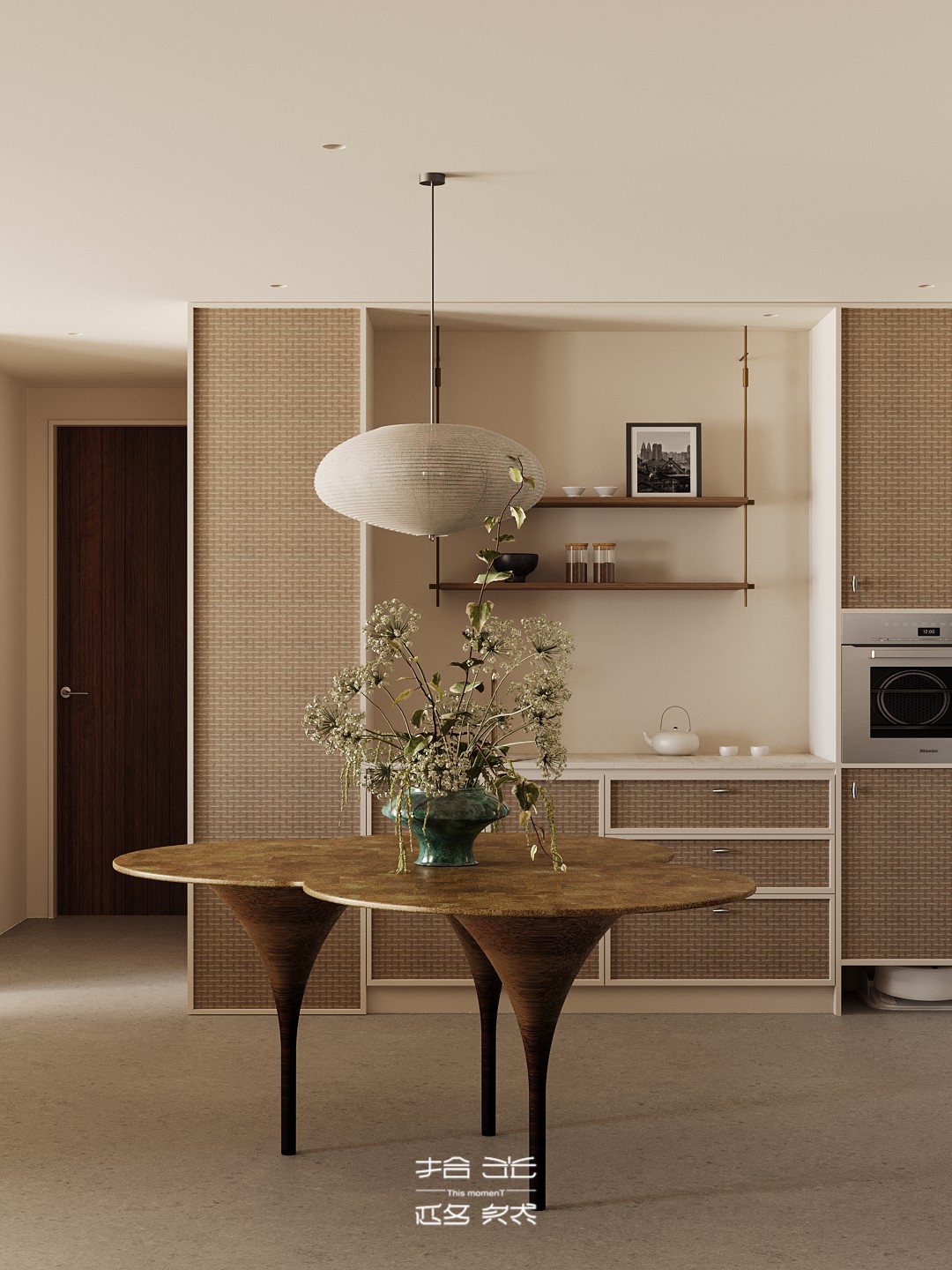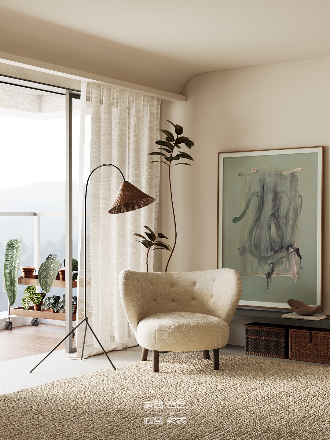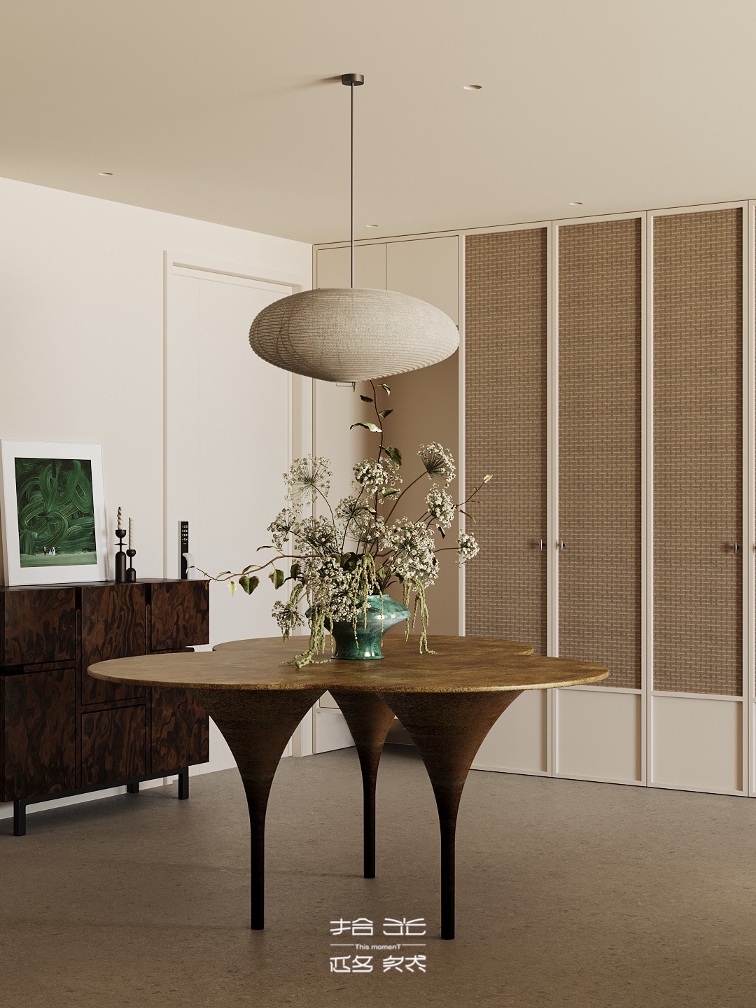 我们将“自然浸润生活”作为核心表达,家便成了能让人彻底松弛的精神场域。在这套142㎡的精装房中,我们试图让自然的肌理温润的质感与生活的诗意深度交融。 从客厅里似云朵般柔和的单椅,到卧室中裹挟着草木气息的静谧氛围。从阳台满溢的绿意,到书房里与光影共生的书架,每一处都在消解“设计感”的刻意,还原生活本真 的松弛。 没有冗余的装饰,却处处藏着对自然的呼应:大地色系的铺陈如晨光轻拂,木质与藤编的肌理似林间低语,艺术画作与绿植的搭配更让空间呼吸感十足。 餐厨区造型独特的餐桌、卧室简约柔和的床具、书房通透有序的布局……