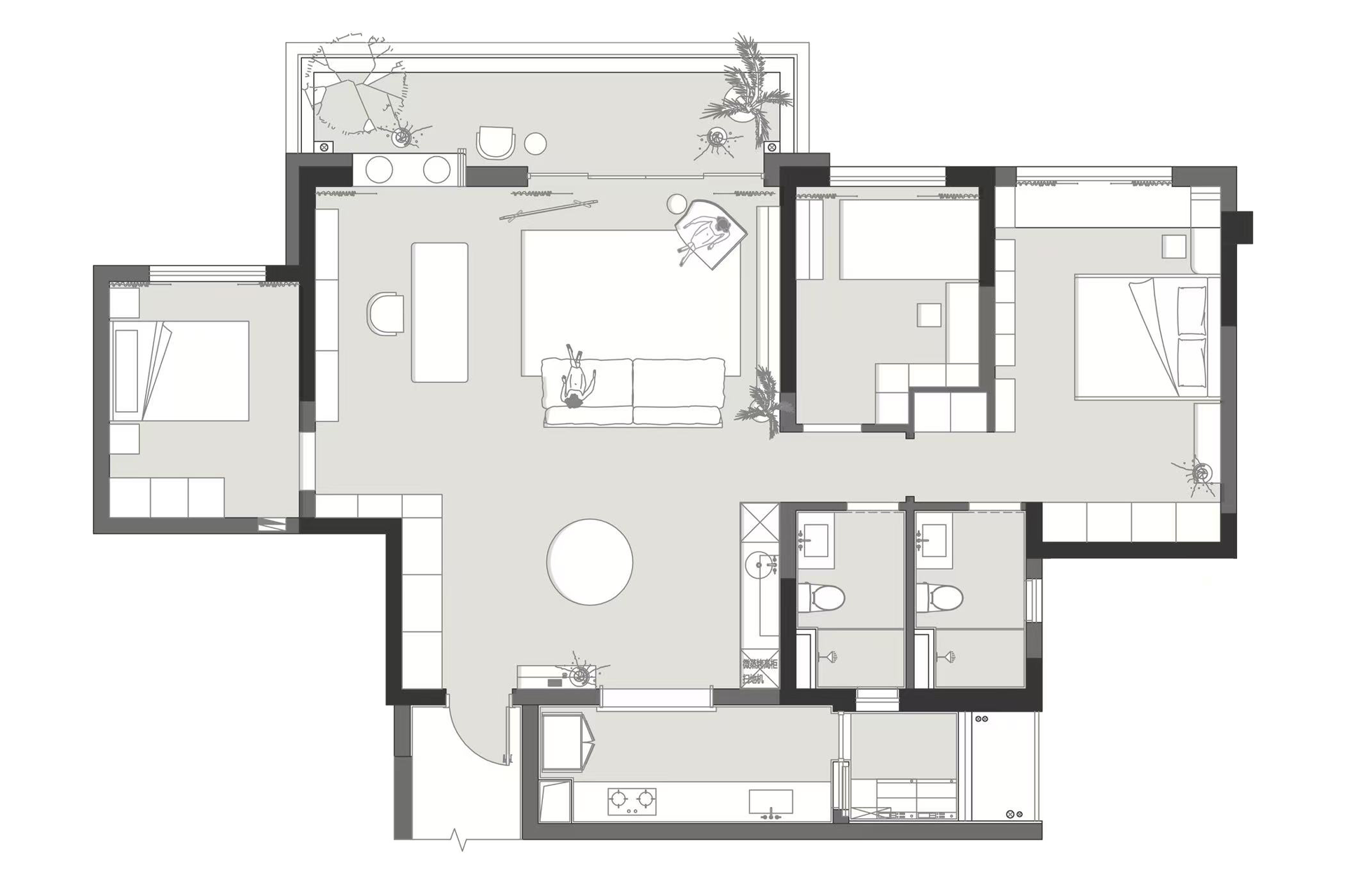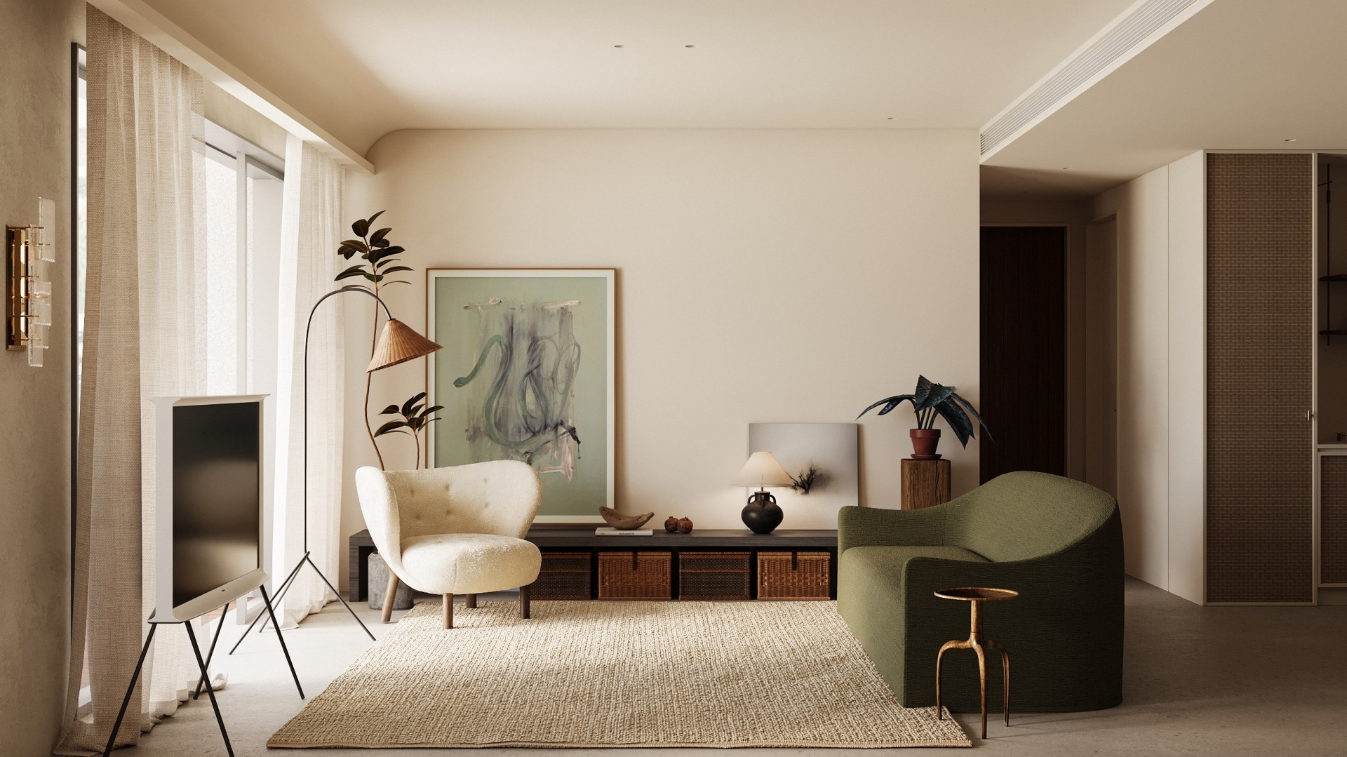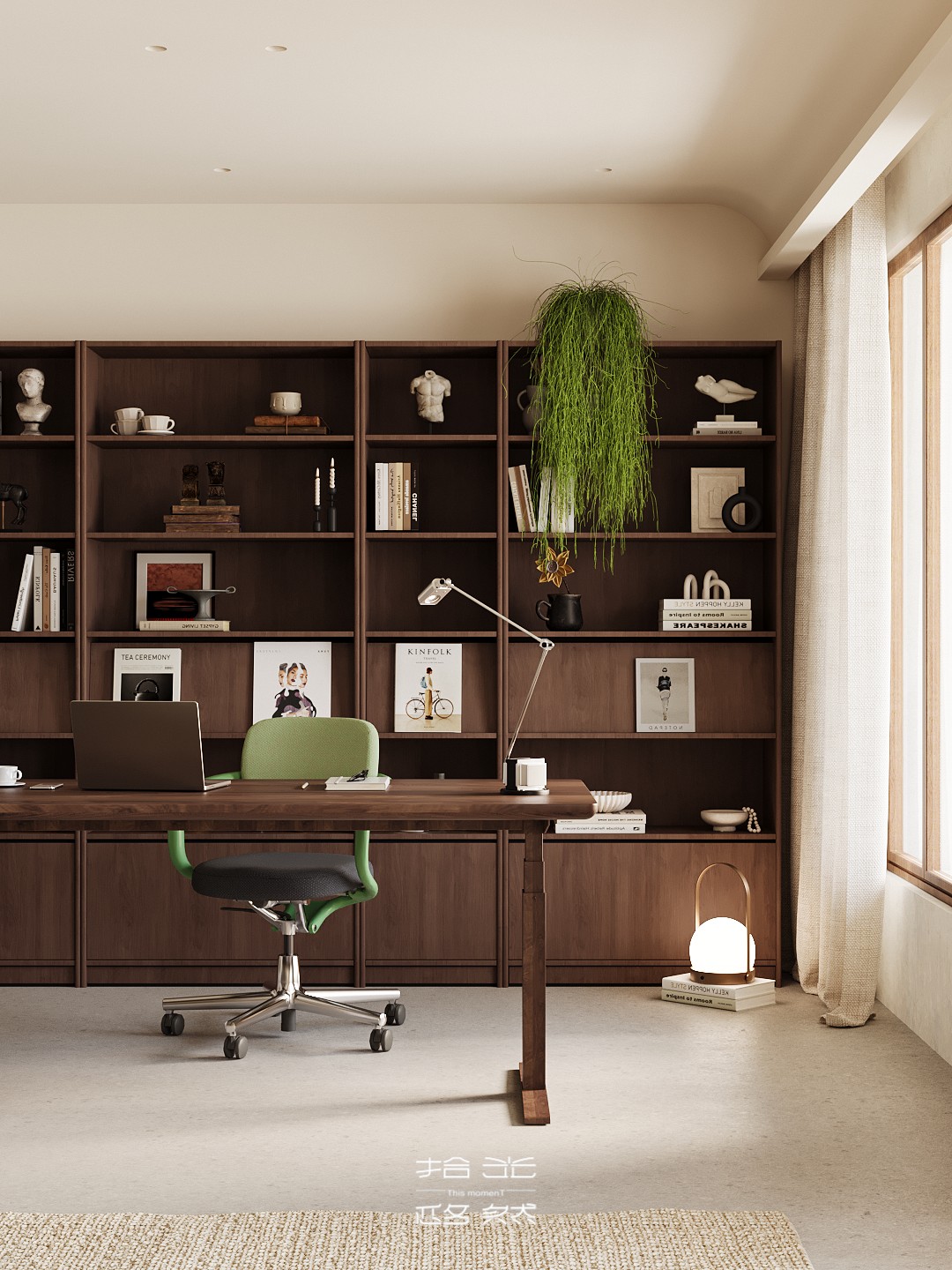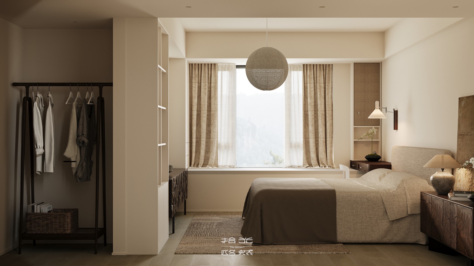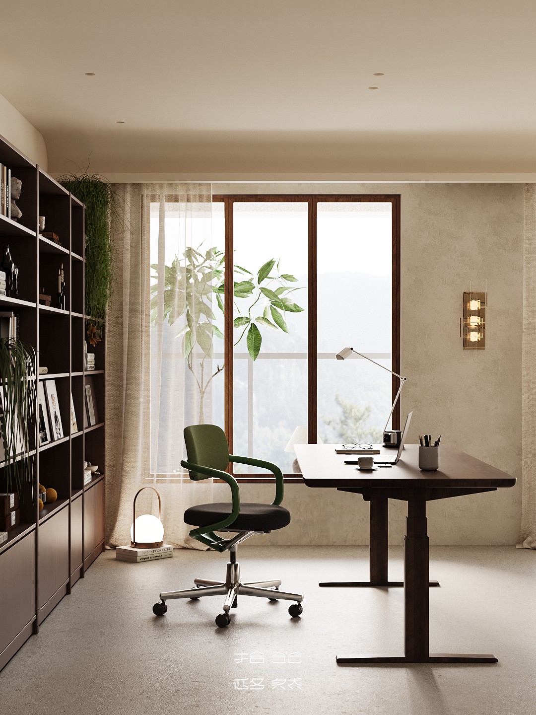 我们将“自然浸润生活”作为核心表达,家便成了能让人彻底松弛的精神场域。在这套142㎡的精装房中,我们试图让自然的肌理温润的质感与生活的诗意深度交融。 从客厅里似云朵般柔和的单椅,到卧室中裹挟着草木气息的静谧氛围。从阳台满溢的绿意,到书房里与光影共生的书架,每一处都在消解“设计感”的刻意,还原生活本真 的松弛。 没有冗余的装饰,却处处藏着对自然的呼应:大地色系的铺陈如晨光轻拂,木质与藤编的肌理似林间低语,艺术画作与绿植的搭配更让空间呼吸感十足。 餐厨区造型独特的餐桌、卧室简约柔和的床具、书房通透有序的布局……