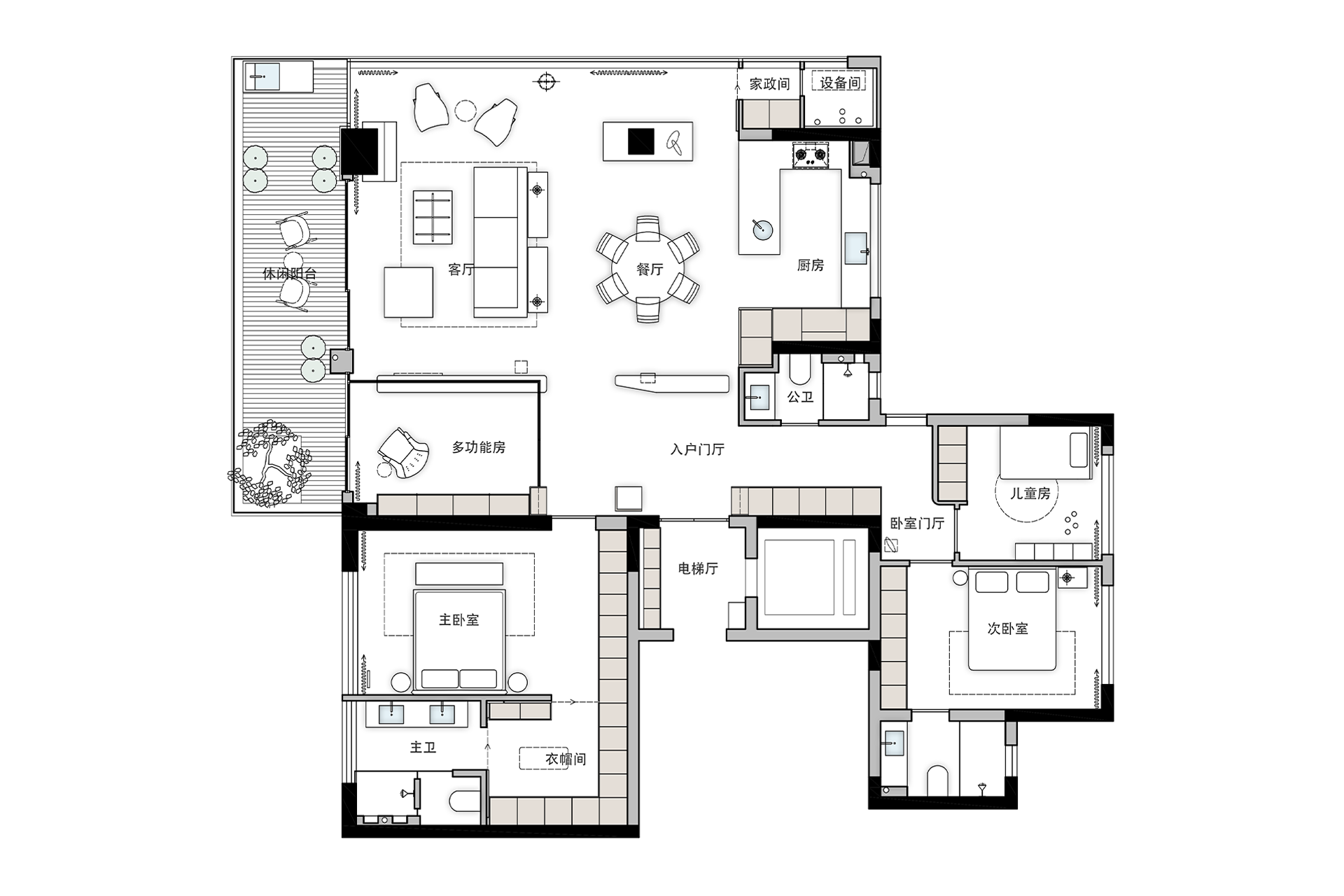 家,从来不是冰冷的建筑容器,而是承载生活温度与情感的空间。 本案设计始于对原始户型的深度解读 —— 直面入户无玄关、公卫局促的痛点,同时最大化激活 270° 阳台的核心优势,以 “通透联动、自然共生” 为核心逻辑,重构空间与生活的关系。 我们摒弃生硬的隔断与冗余的造型,用 “半通透墙体”“格栅屏风” 消解空间边界,让光线与视线自由穿梭;以阳台分区规划、功能空间延展等策略,平衡实用需求与体验感;更在细节处融入人文关怀,从主卧的收纳优化到次卧的隐私缓冲,每一处调整都贴合居者的日常节奏。 最终,让空间不仅满足居住功能,更能成为连接人与自然、承载家庭温情的理想栖居地。