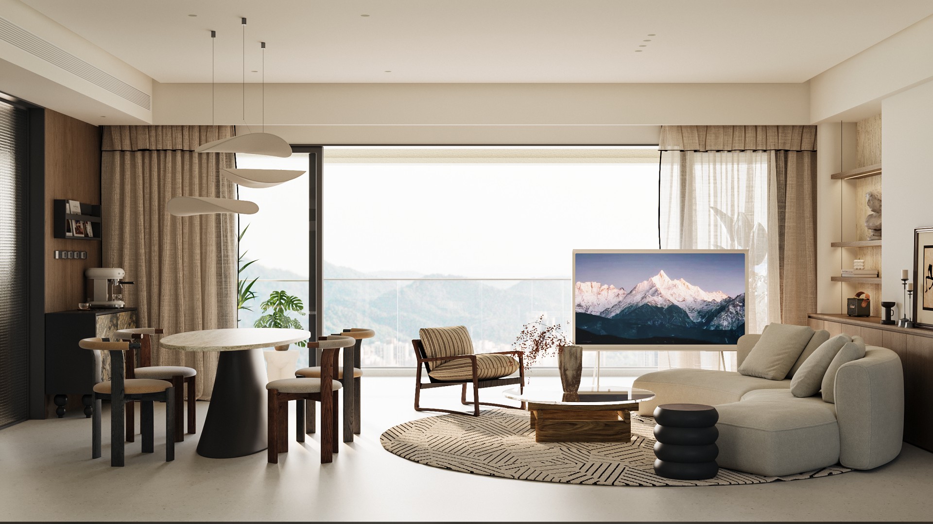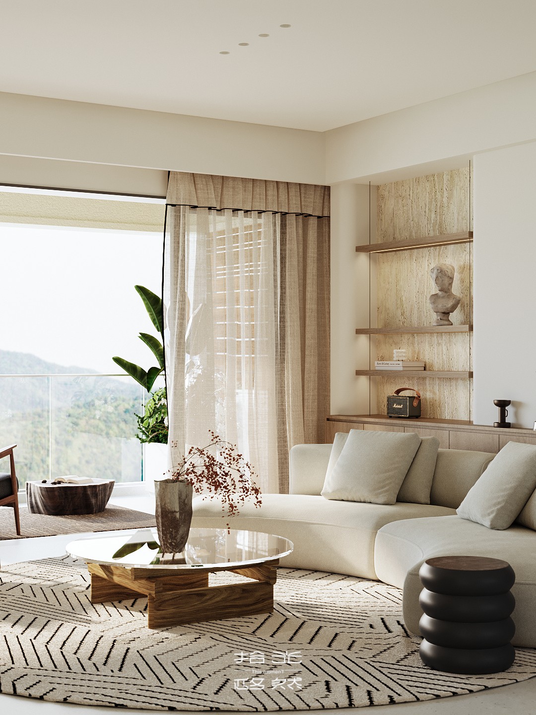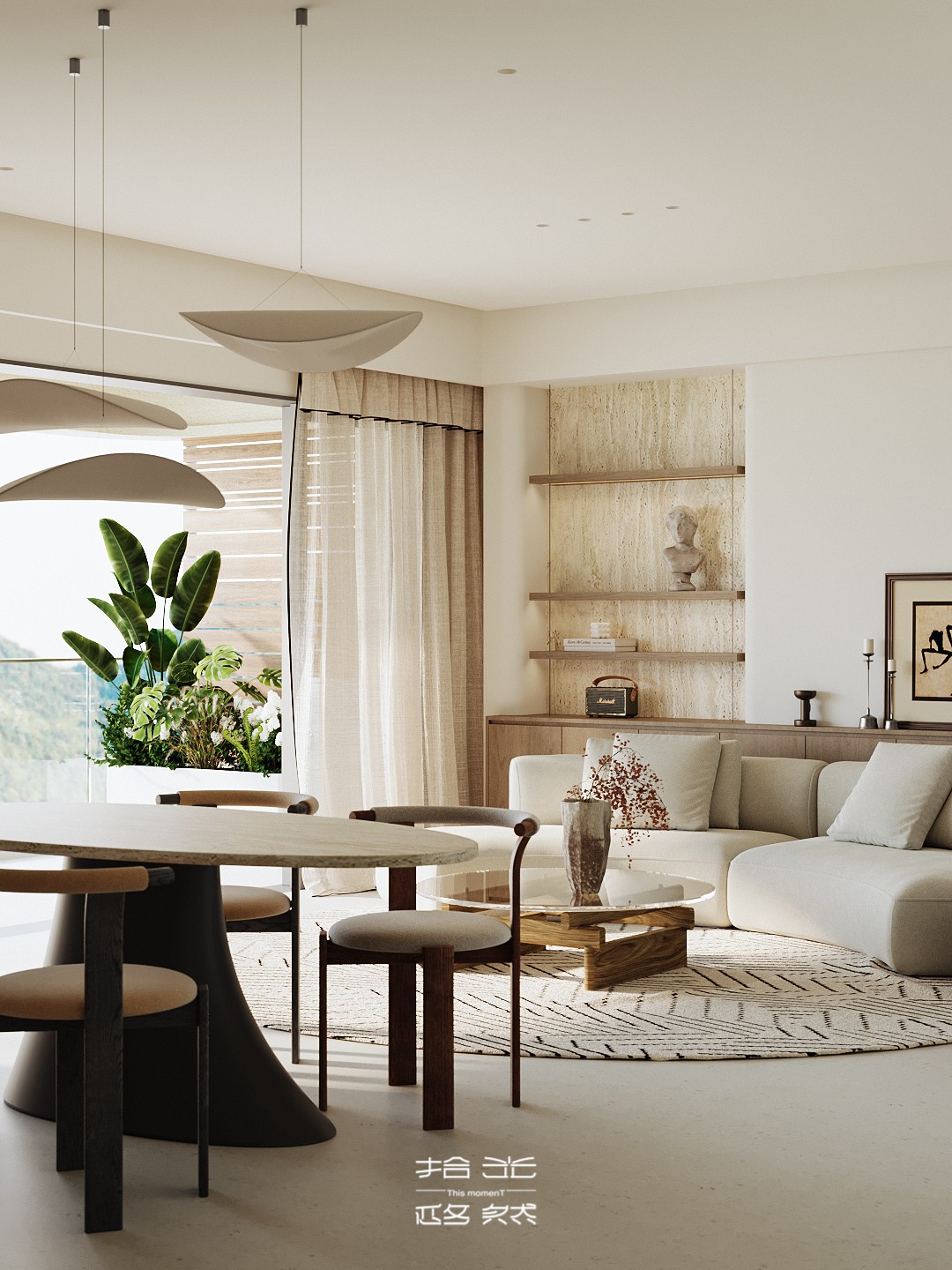 本案以现代简约为基底,融合简素美学的脉络,用质朴材质与利落线条,在空间里铺陈“去繁就简,向美而生”的居住哲学。 浅米色墙面与微水泥地面铺陈温润底色。异形餐桌搭配原木餐椅,纱帘轻掩时,室内外朦胧交融,让用餐、休憩都成了与自然对话的日常。 沙发区用弧线造型柔化空间,藤编单椅、玻璃茶几混搭,角落绿植花池呼应,每一处细节都在诉说“不刻意的精致”。