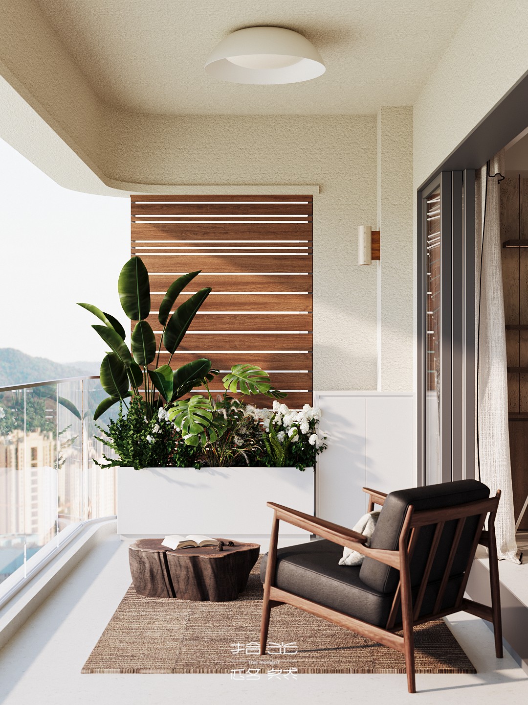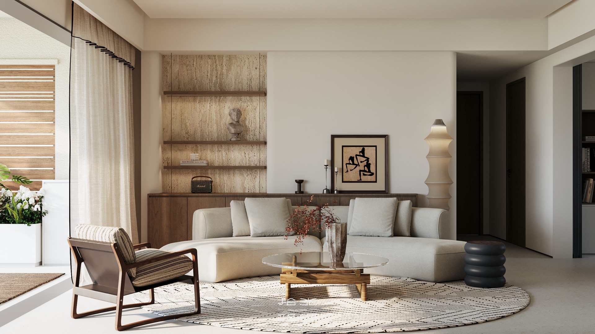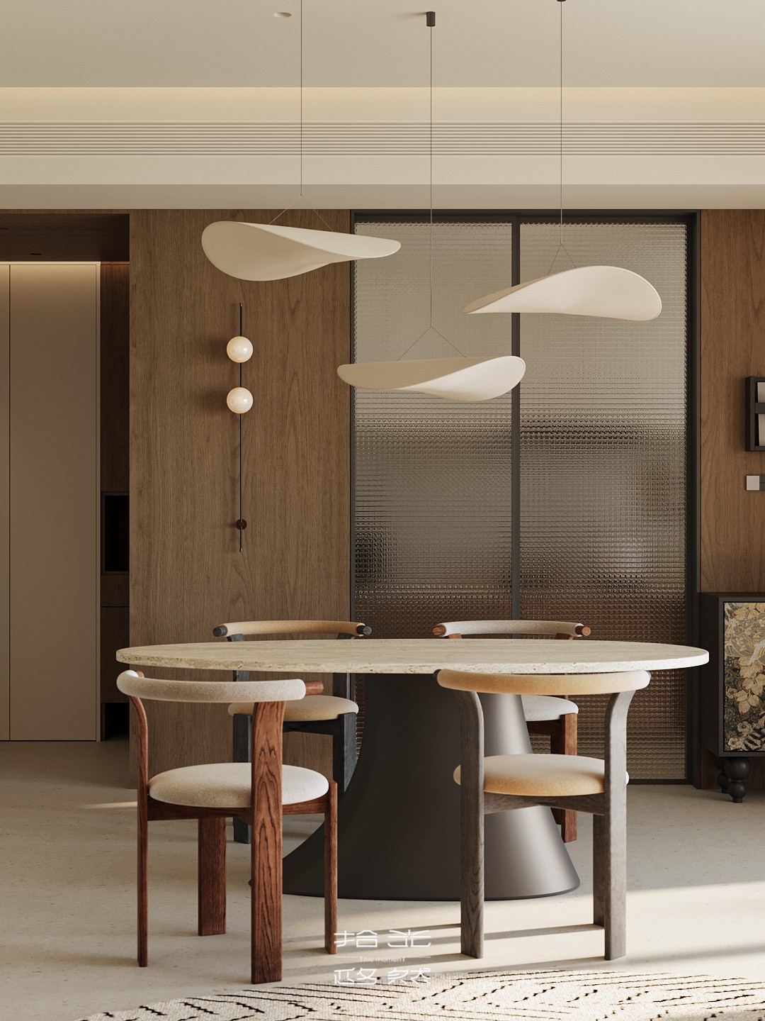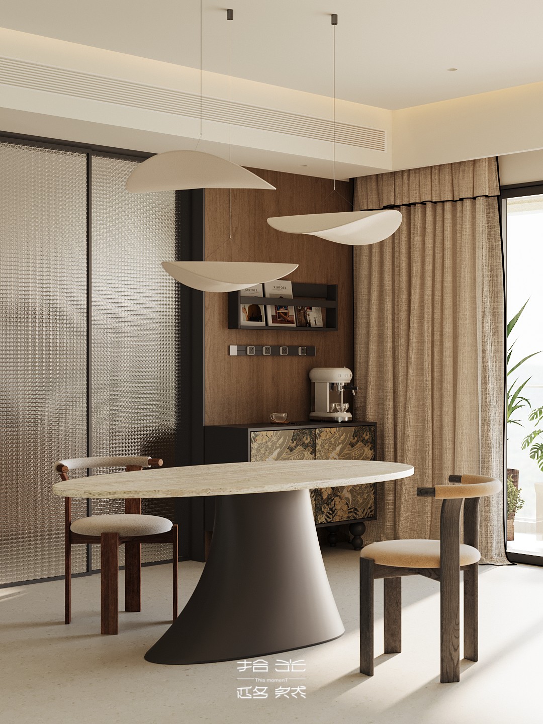 本案以现代简约为基底,融合简素美学的脉络,用质朴材质与利落线条,在空间里铺陈“去繁就简,向美而生”的居住哲学。 浅米色墙面与微水泥地面铺陈温润底色。异形餐桌搭配原木餐椅,纱帘轻掩时,室内外朦胧交融,让用餐、休憩都成了与自然对话的日常。 沙发区用弧线造型柔化空间,藤编单椅、玻璃茶几混搭,角落绿植花池呼应,每一处细节都在诉说“不刻意的精致”。