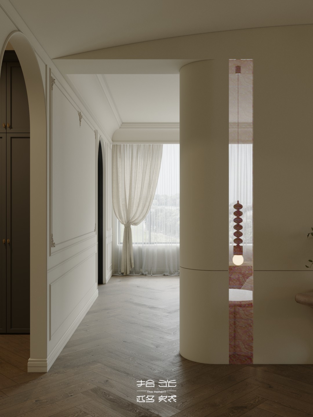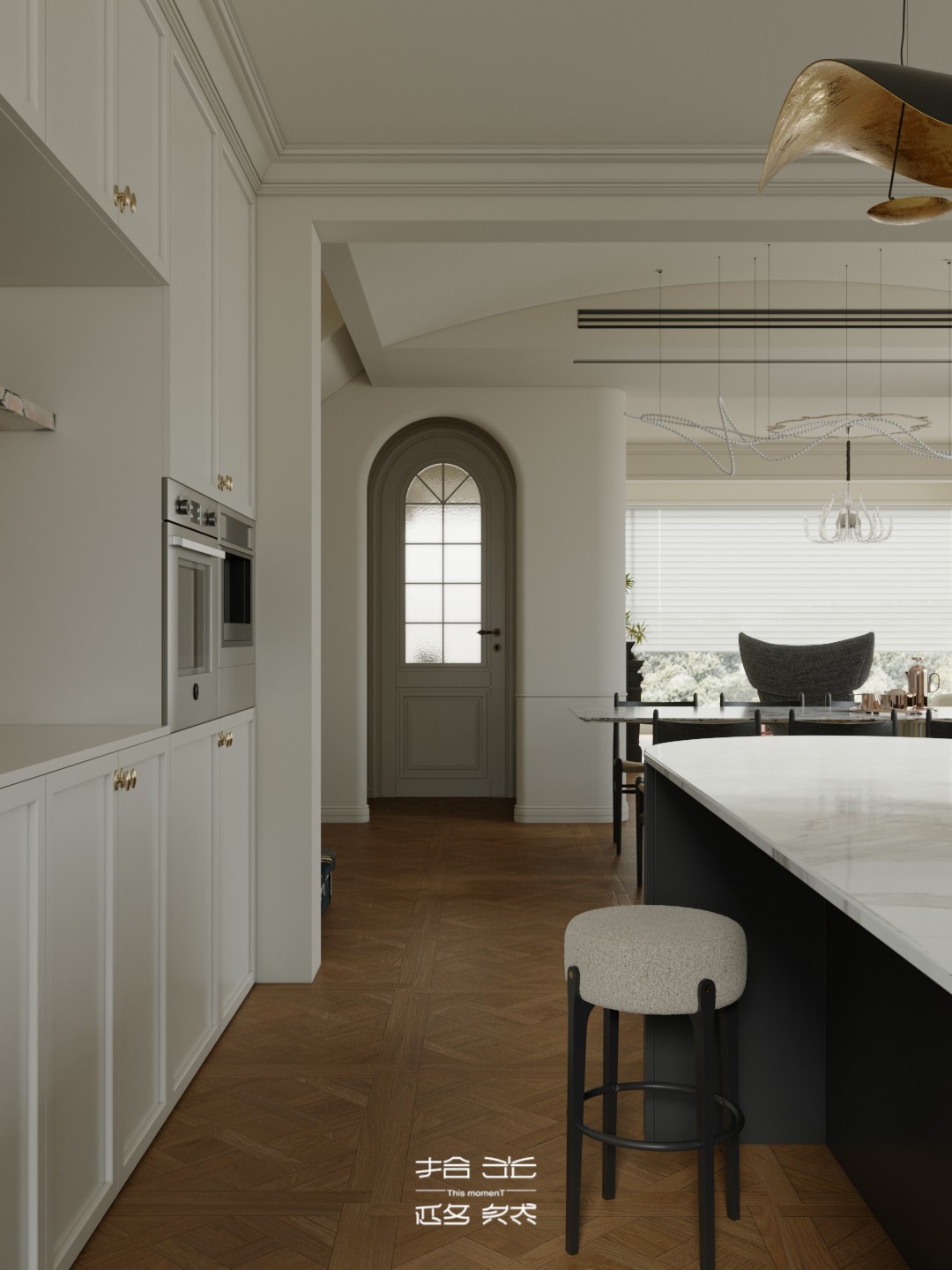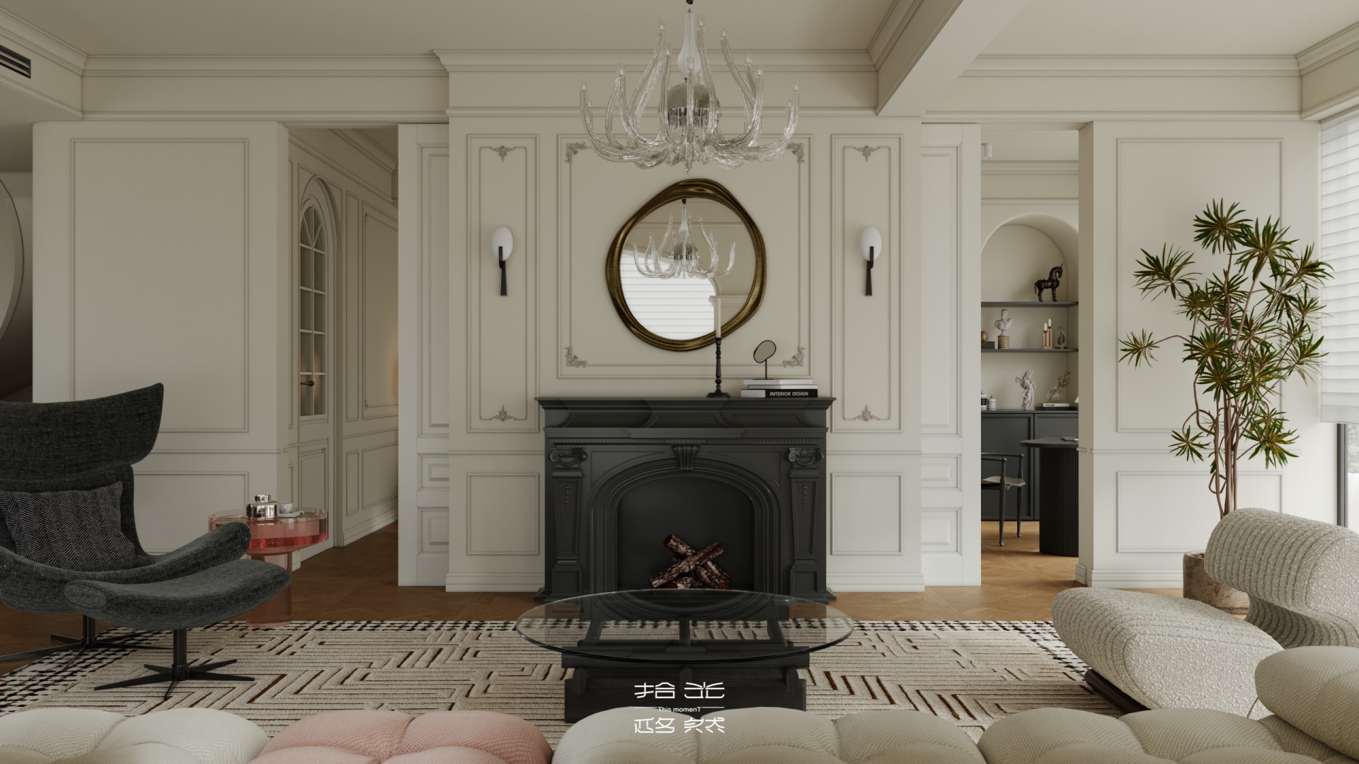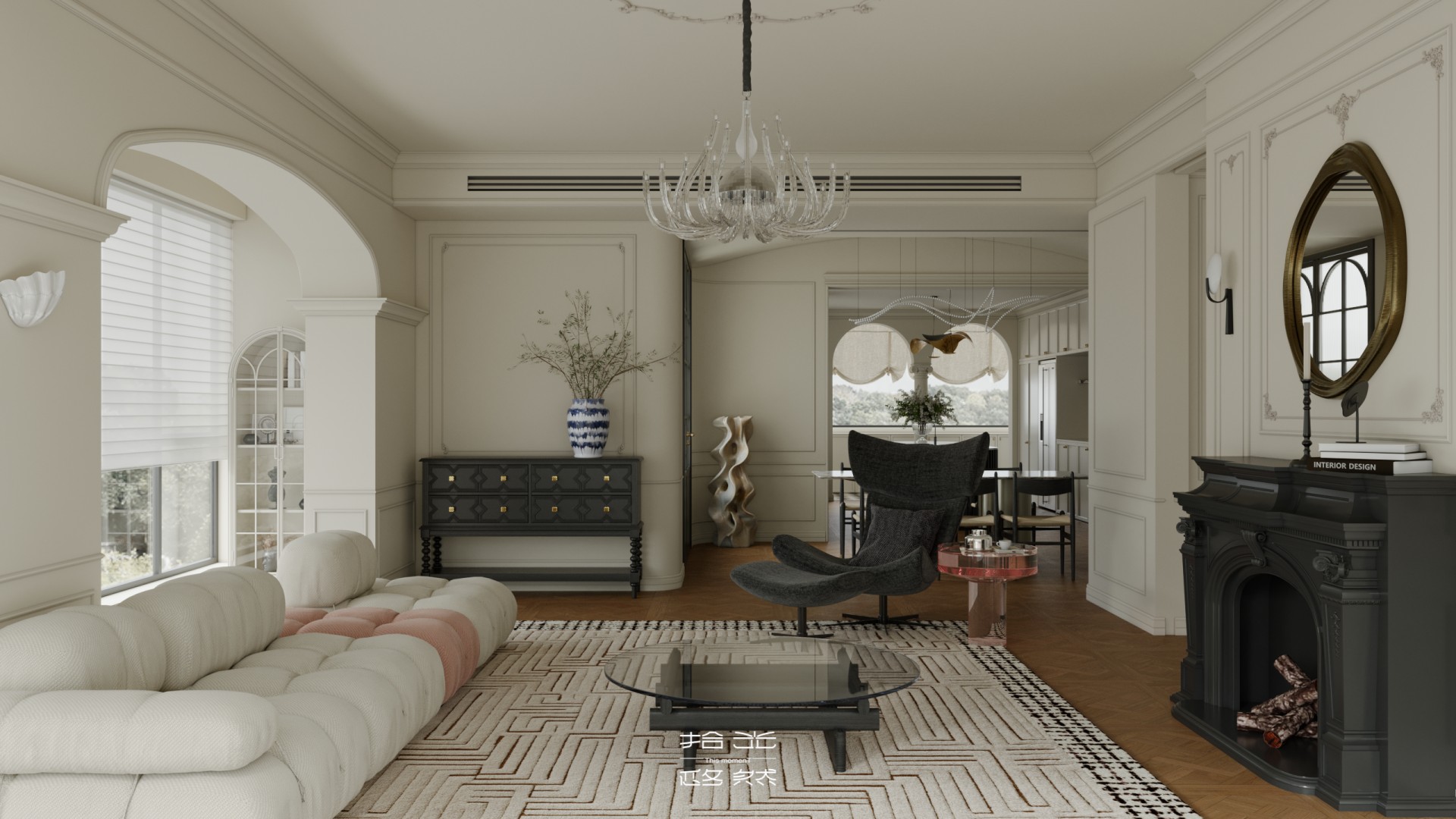 一场关于 “空间层次解构与艺术基因赋能” 的设计革命正式启幕。本案以 “法式新古典的优雅骨架承载现代艺术的先锋灵魂” 为核心叙事,针对跃层空间的结构特性与高净值业主的审美追求,将毛坯基底重塑为分层而联动、复古且先锋的沉浸式生活容器。 我们借由法式拱券、石膏雕花的经典形制搭建跃层的空间秩序,以现代艺术的抽象材质、异形表达打破层与层的视觉边界 —— 在东原印江山的跃层语境中,人字拼木地板的复古肌理与粉色大理石的艺术张力碰撞出层次,法式壁炉的仪式感与玻璃枝形灯的空灵感交织出韵律,抽象雕塑与先锋软装将上下两层转化为 “可感知的艺术叙事场”……