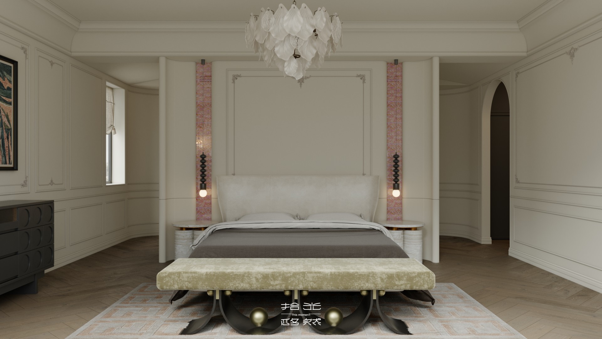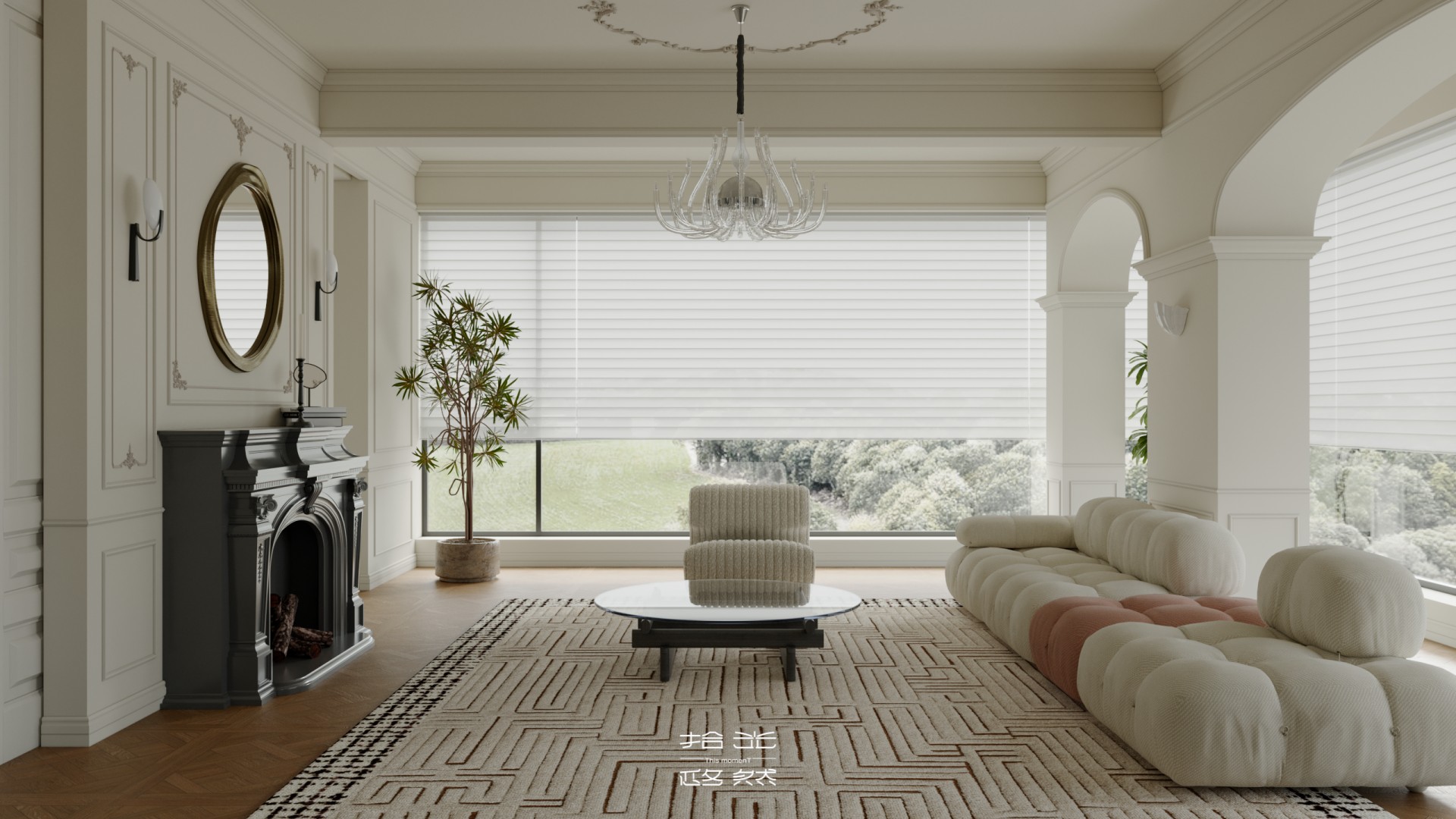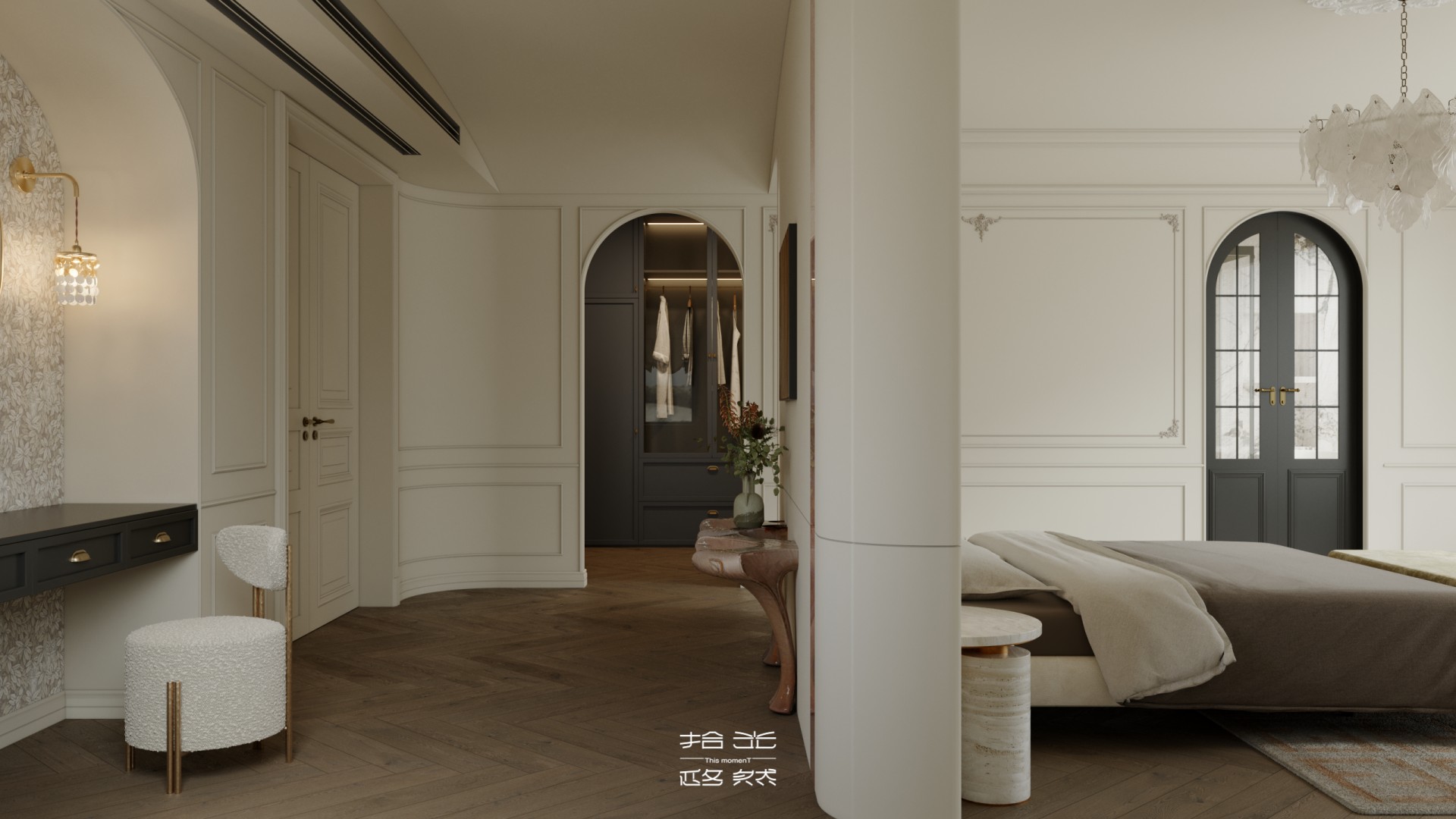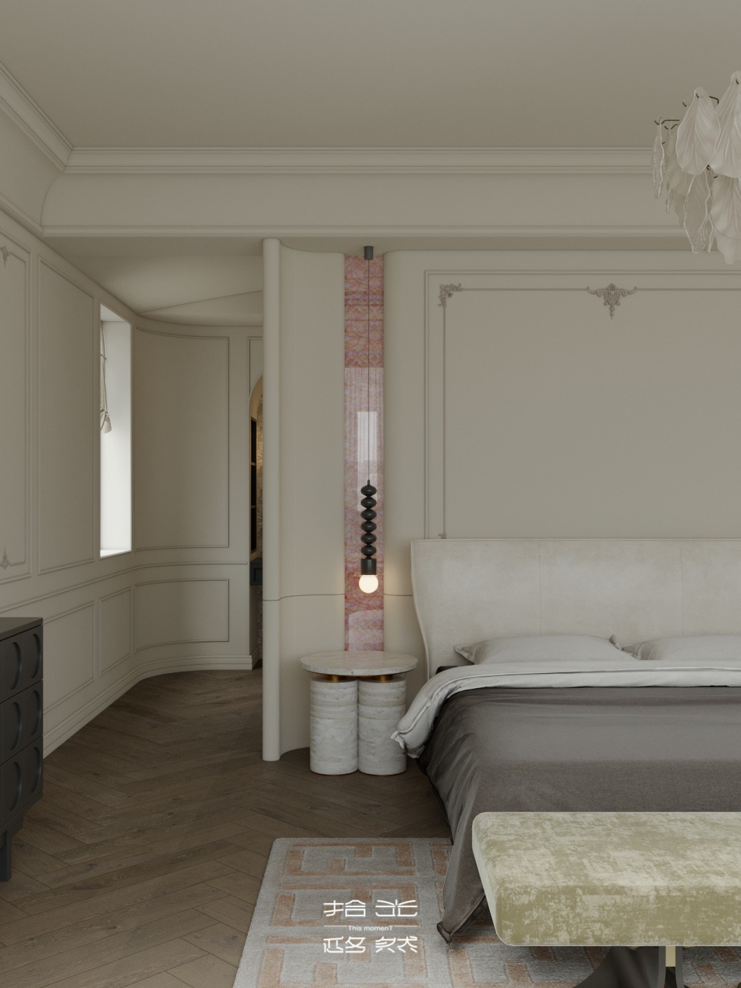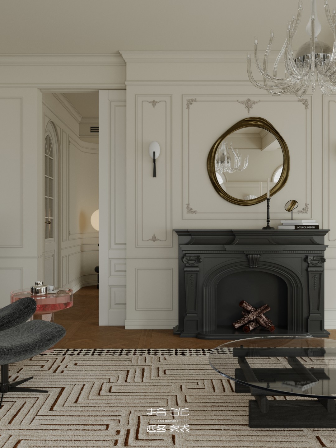 一场关于 “空间层次解构与艺术基因赋能” 的设计革命正式启幕。本案以 “法式新古典的优雅骨架承载现代艺术的先锋灵魂” 为核心叙事,针对跃层空间的结构特性与高净值业主的审美追求,将毛坯基底重塑为分层而联动、复古且先锋的沉浸式生活容器。 我们借由法式拱券、石膏雕花的经典形制搭建跃层的空间秩序,以现代艺术的抽象材质、异形表达打破层与层的视觉边界 —— 在东原印江山的跃层语境中,人字拼木地板的复古肌理与粉色大理石的艺术张力碰撞出层次,法式壁炉的仪式感与玻璃枝形灯的空灵感交织出韵律,抽象雕塑与先锋软装将上下两层转化为 “可感知的艺术叙事场”……