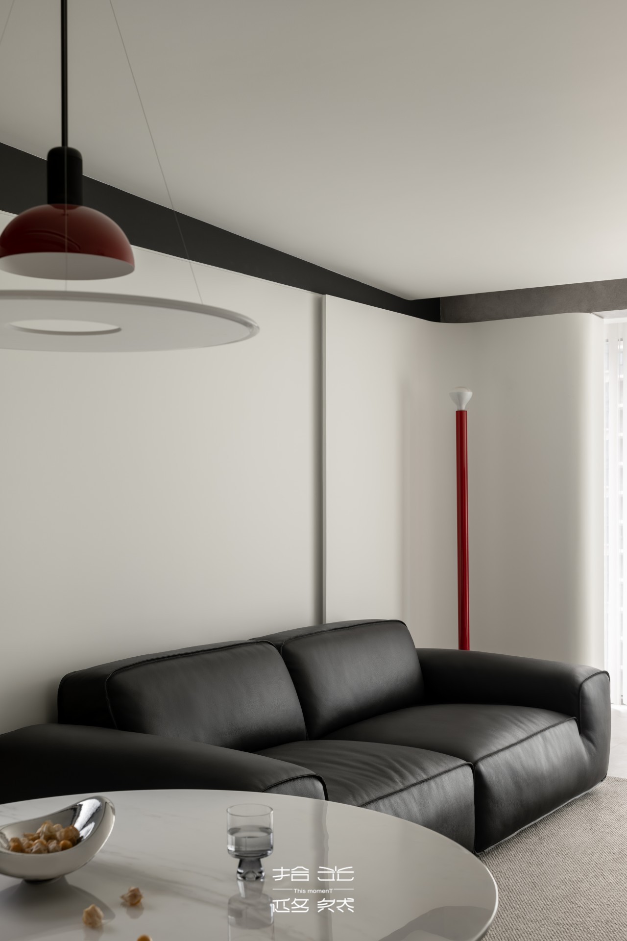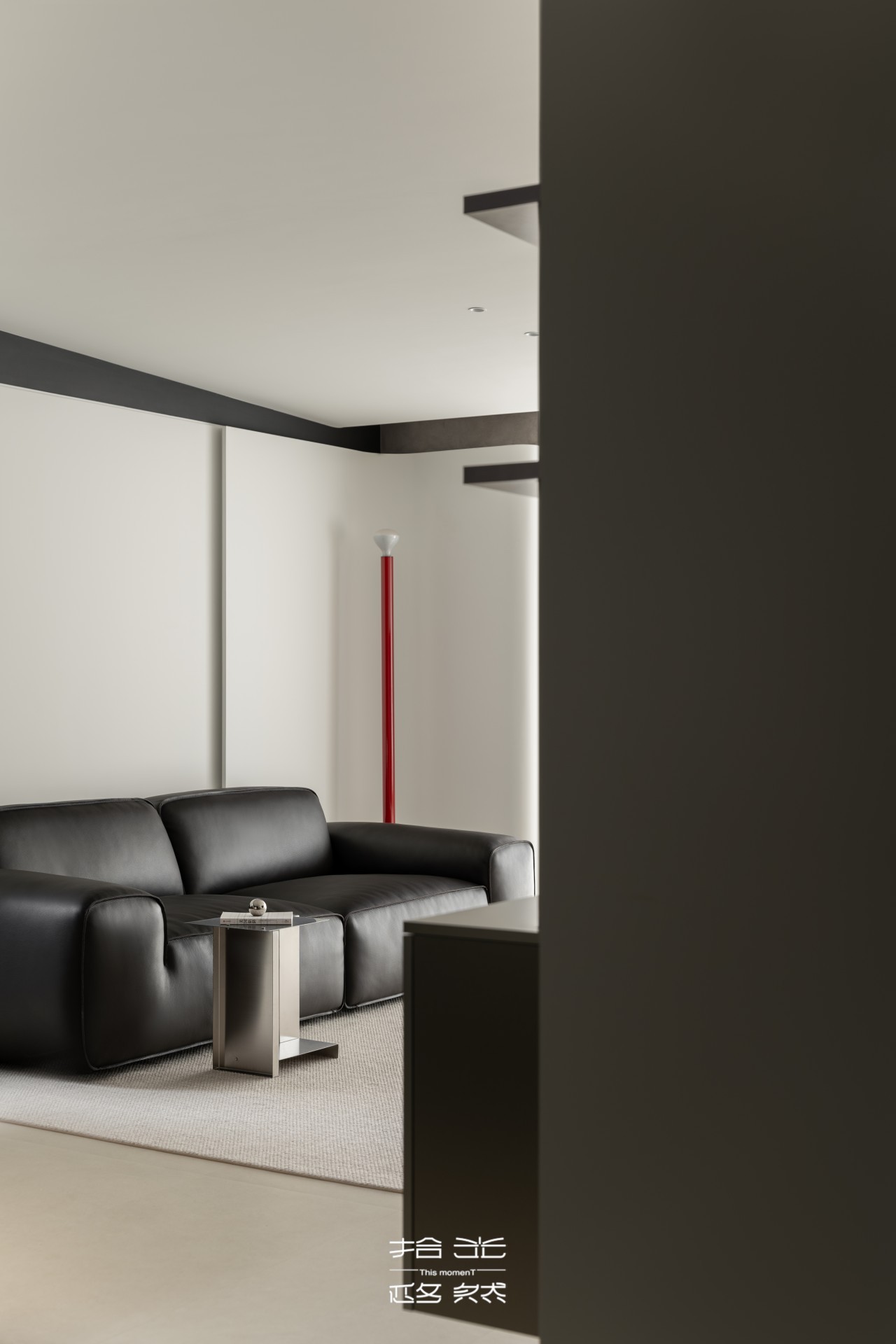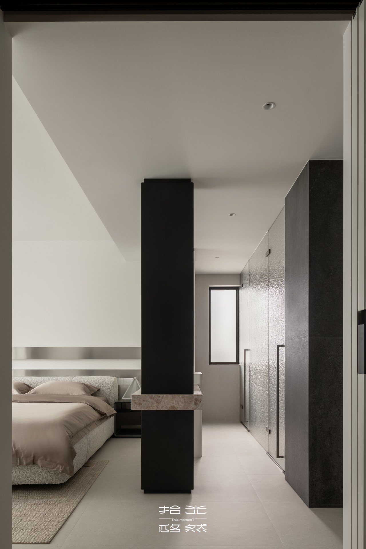 顶面设计更是点睛之笔:斜顶造型搭配艺术涂料的过梁与装饰带,让顶面体块错落咬合,却又巧妙留空,既强化了现代感,也把极简主义的“少即是多”藏进了细节里。
