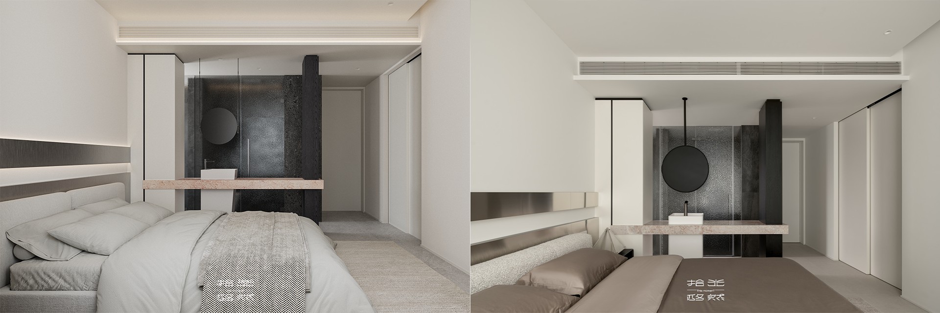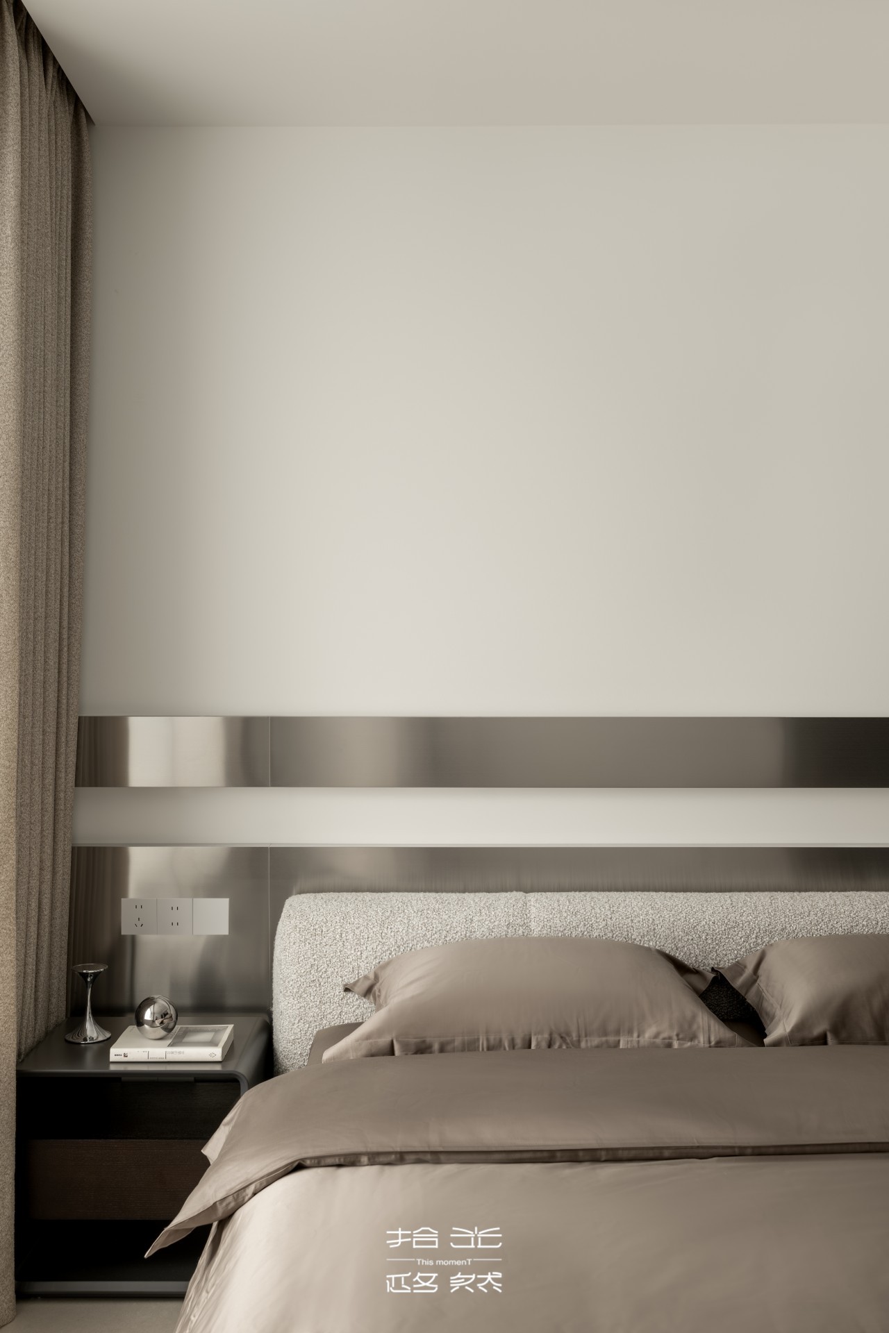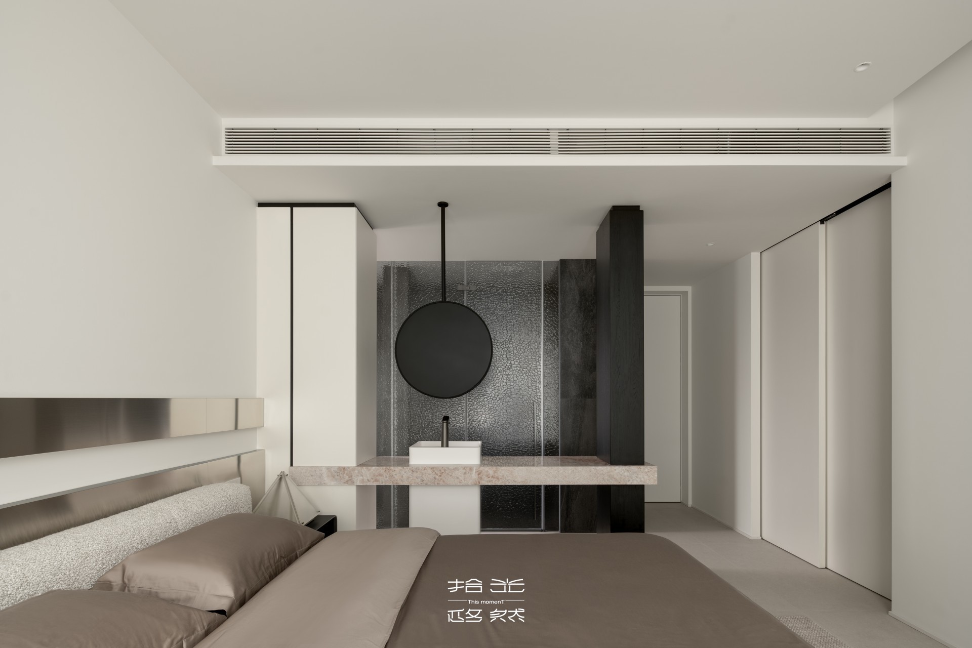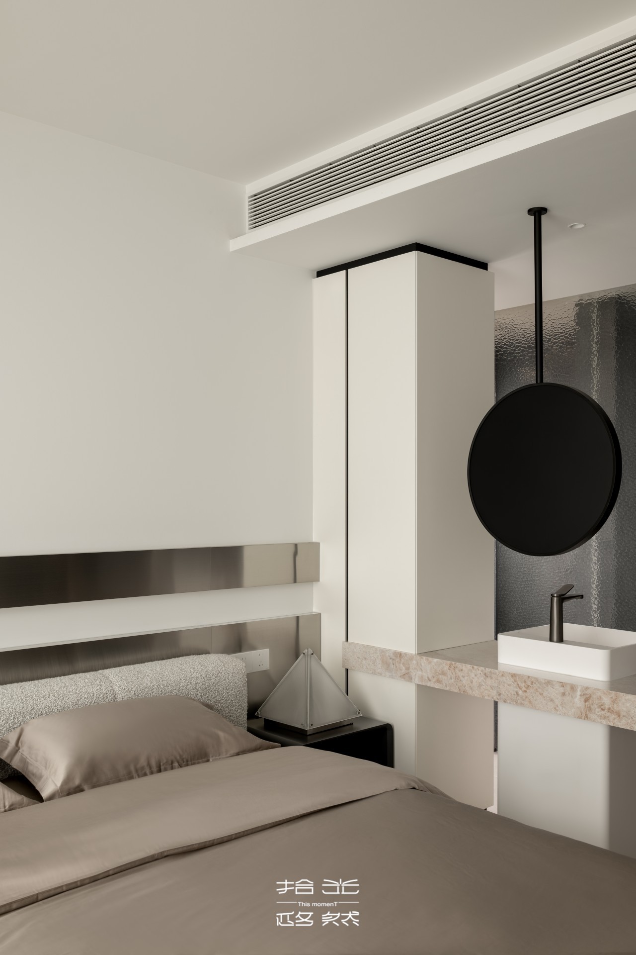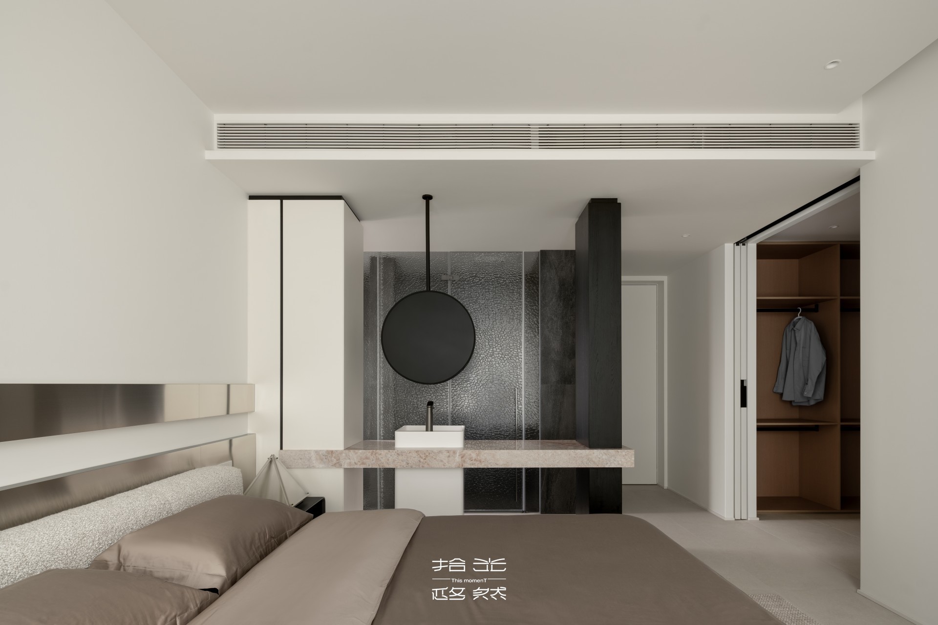 主卧套间涵盖寝居、衣帽间与三分离主卫,每一处都藏着对品质生活的追求。寝居空间的床头金属装饰,冷静干练的质感提升了空间现代感,既避免了过多装饰的繁琐,又在细节处彰显精致。