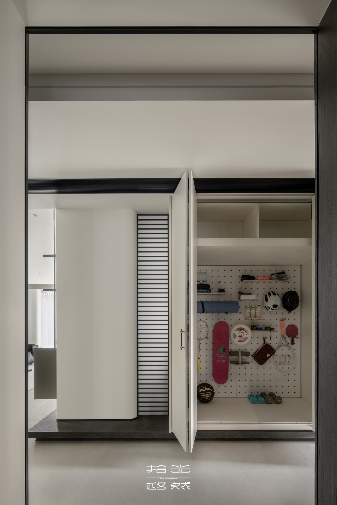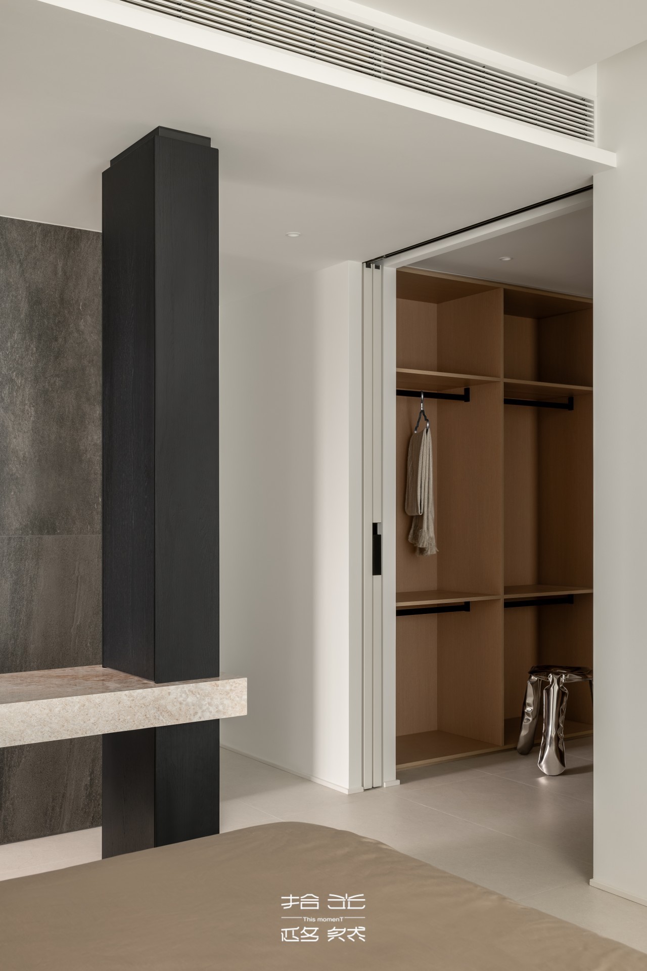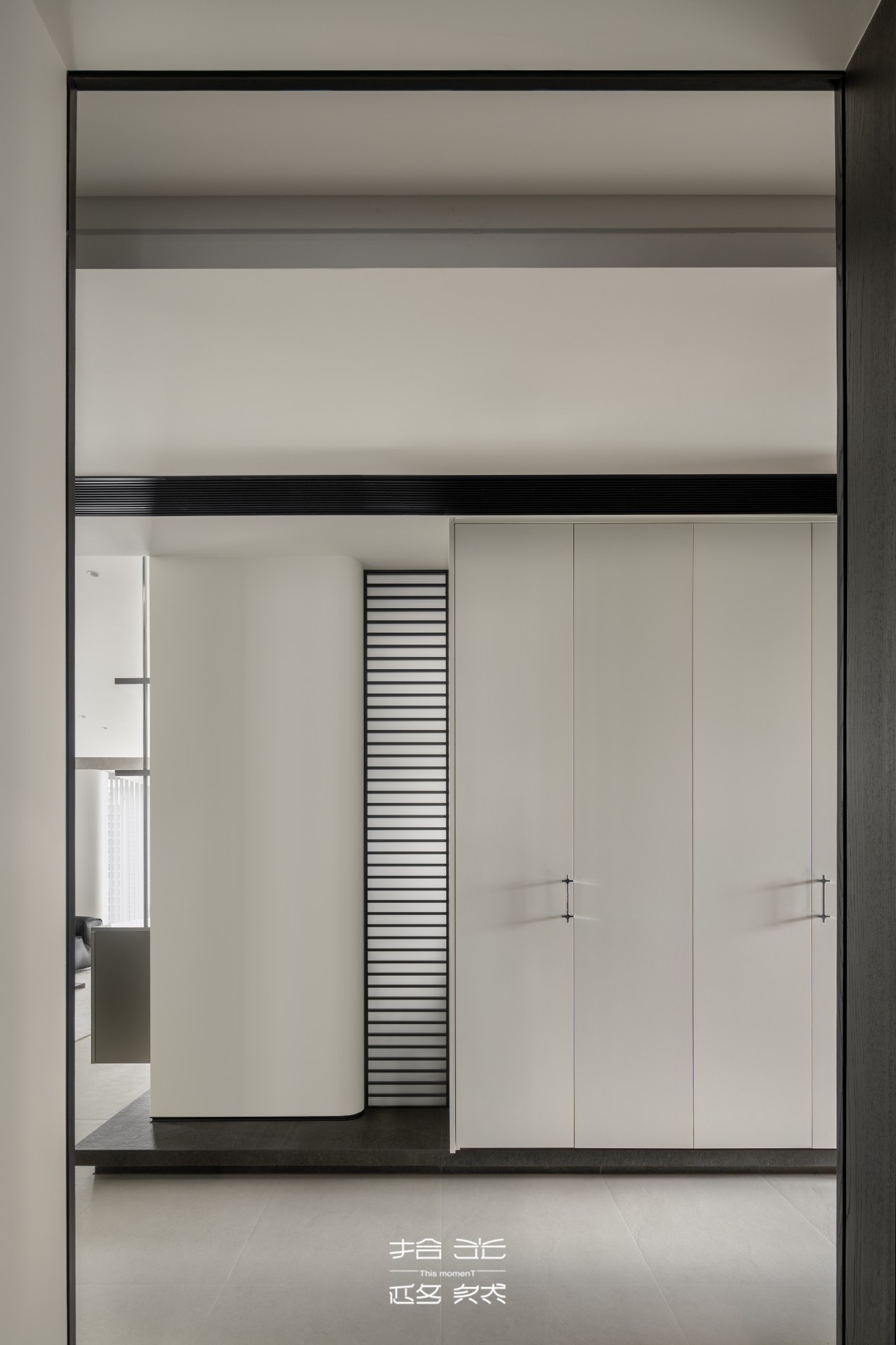 实用主义从未缺席。我们重新规划走廊尽头空间,调整衣帽间布局腾出区域,定制了一组多功能收纳柜体。柜体分区明确,既能挂放当季外套,又能收纳钥匙、包包等日常小物件,完美契合屋主随手取放的习惯,让玄关在颜值与功能间达成奇妙平衡。