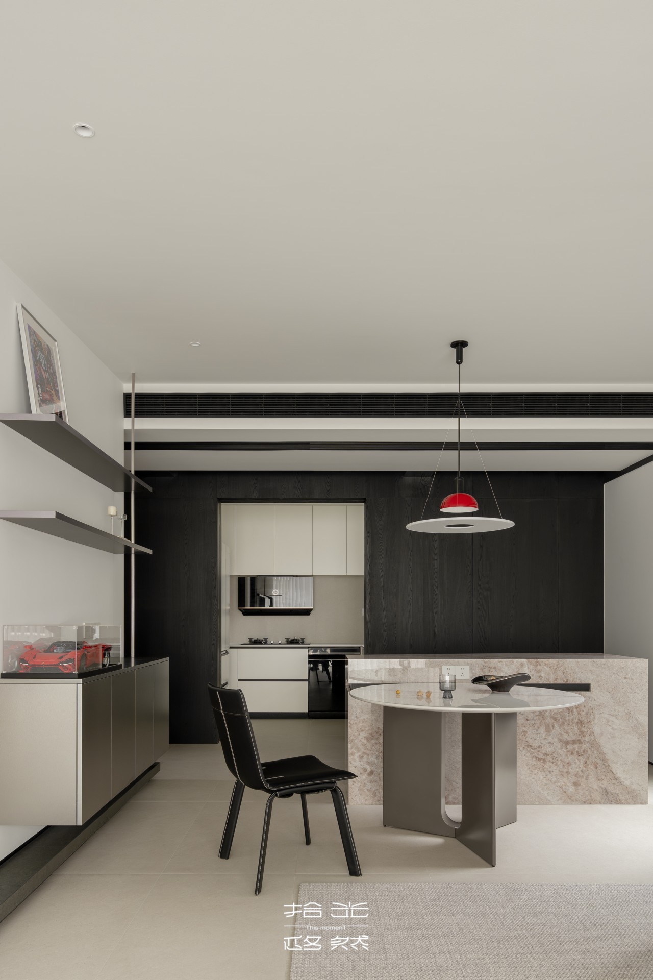 考虑到屋主两人日常做饭频率较低,我们在餐厨之间设计了口袋门,让空间状态随需求切换。开放时,餐厨动线流畅无阻,拿取饮品、零食转身即达,闲聊时的互动感也随之拉满,爆炒产生油烟时,将门推合封闭,油烟被牢牢锁在厨房内,保持整个空间的洁净舒适。这种“灵活切换”的设计,正是对生活细节最贴心的考量。