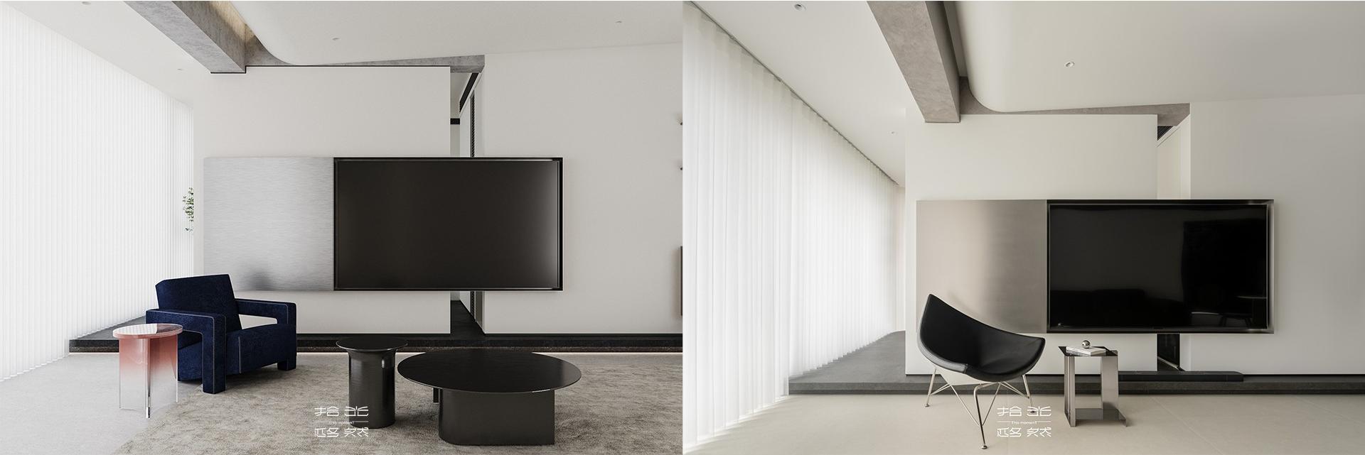 客厅以电视墙为核心,玩转出通透与灵动的空间游戏。我们将承重墙用电视墙整体包裹,弱化墙体的厚重感,再以体块化的极简造型让电视墙成为视觉焦点,简洁却不简单。