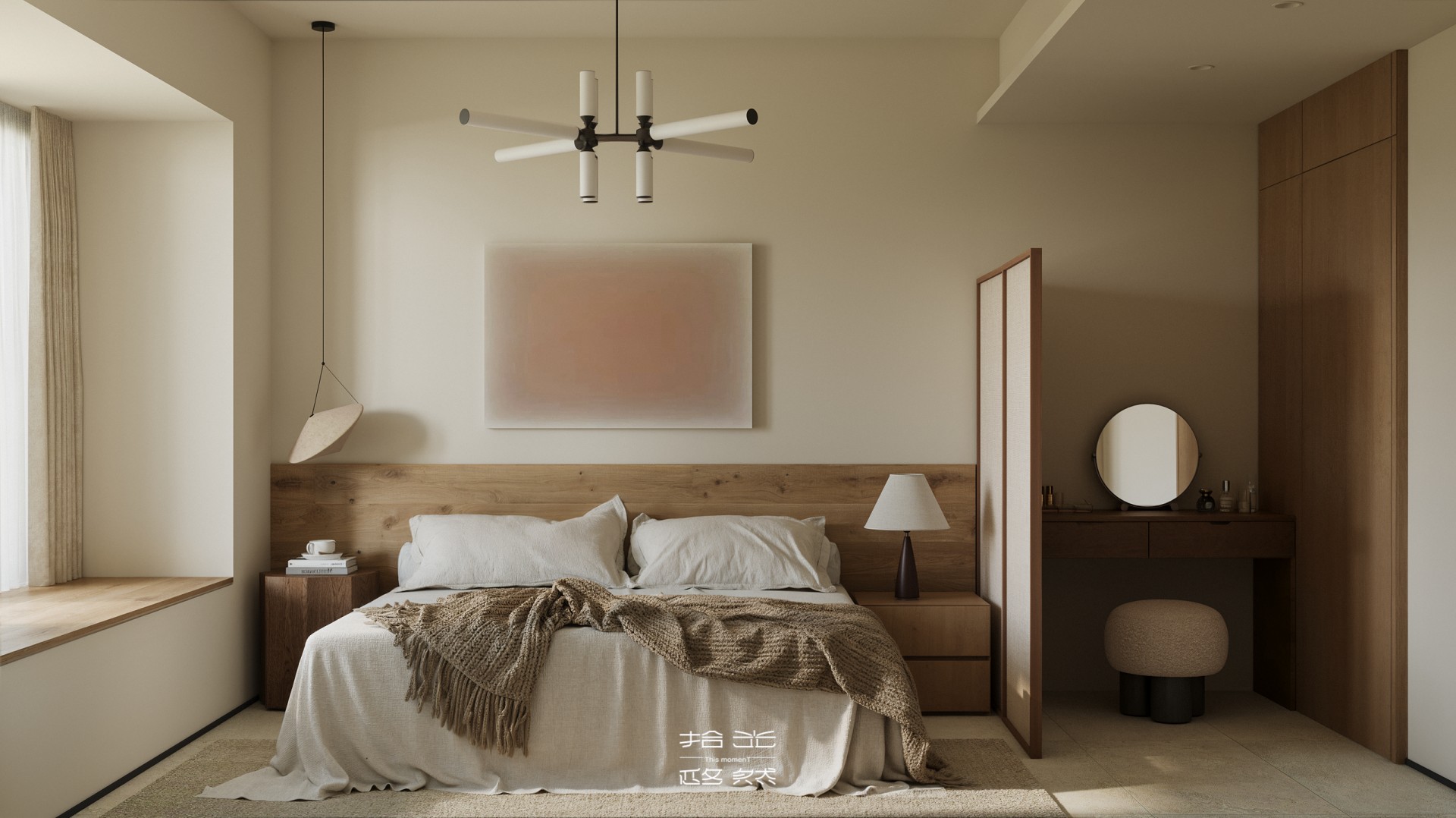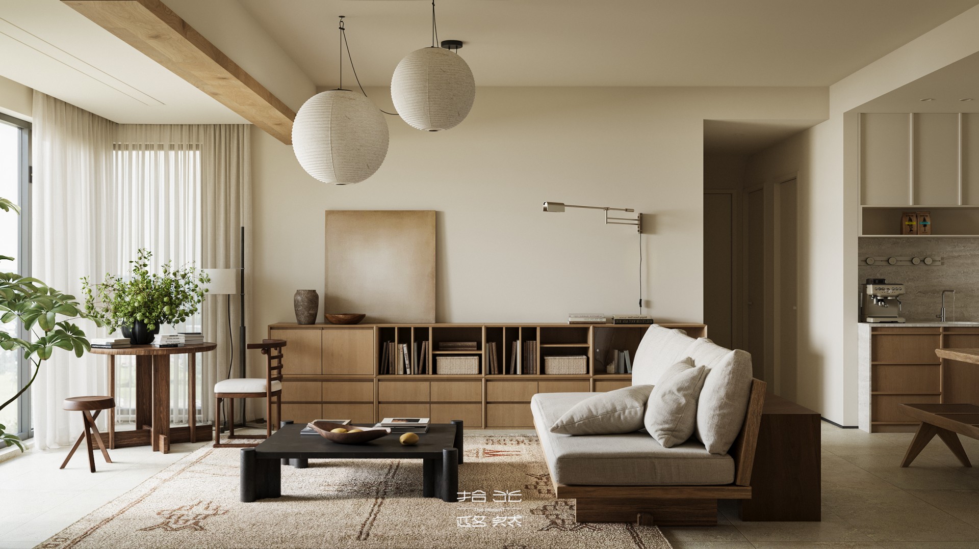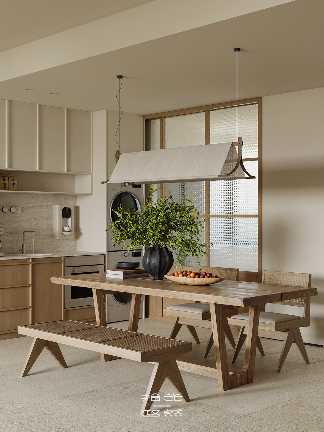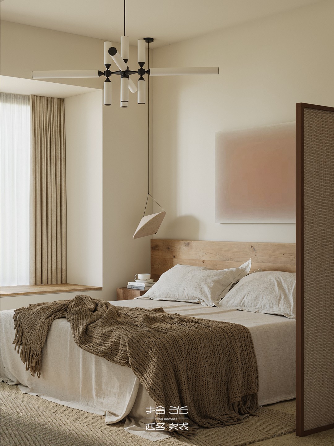 当清晨的柔光穿过纱帘,落在橡木柜的原生肌理上,这间屋子的松弛感便随着光影漫开了。 没有尖锐的线条,也无跳脱的色块 —— 浅米墙面是底色,温润的木作是骨架,棉麻、陶土与绿植则是揉进空间里的 “呼吸感”。客餐厨以通透的动线串联,灯笼吊灯的软光、百叶帘筛下的光斑,让每一处衔接都裹着暖意;卧室用半透屏风轻划边界,床尾的矮柜与窗边的长榻,把 “躺卧”“闲坐” 的日常都安在了温柔里。 它不是刻意雕琢的 “风格样板”,而是把 “舒适” 写进材质与尺度里:木质的温厚承托生活的重量,柔色的软度消解疲惫的棱角,连光影都成了空间的软装 —— 最终,所有设计的巧思,都落进了 “推门即得松弛” 的日常里。