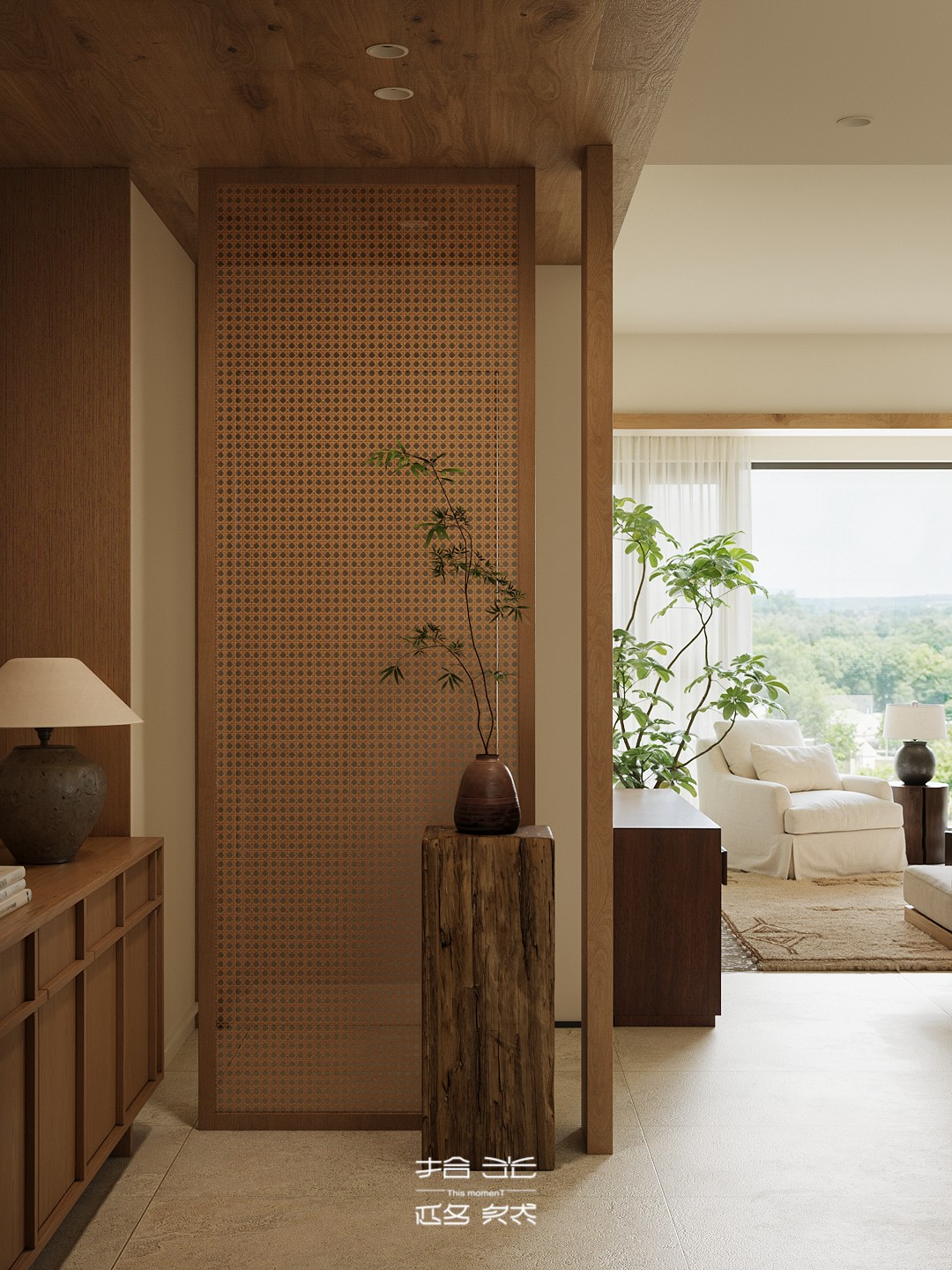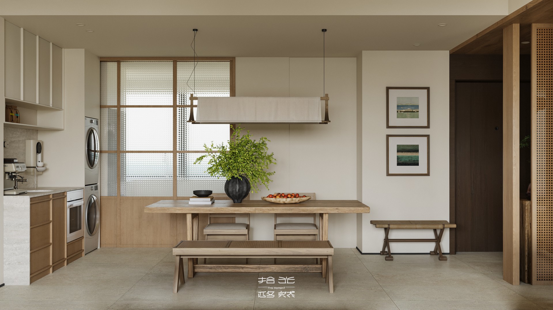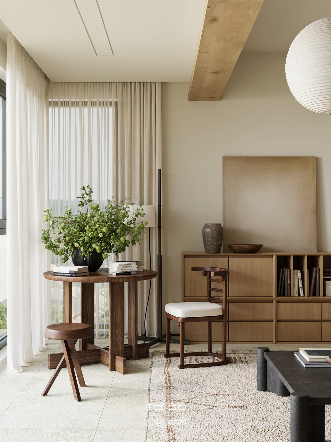 当清晨的柔光穿过纱帘,落在橡木柜的原生肌理上,这间屋子的松弛感便随着光影漫开了。 没有尖锐的线条,也无跳脱的色块 —— 浅米墙面是底色,温润的木作是骨架,棉麻、陶土与绿植则是揉进空间里的 “呼吸感”。客餐厨以通透的动线串联,灯笼吊灯的软光、百叶帘筛下的光斑,让每一处衔接都裹着暖意;卧室用半透屏风轻划边界,床尾的矮柜与窗边的长榻,把 “躺卧”“闲坐” 的日常都安在了温柔里。 它不是刻意雕琢的 “风格样板”,而是把 “舒适” 写进材质与尺度里:木质的温厚承托生活的重量,柔色的软度消解疲惫的棱角,连光影都成了空间的软装 —— 最终,所有设计的巧思,都落进了 “推门即得松弛” 的日常里。