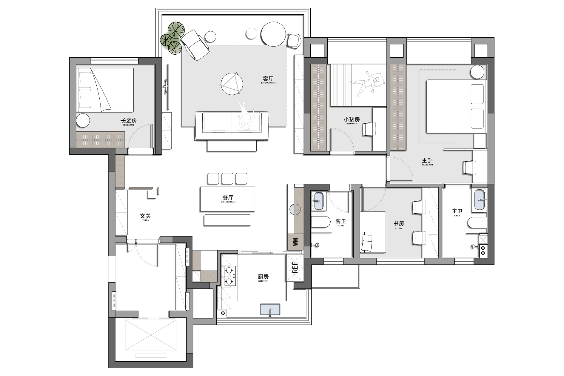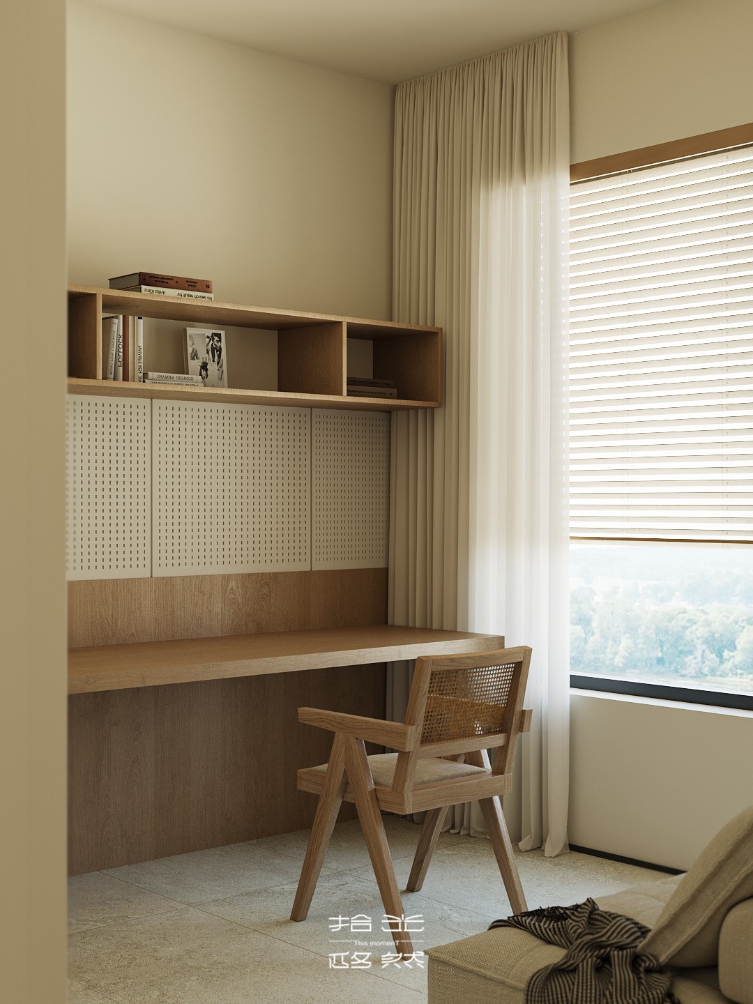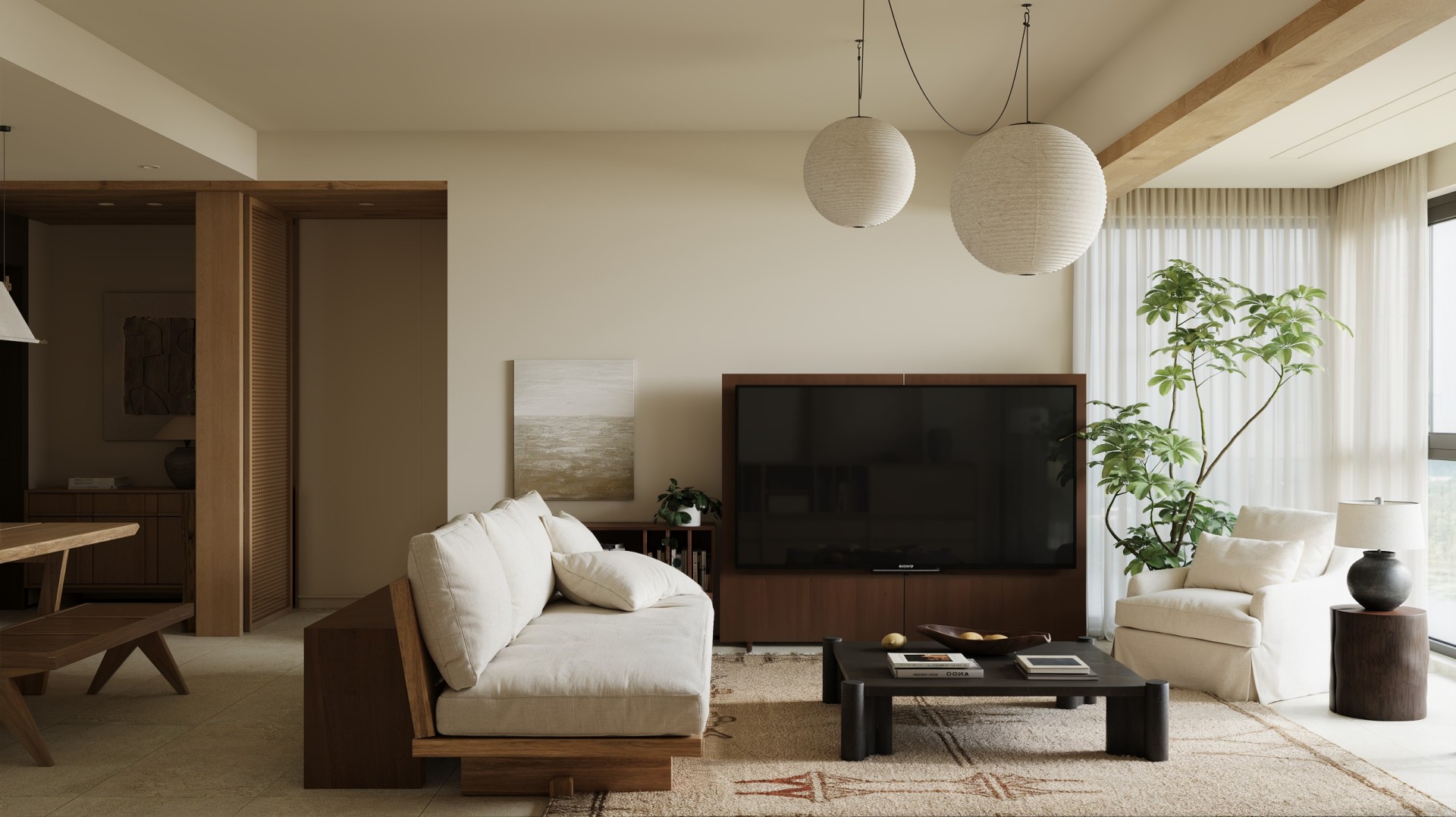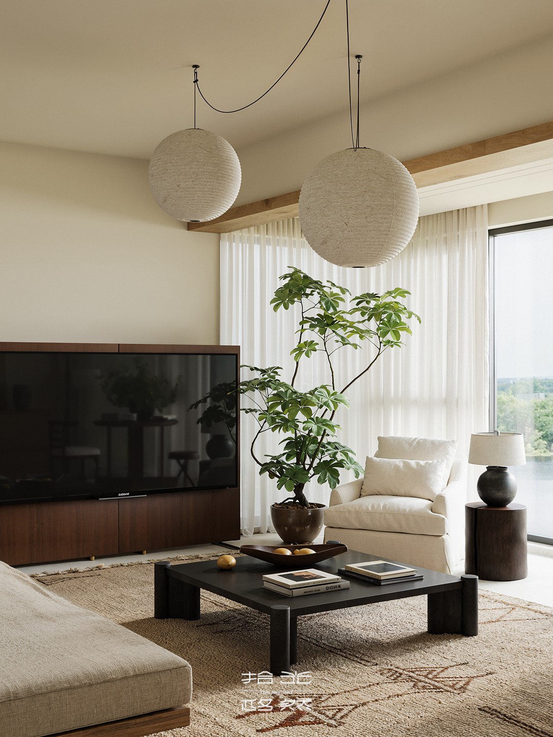 当清晨的柔光穿过纱帘,落在橡木柜的原生肌理上,这间屋子的松弛感便随着光影漫开了。 没有尖锐的线条,也无跳脱的色块 —— 浅米墙面是底色,温润的木作是骨架,棉麻、陶土与绿植则是揉进空间里的 “呼吸感”。客餐厨以通透的动线串联,灯笼吊灯的软光、百叶帘筛下的光斑,让每一处衔接都裹着暖意;卧室用半透屏风轻划边界,床尾的矮柜与窗边的长榻,把 “躺卧”“闲坐” 的日常都安在了温柔里。 它不是刻意雕琢的 “风格样板”,而是把 “舒适” 写进材质与尺度里:木质的温厚承托生活的重量,柔色的软度消解疲惫的棱角,连光影都成了空间的软装 —— 最终,所有设计的巧思,都落进了 “推门即得松弛” 的日常里。
