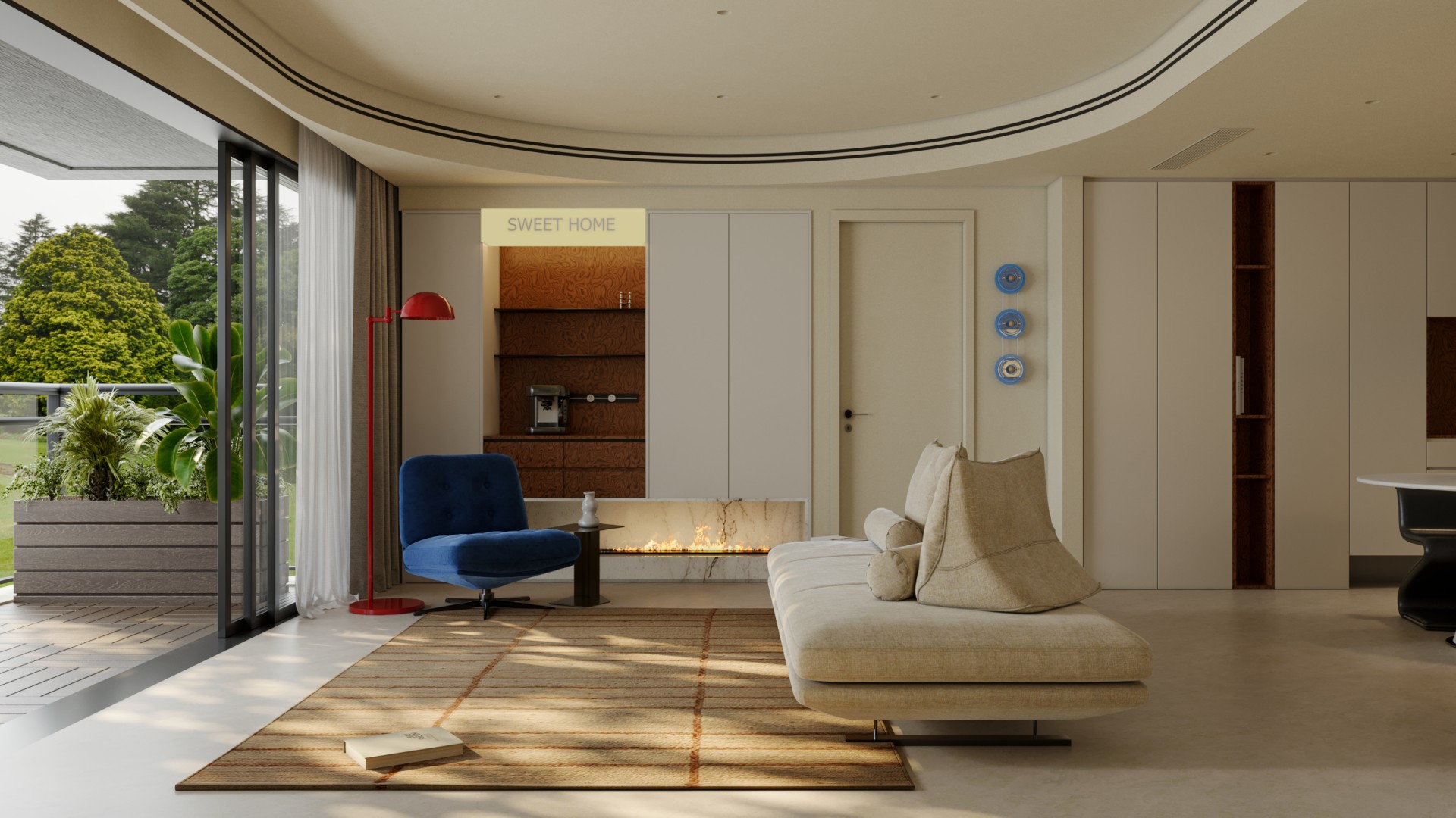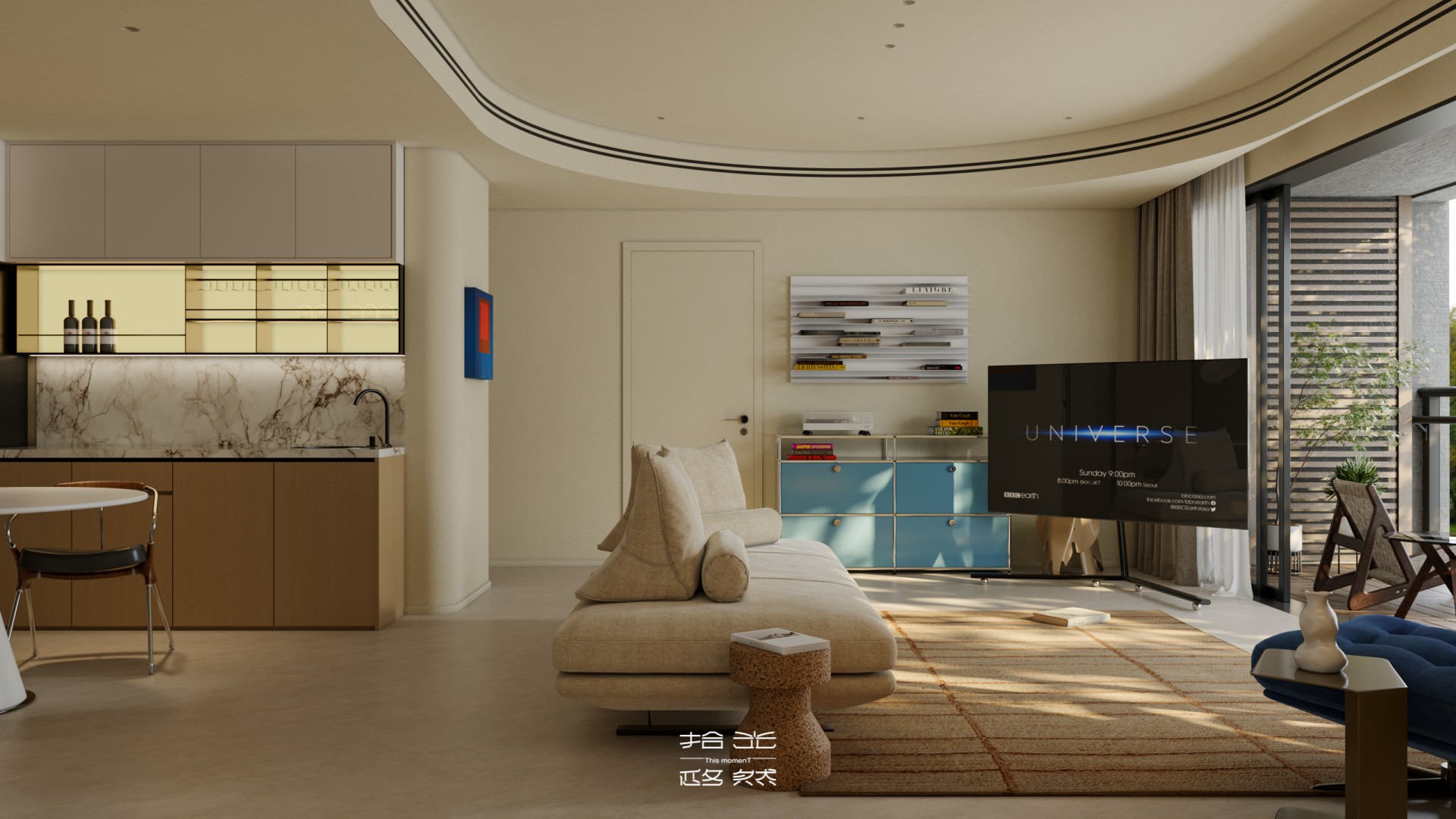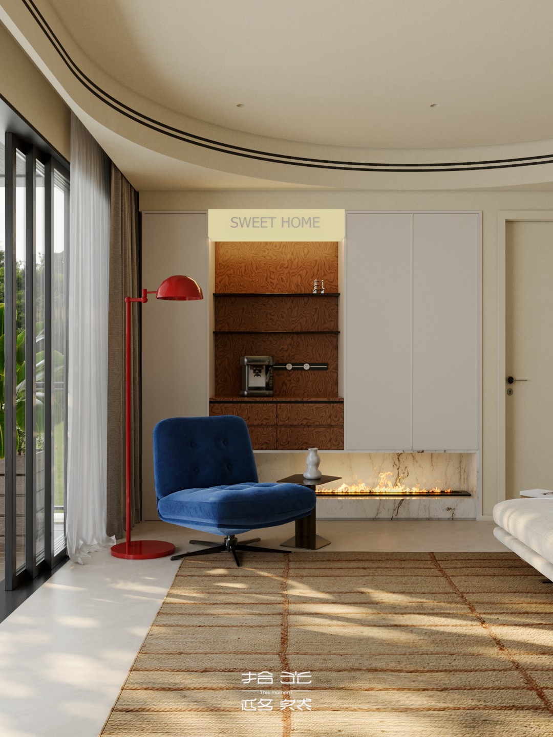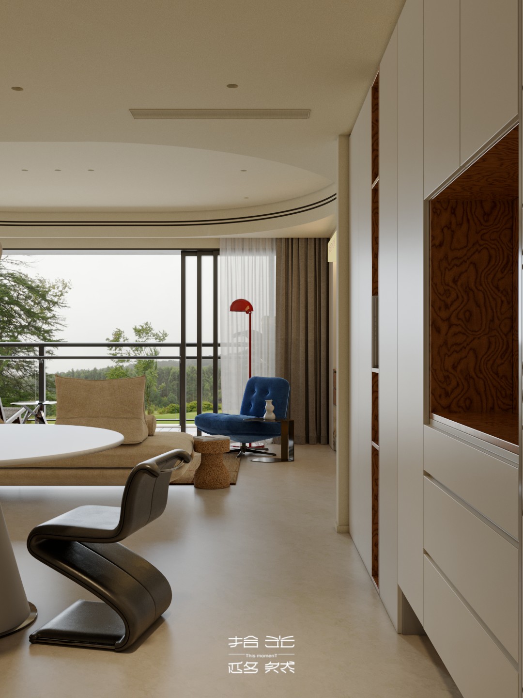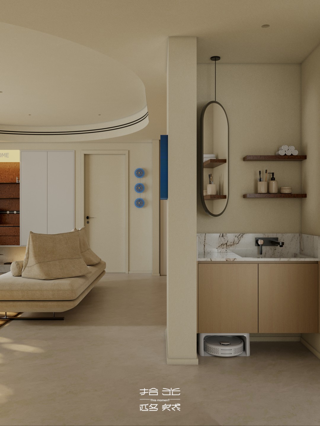 当弧线吊顶划过天际线,当焦糖色木皮碰撞克莱因蓝绒布,设计师以「流动的容器」为理念,在都市住宅中编织出一场材质与光影的对话。 通透的玻璃幕墙将自然光线引入室内,弧形元素柔化空间棱角,而精准的色彩配比则在克制中释放出温暖张力。这里没有冗余的装饰,只有恰到好处的留白 —— 让每一件家具、每一束光影都成为生活的注脚,诠释着当代人对「轻奢华、重质感」居住美学的终极向往。