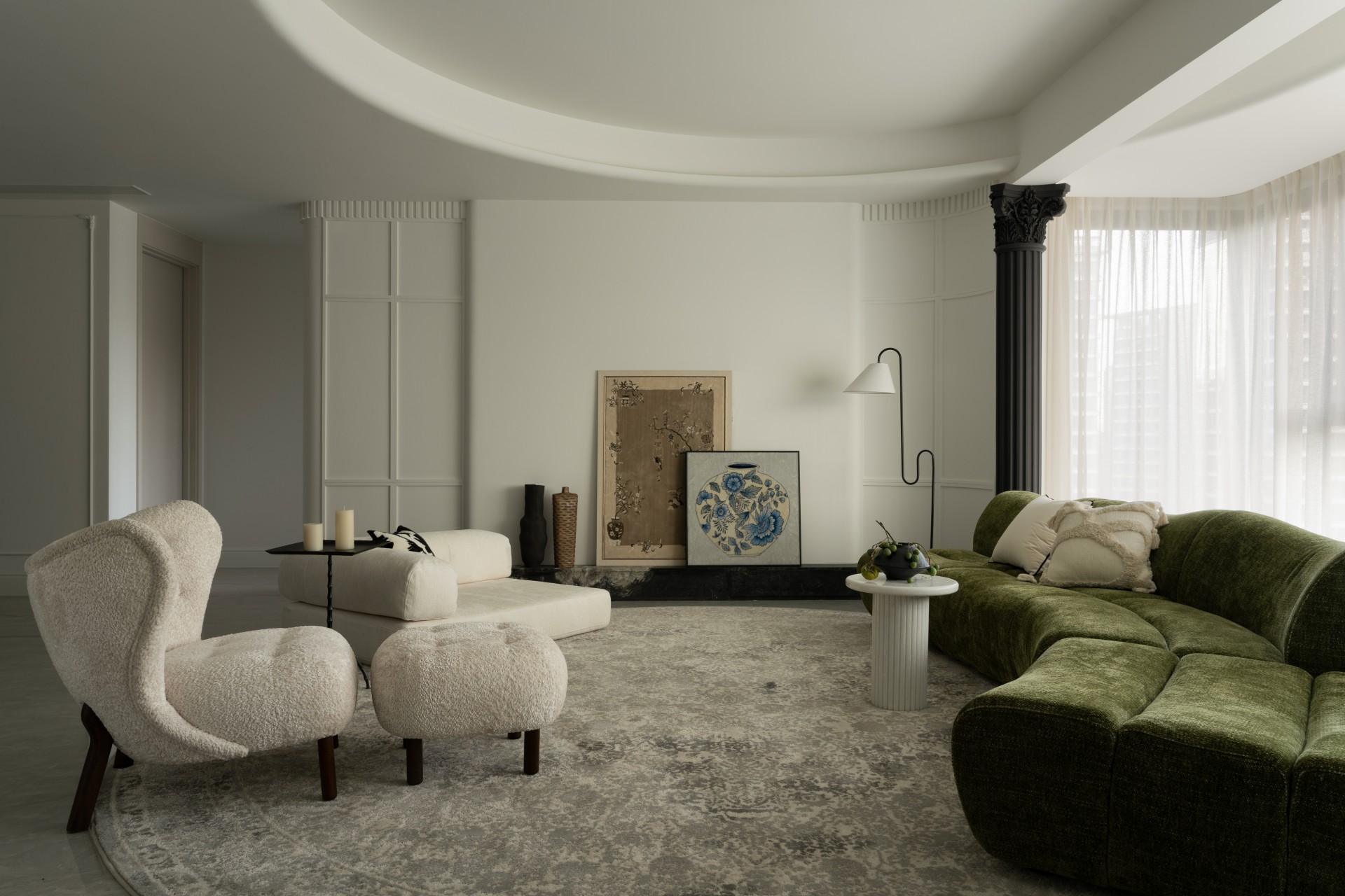 墙面与吊顶的曲面,是空间藏的温柔小心思:没有棱角的锐利,只把整个客厅轻轻 “抱” 在怀里,软乎乎的包裹感裹着光,待在这里连呼吸都跟着慢下来。