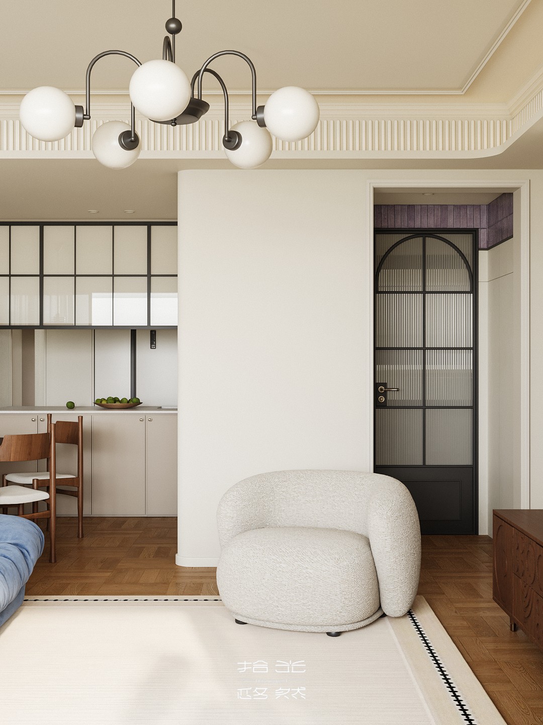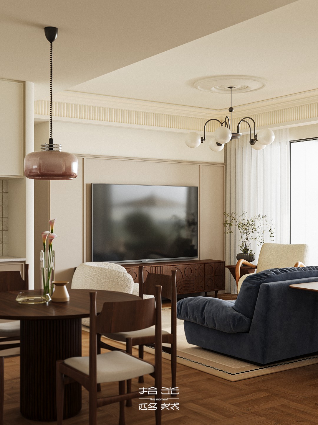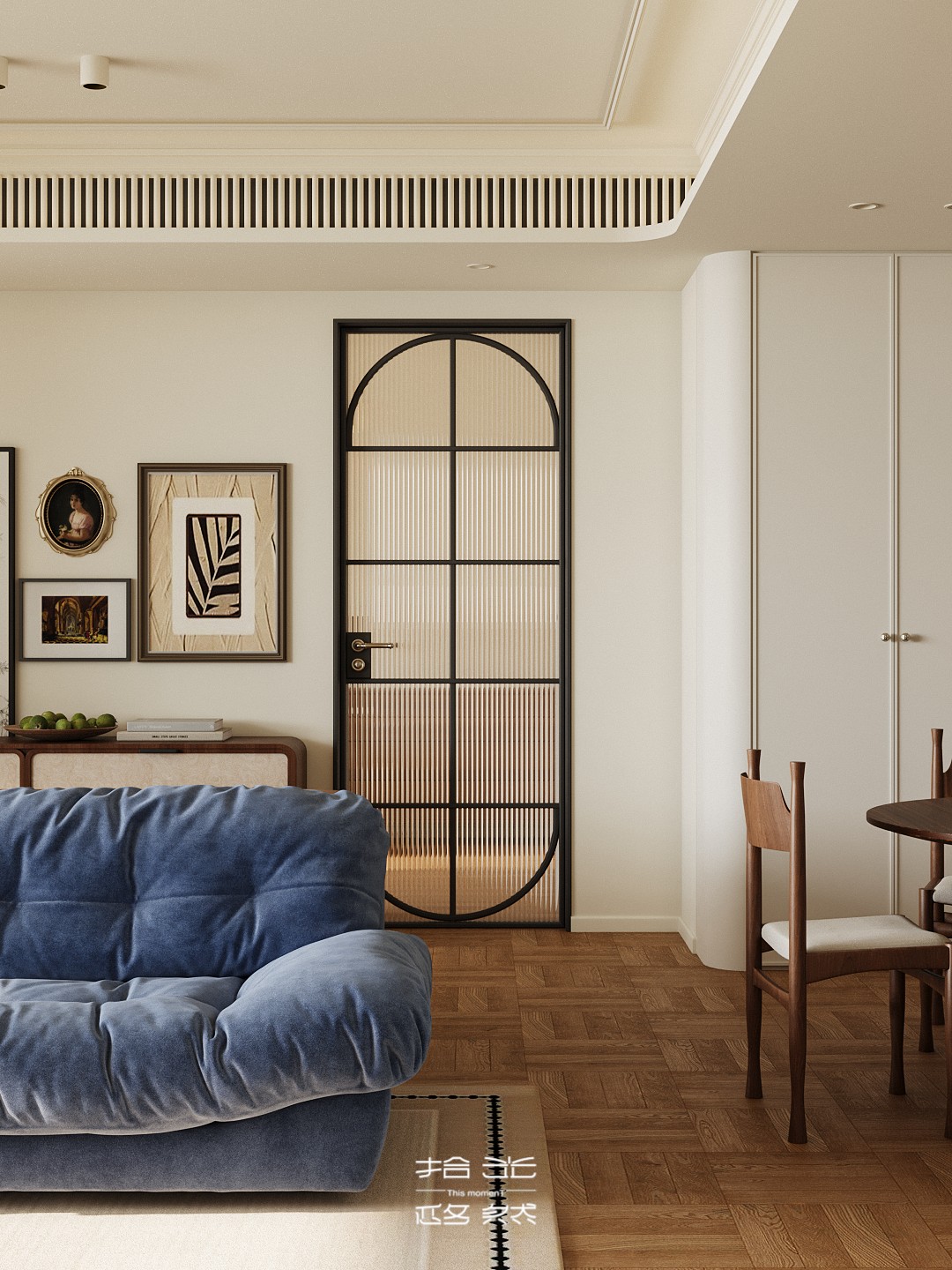 当暖木的纹路漫过毛坯房的空白基底,晨间柔光顺着落地窗的纱帘漏进来——先轻触墙面雕花的复古肌理,再落在宝蓝绒布沙发的软褶皱上,这 135㎡的空间,便从未完成的框架,长成了裹着生活温度的家。 没有炫目的装饰,只有材质的本真被妥帖安放:暖木餐桌承得起早餐的热香,卧室里的柔纱与绒毯裹着夜的松弛,书房的弧形榻又藏着独处的轻闲;连厨房与客区的隔断,都以肌理玻璃柔化了边界,让光与风在空间里自在流转。 从毛坯到新家,从不是 “填满” 的过程,是把自然的温软与日常的松弛,织进每一寸肌理里。