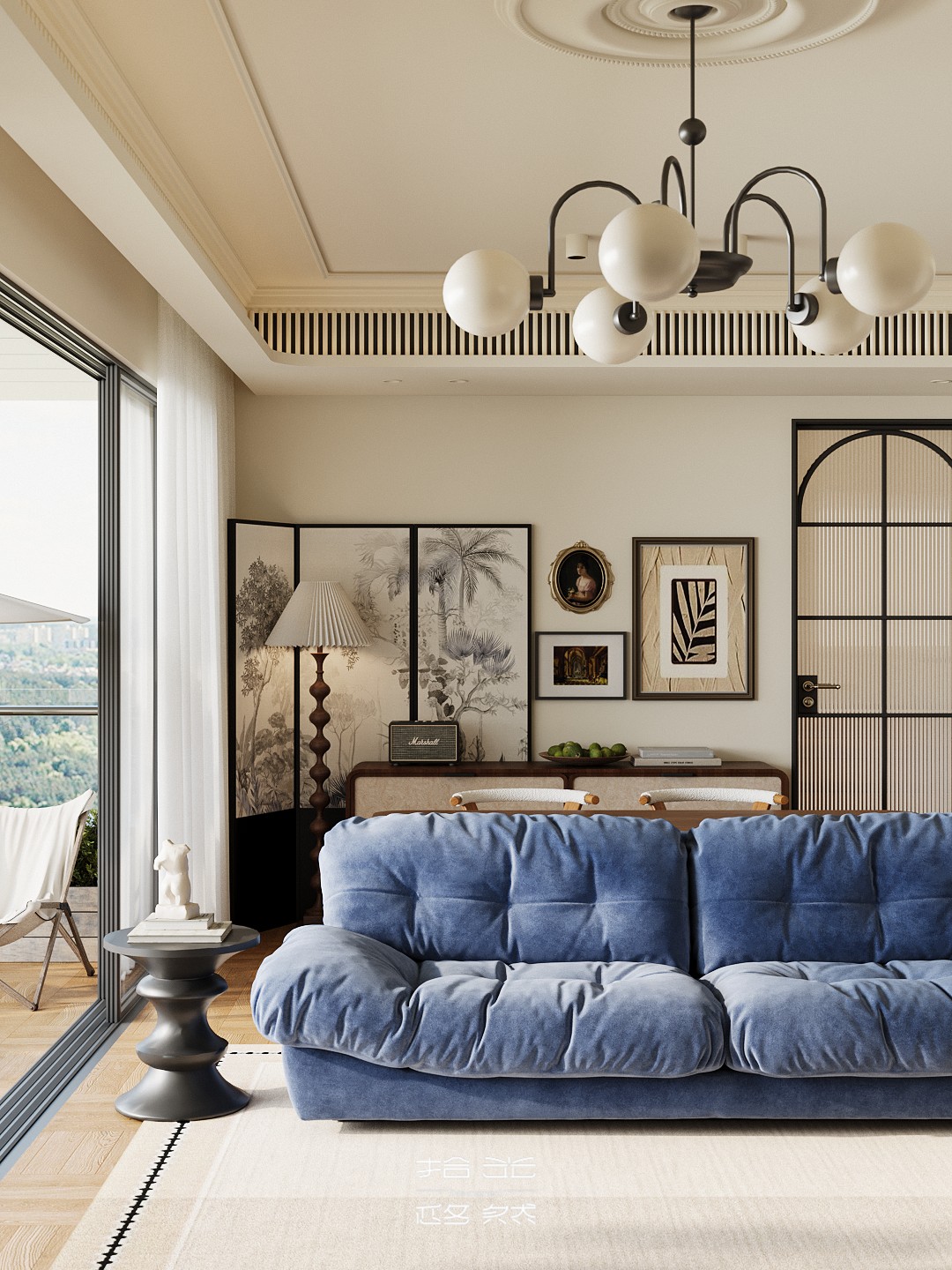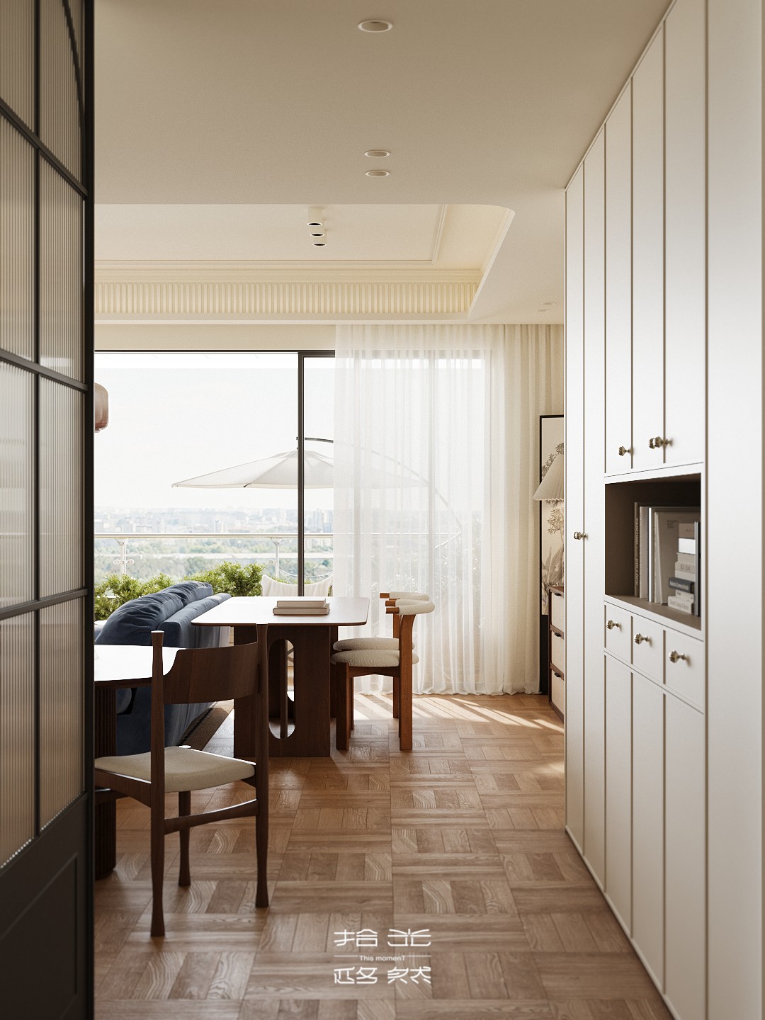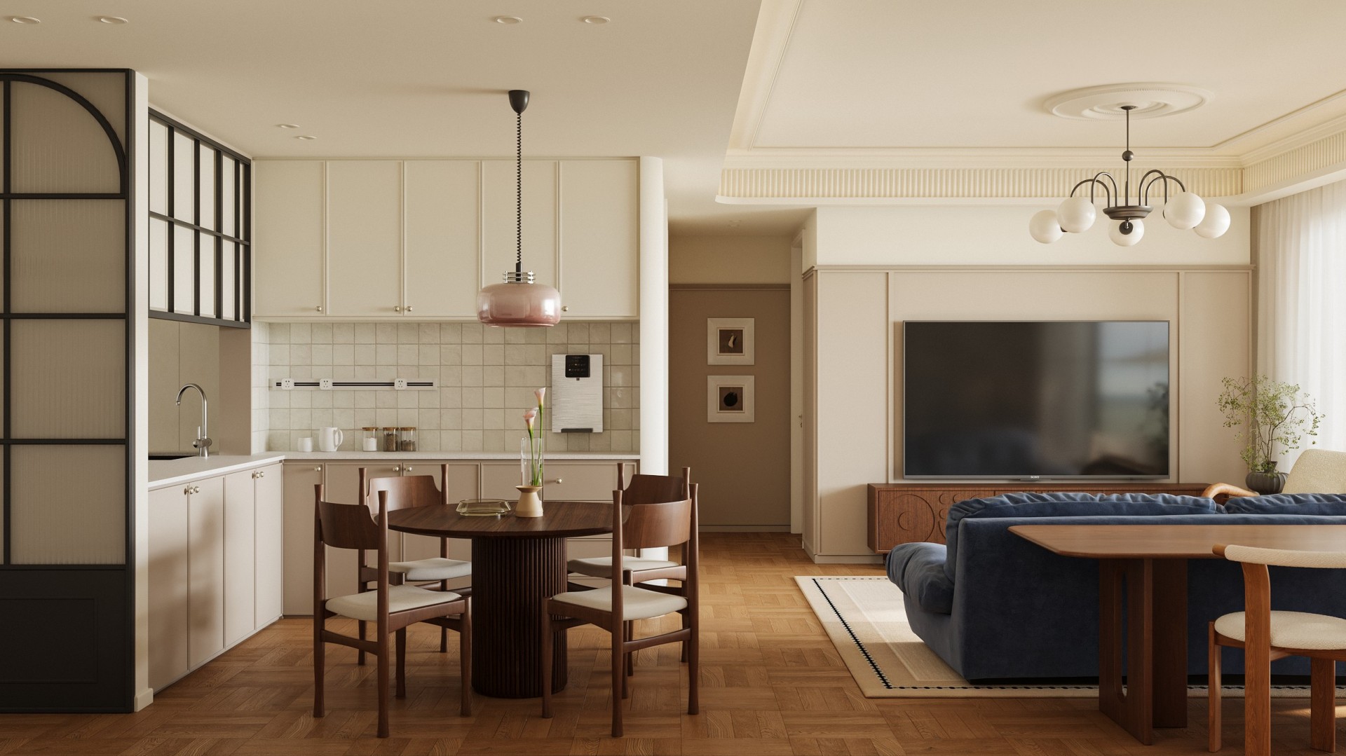 当暖木的纹路漫过毛坯房的空白基底,晨间柔光顺着落地窗的纱帘漏进来——先轻触墙面雕花的复古肌理,再落在宝蓝绒布沙发的软褶皱上,这 135㎡的空间,便从未完成的框架,长成了裹着生活温度的家。 没有炫目的装饰,只有材质的本真被妥帖安放:暖木餐桌承得起早餐的热香,卧室里的柔纱与绒毯裹着夜的松弛,书房的弧形榻又藏着独处的轻闲;连厨房与客区的隔断,都以肌理玻璃柔化了边界,让光与风在空间里自在流转。 从毛坯到新家,从不是 “填满” 的过程,是把自然的温软与日常的松弛,织进每一寸肌理里。
