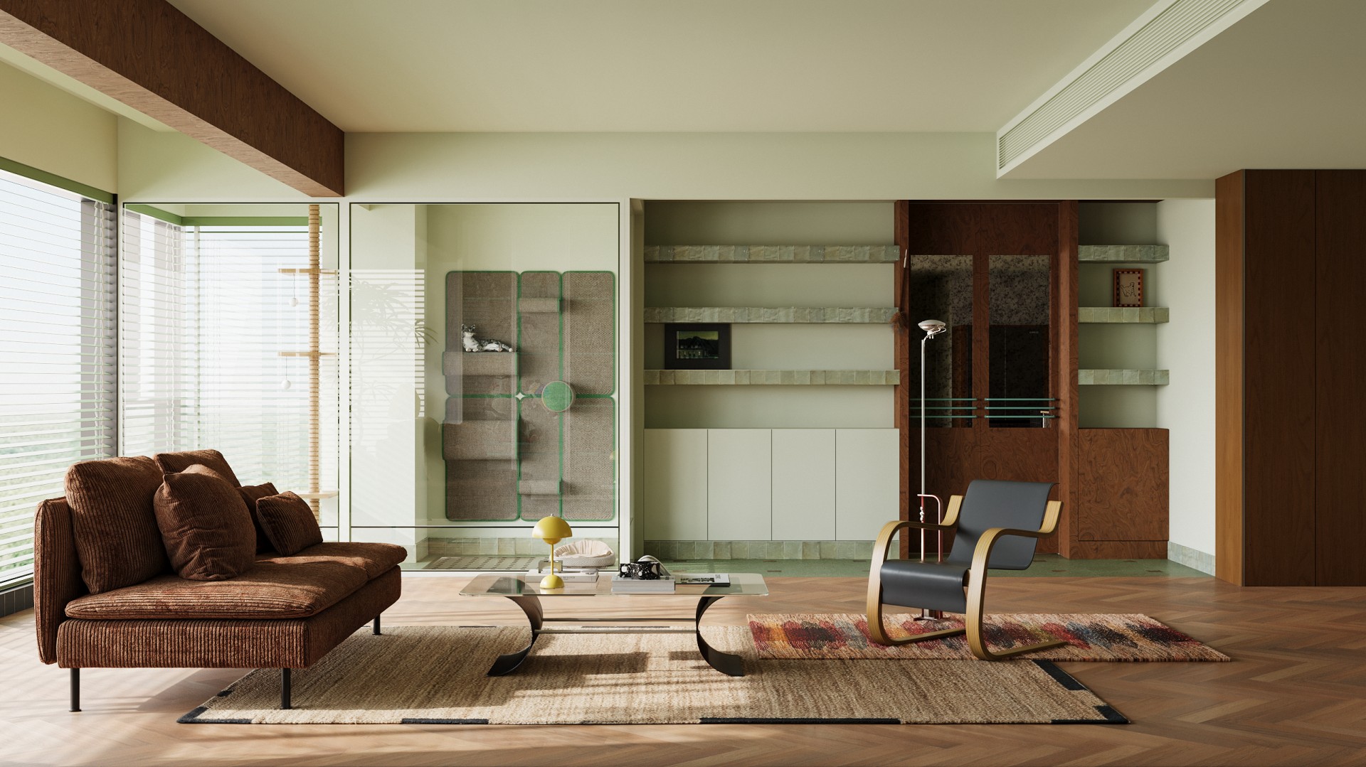 当低饱和浅绿的墙面晕开松弛氛围,通顶玻璃柜里的机甲阵列却正迸发着机械热血 —— 这不是风格的冲突,而是都市独居屋主「温柔栖居」与「硬核热爱」的共生场域。 屋主是资深机甲收藏爱好者,同时期待空间兼具 “宠物友好” 的日常舒适,与 “轻复古质感” 的审美表达。设计以柔雾浅绿为基底,糅合胡桃木的温软、金属与玻璃的利落:既用通顶玻璃展示柜,让机甲藏品从 “收纳物” 转化为空间视觉核心;又暗藏猫爬架、复古海报等细节,让硬核热爱与柔软日常自然衔接。 从客厅的肌理地毯到卧室的悬浮置物架,从厨房的模块化柜体到窗边的植栽角落,每一处都在平衡 “展示型兴趣” 与 “沉浸式舒适”。最终,这处住宅成了 “不被风格定义” 的居停:它有现代空间的松弛秩序,有复古软装的温度肌理,更有独属于屋主的热爱印记 —— 让日常与热爱,都能在这方天地里自在生长。