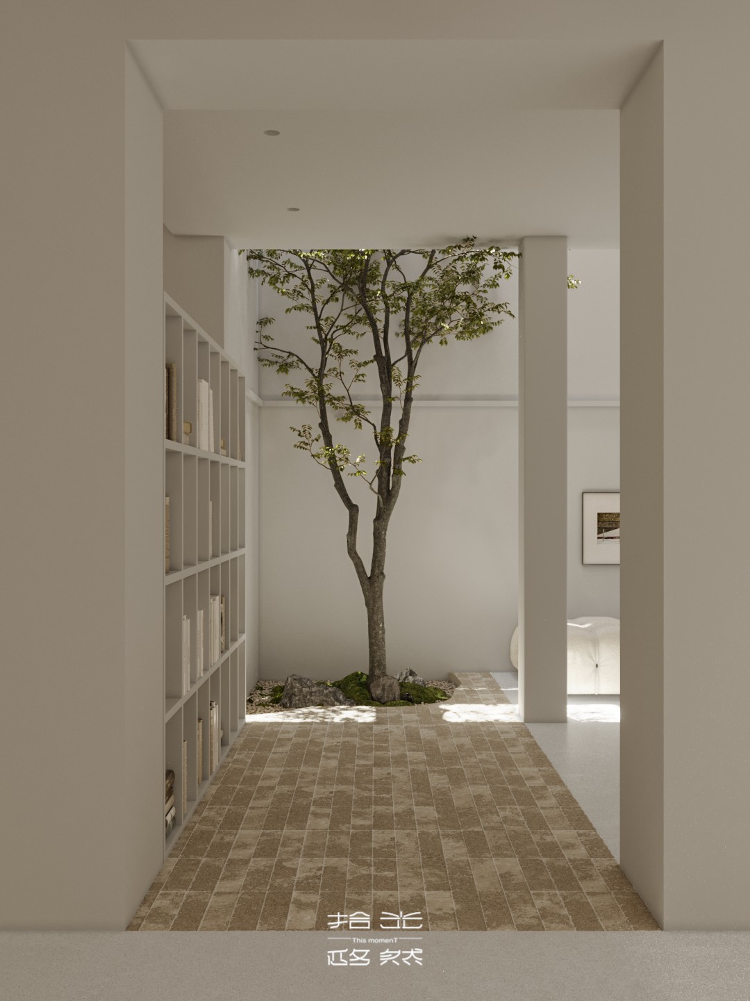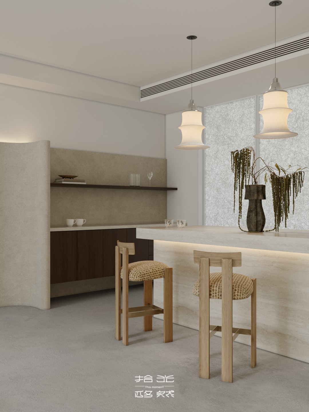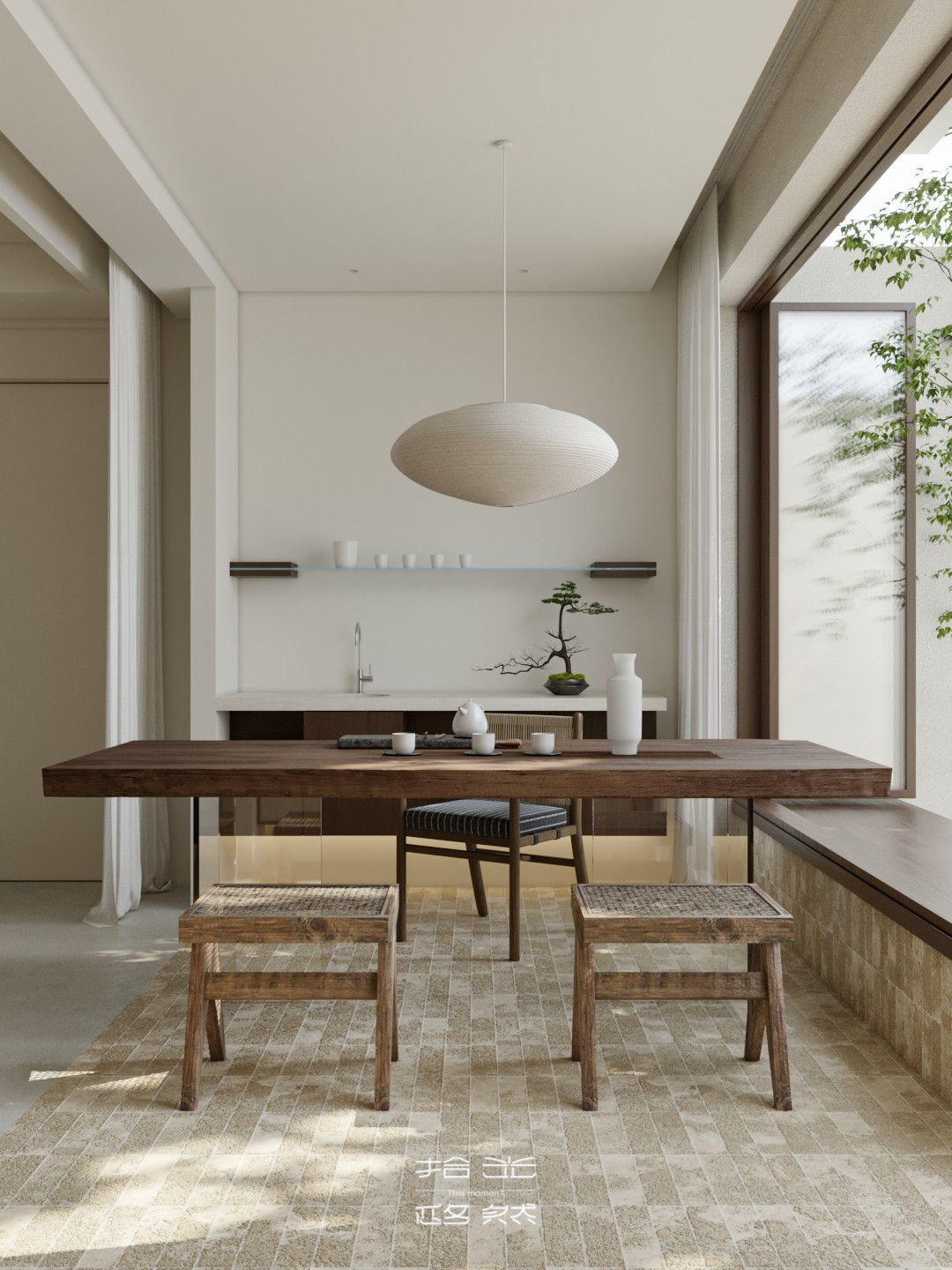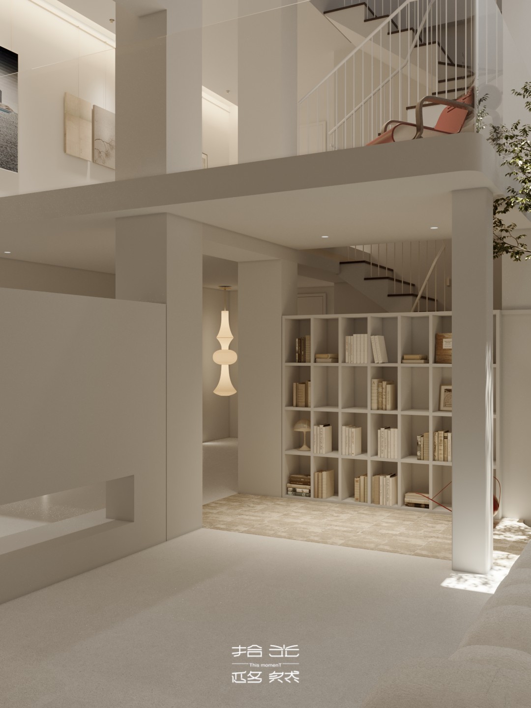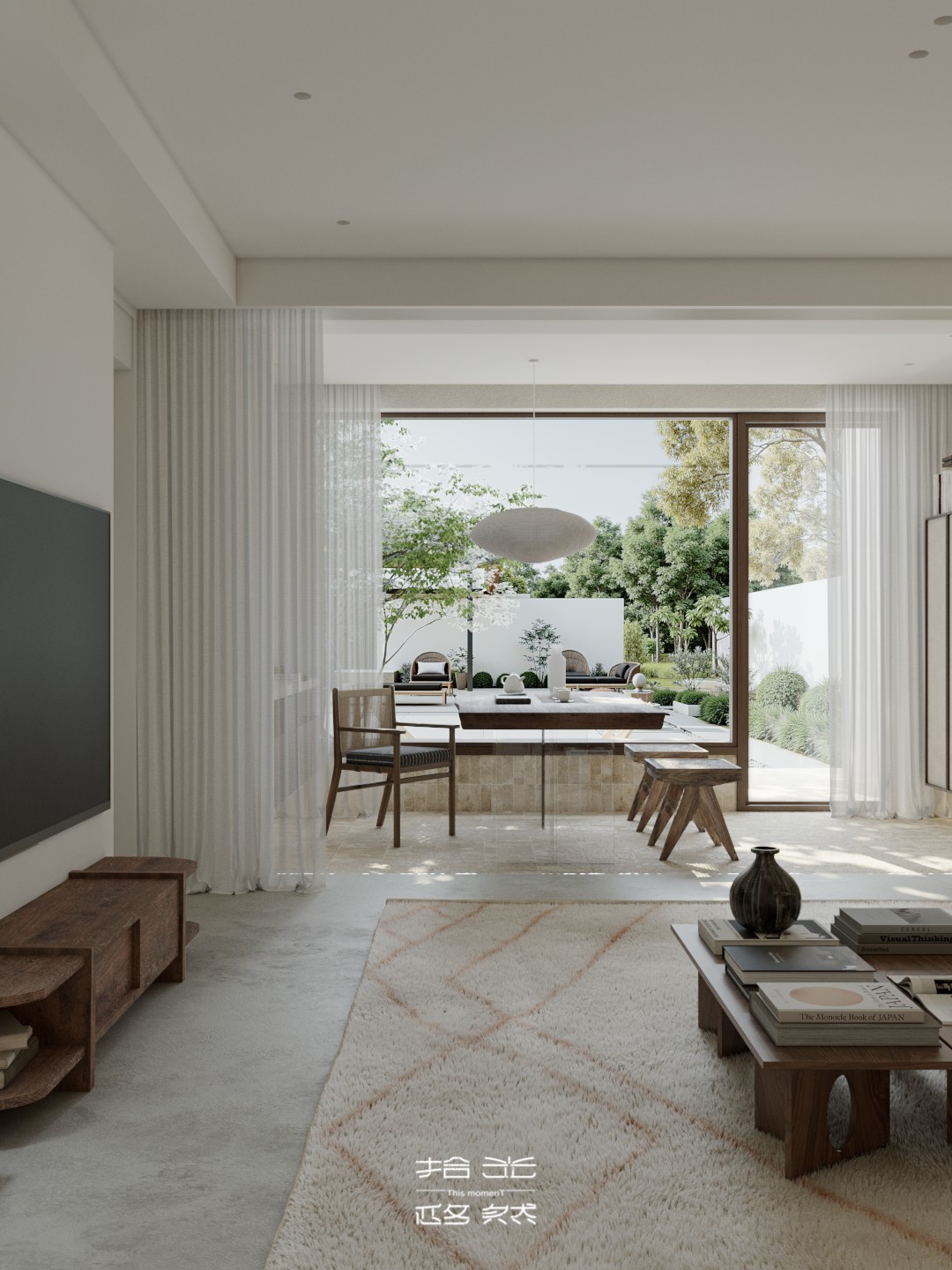 当设计的命题落向 “让自然成为空间的肌理”,这间由拾光设计 × 迩多家居呈现的居所,便以 “消弭边界” 为笔,织就了庭院与室内共生的松弛场域。 微水泥以哑光的柔暖覆满墙面与地面,指尖碾过是细沙般的温软;深棕原木框起整面玻璃,把庭院的树影、石径与风,径直拉进室内 —— 午后的光穿过纱帘,先缠上弧形沙发的绒面褶皱,再漫过室内树的枝桠,与庭院里的绿意织成一片轻雾。 空间是没有硬边界的流动体:挑空层的书架嵌在浅灰墙体间,与旁侧的树共生出 “室内林” 的松弛;走廊里的彩格置物架,以轻量的色彩揉化极简的素;吧台的柔光灯带裹着原木凳的暖,连花艺的枯枝都浸着东方式的淡寂。 它从不用风格定义场域,只把庭院的风、肌理的柔、光的软,妥帖织进每一处日常:推开门,是树影裹着的温软,是室内外无界的自然,是一脚踏进 “被绿意轻拥” 的生活里。