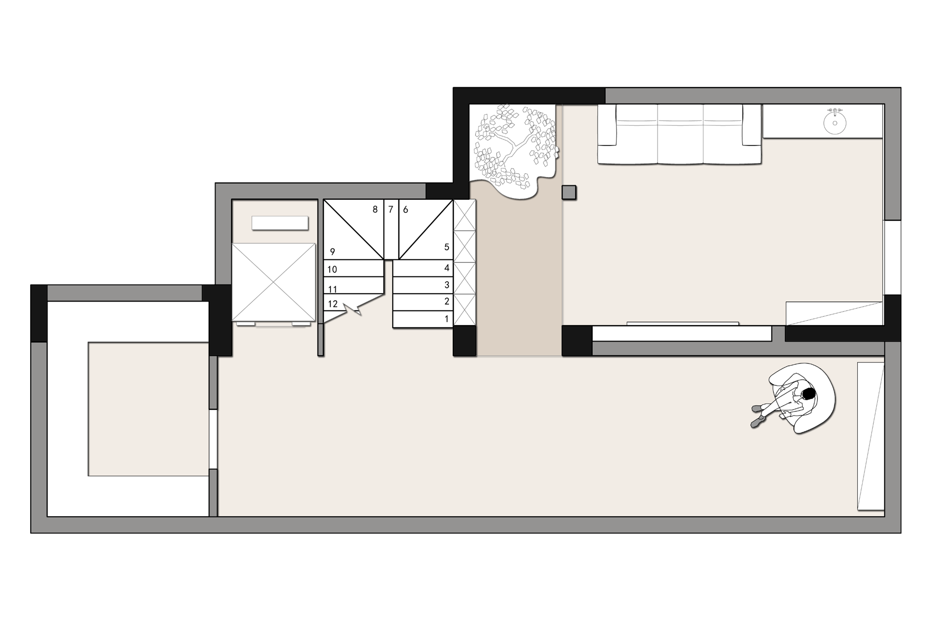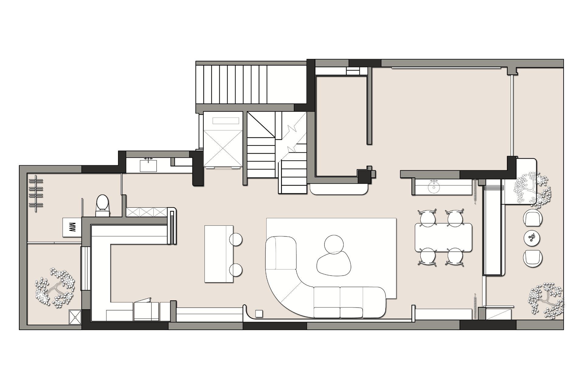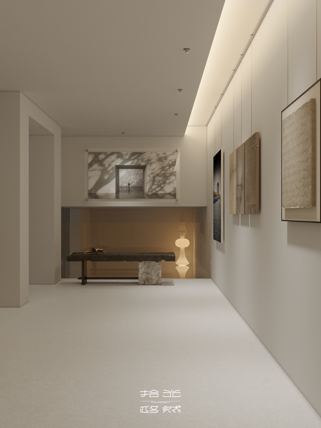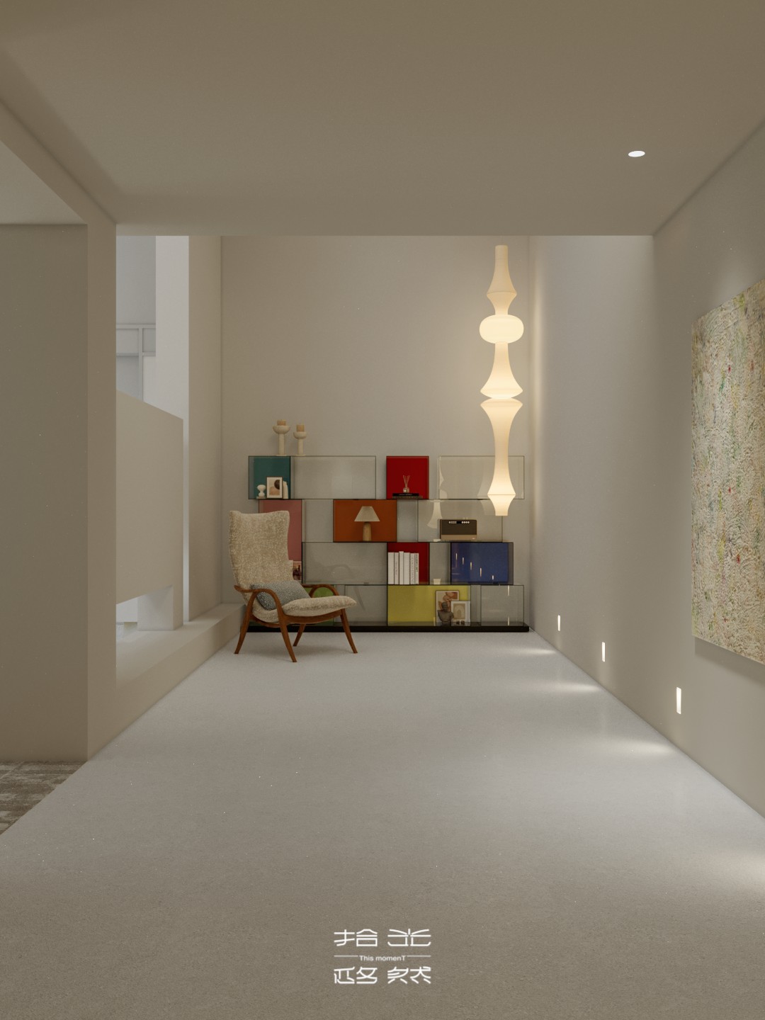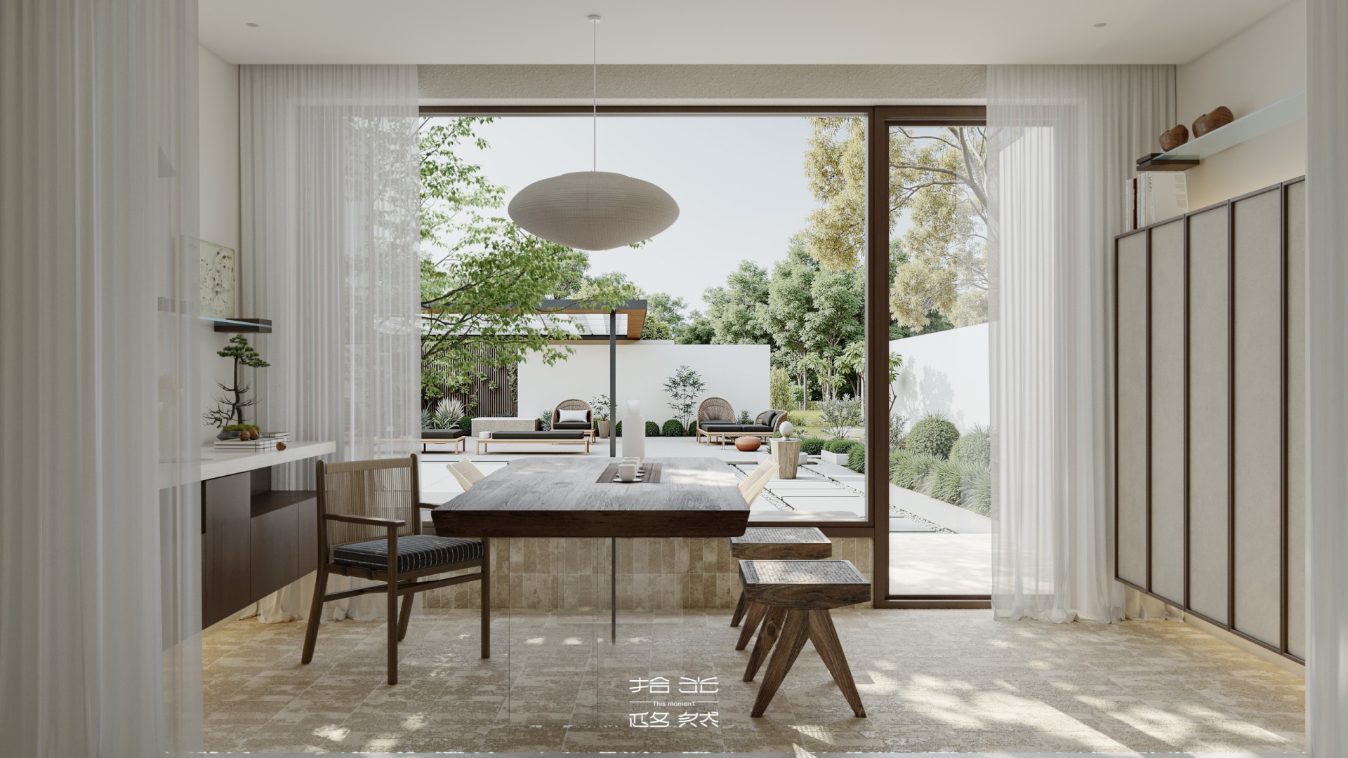 当设计的命题落向 “让自然成为空间的肌理”,这间由拾光设计 × 迩多家居呈现的居所,便以 “消弭边界” 为笔,织就了庭院与室内共生的松弛场域。 微水泥以哑光的柔暖覆满墙面与地面,指尖碾过是细沙般的温软;深棕原木框起整面玻璃,把庭院的树影、石径与风,径直拉进室内 —— 午后的光穿过纱帘,先缠上弧形沙发的绒面褶皱,再漫过室内树的枝桠,与庭院里的绿意织成一片轻雾。 空间是没有硬边界的流动体:挑空层的书架嵌在浅灰墙体间,与旁侧的树共生出 “室内林” 的松弛;走廊里的彩格置物架,以轻量的色彩揉化极简的素;吧台的柔光灯带裹着原木凳的暖,连花艺的枯枝都浸着东方式的淡寂。 它从不用风格定义场域,只把庭院的风、肌理的柔、光的软,妥帖织进每一处日常:推开门,是树影裹着的温软,是室内外无界的自然,是一脚踏进 “被绿意轻拥” 的生活里。