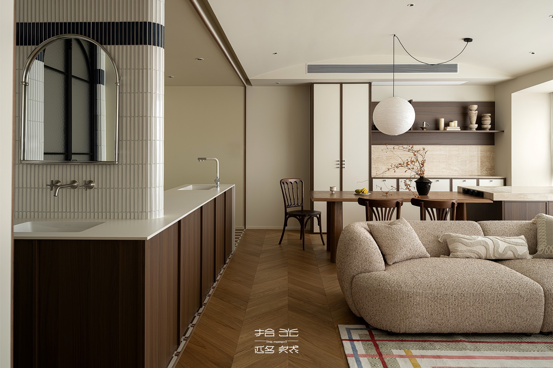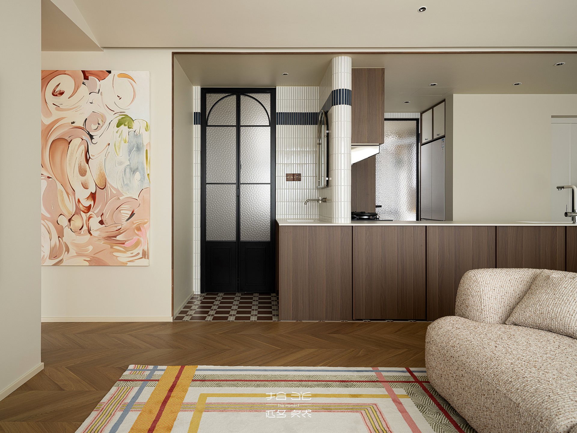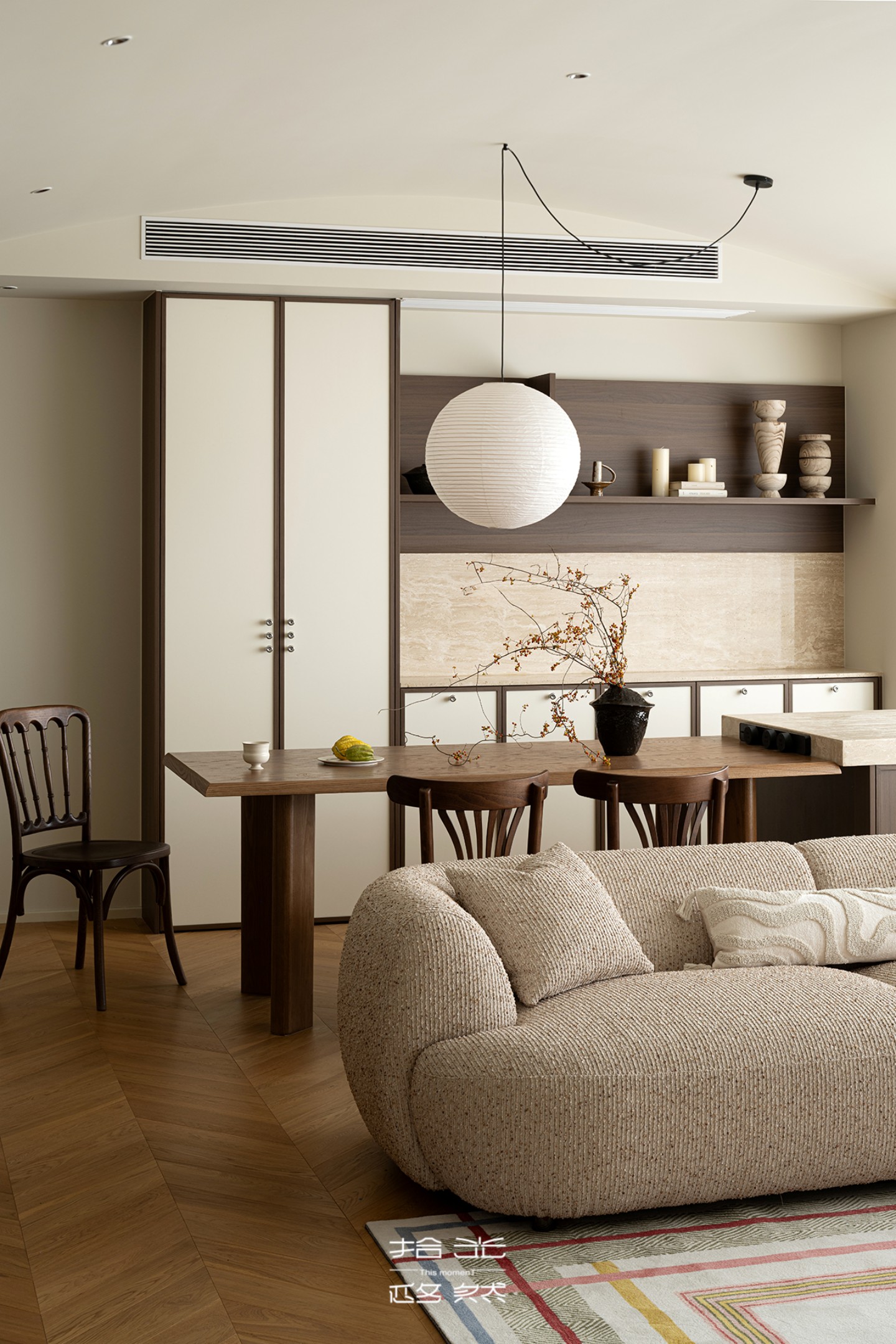 沙发选用带着颗粒肌理的浅棕织物,触感温润且质感凸显;深棕色木质边几与柜体为空间注入沉稳底色,与浅色调佐敦 1875 墙面形成巧妙平衡。一块带有彩色条纹的地毯铺陈其间,既不打破空间的静谧,又为其注入轻盈的层次感。全屋 YouR 木作定制的柜体以细腻工艺无缝融入,让自然肌理与柔和氛围相融共生,勾勒出高端家居的质感美学。