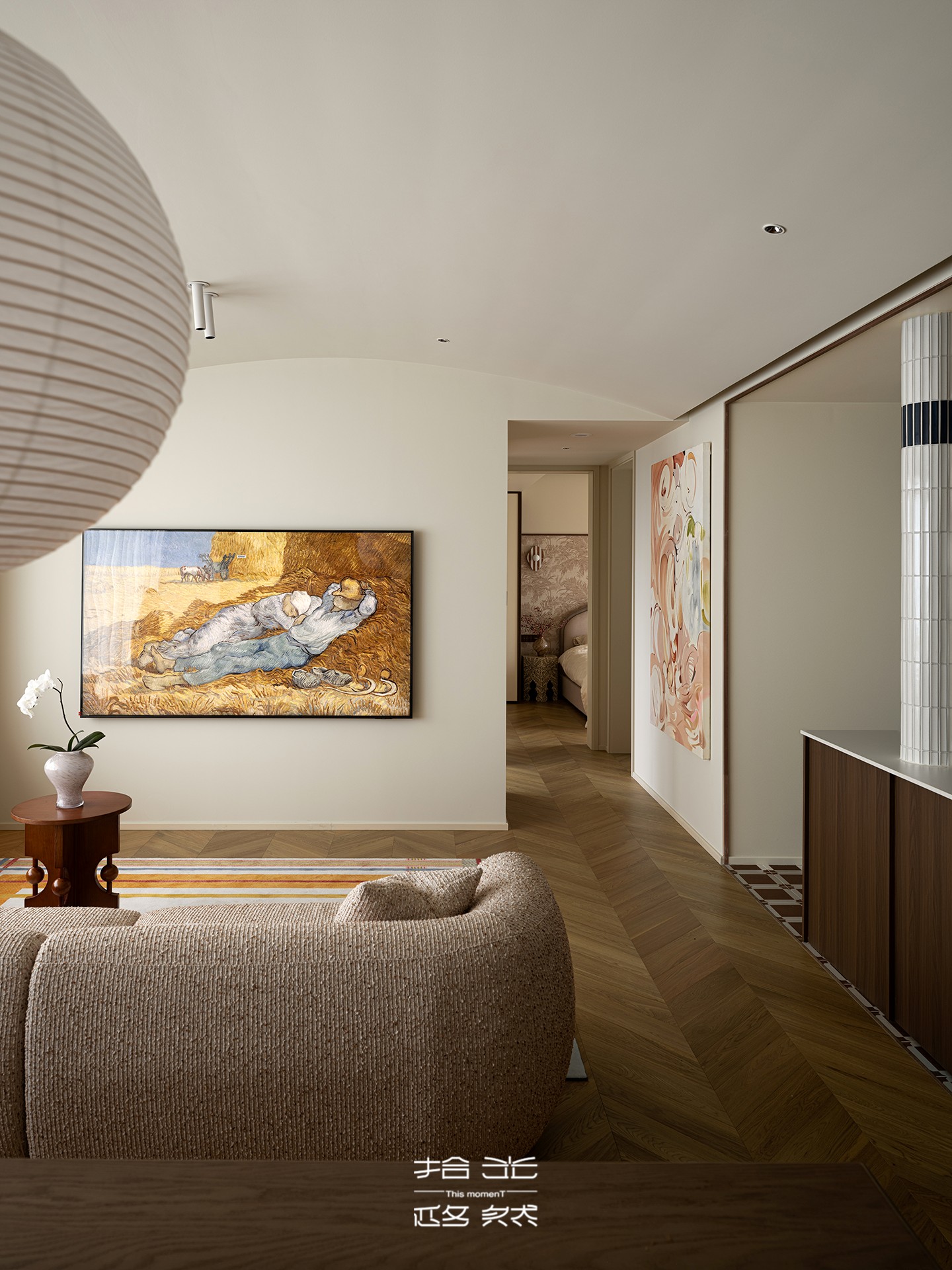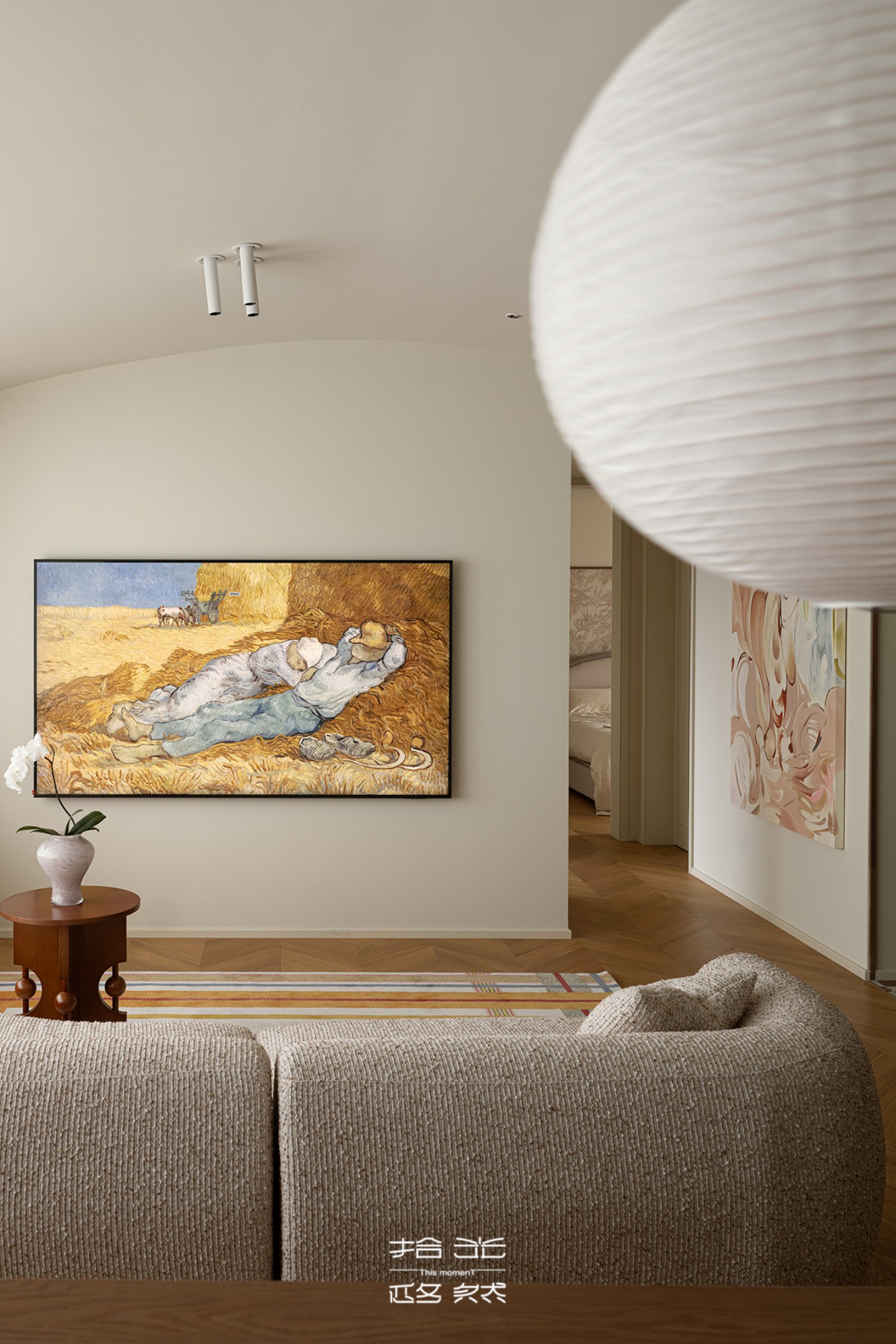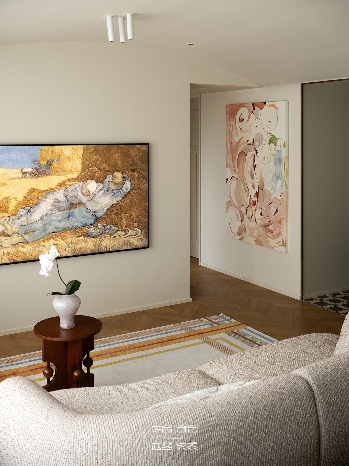 沙发选用带着颗粒肌理的浅棕织物,触感温润且质感凸显;深棕色木质边几与柜体为空间注入沉稳底色,与浅色调佐敦 1875 墙面形成巧妙平衡。一块带有彩色条纹的地毯铺陈其间,既不打破空间的静谧,又为其注入轻盈的层次感。全屋 YouR 木作定制的柜体以细腻工艺无缝融入,让自然肌理与柔和氛围相融共生,勾勒出高端家居的质感美学。