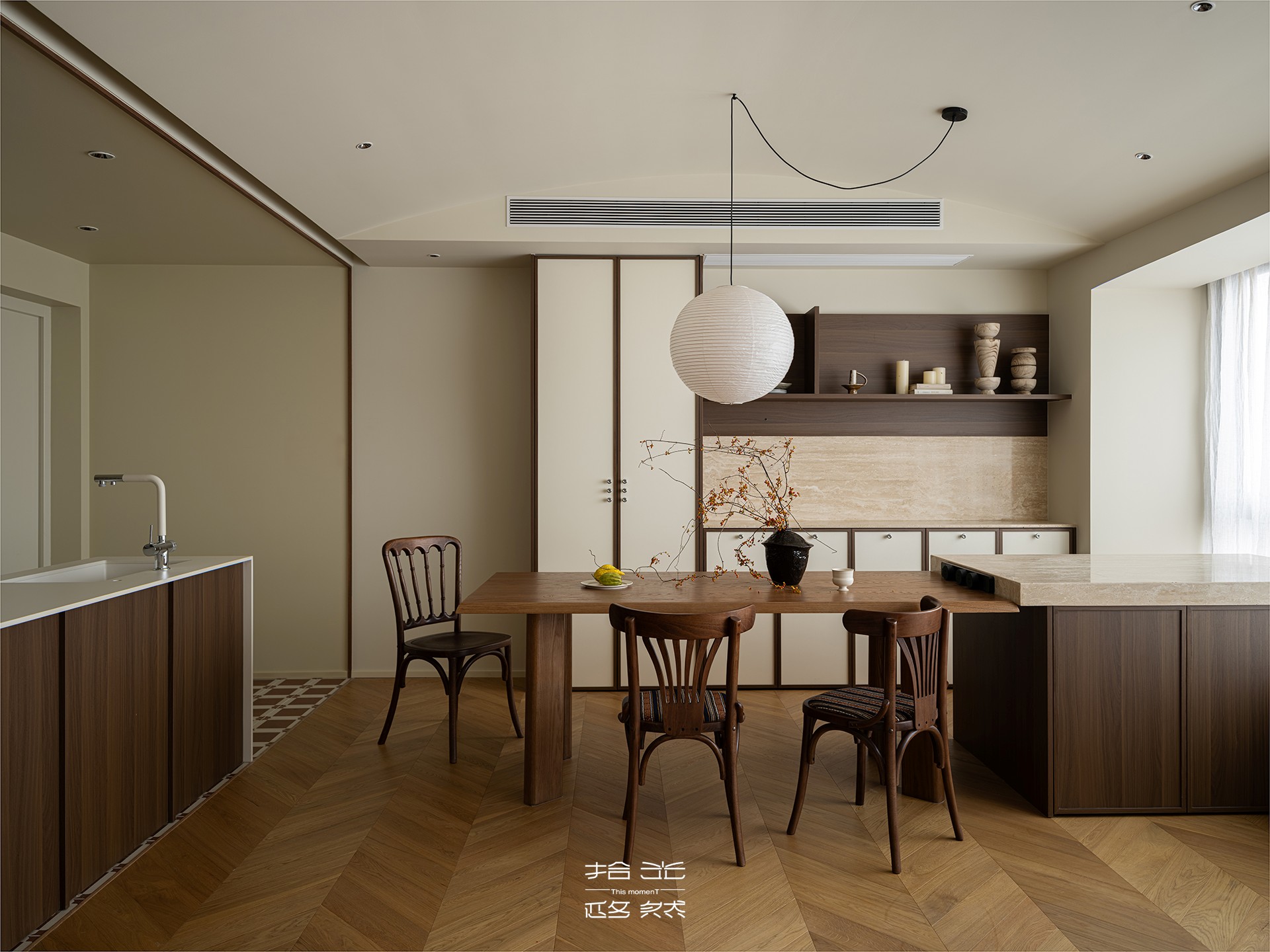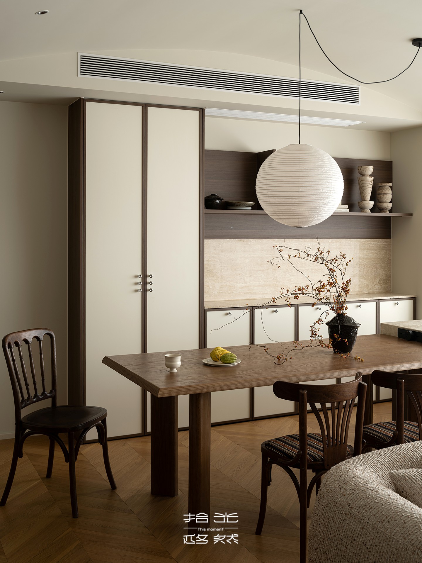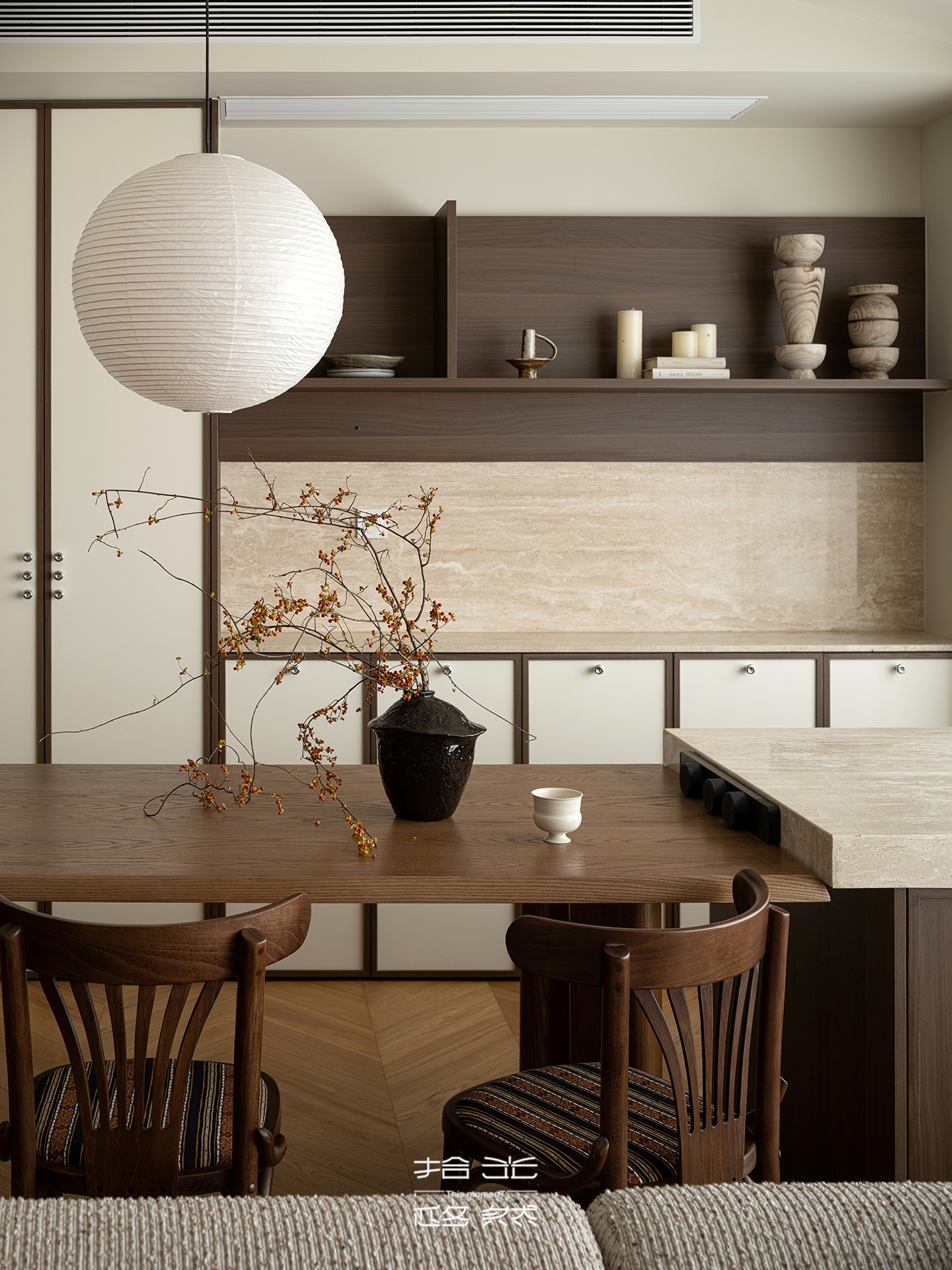 餐厅岛台与餐桌相连,不仅丰富了用餐场景的使用功能,更拓展了收纳维度。背后的餐边柜以浅色系面板为底,深棕色骨骼线勾勒轮廓,既能从容容纳餐具、餐垫等杂物,又避免了全封闭柜体的压抑感;上方的木质置物架用来陈列装饰摆件,藏露之间,让餐厅始终保持整洁通透的呼吸感。