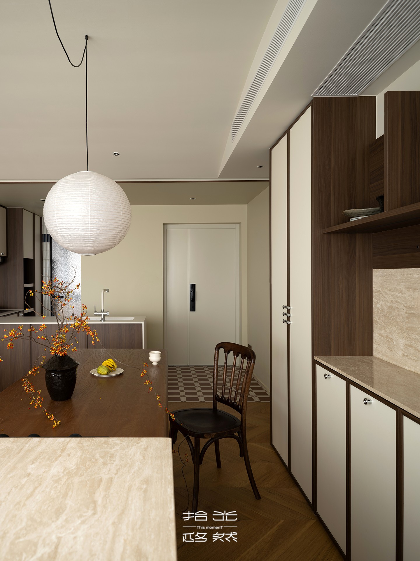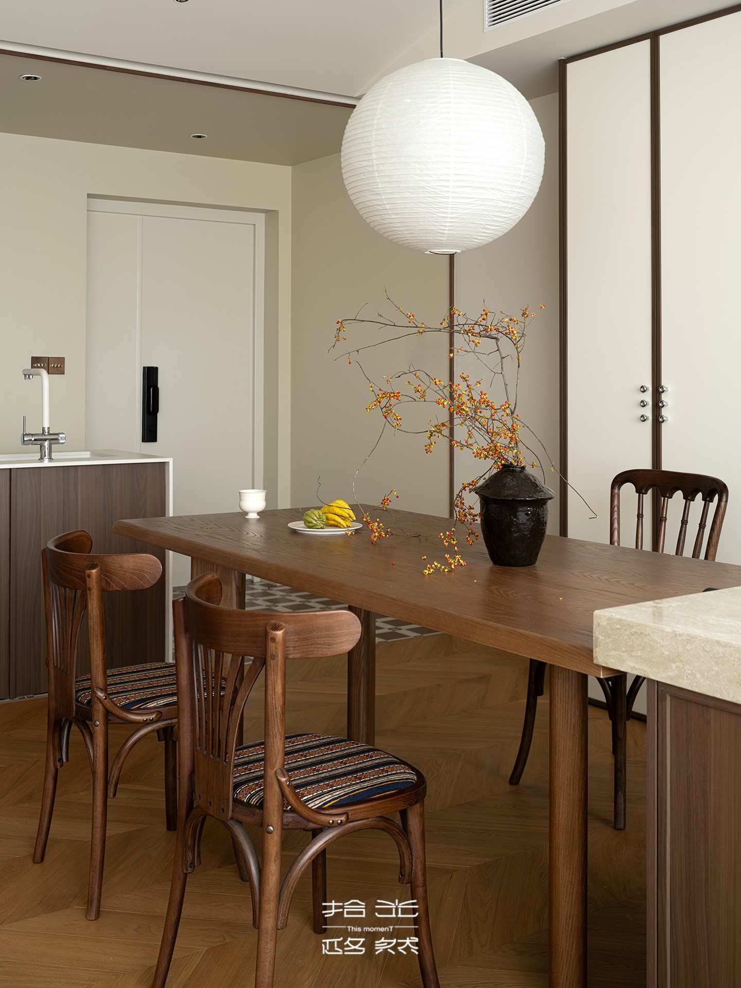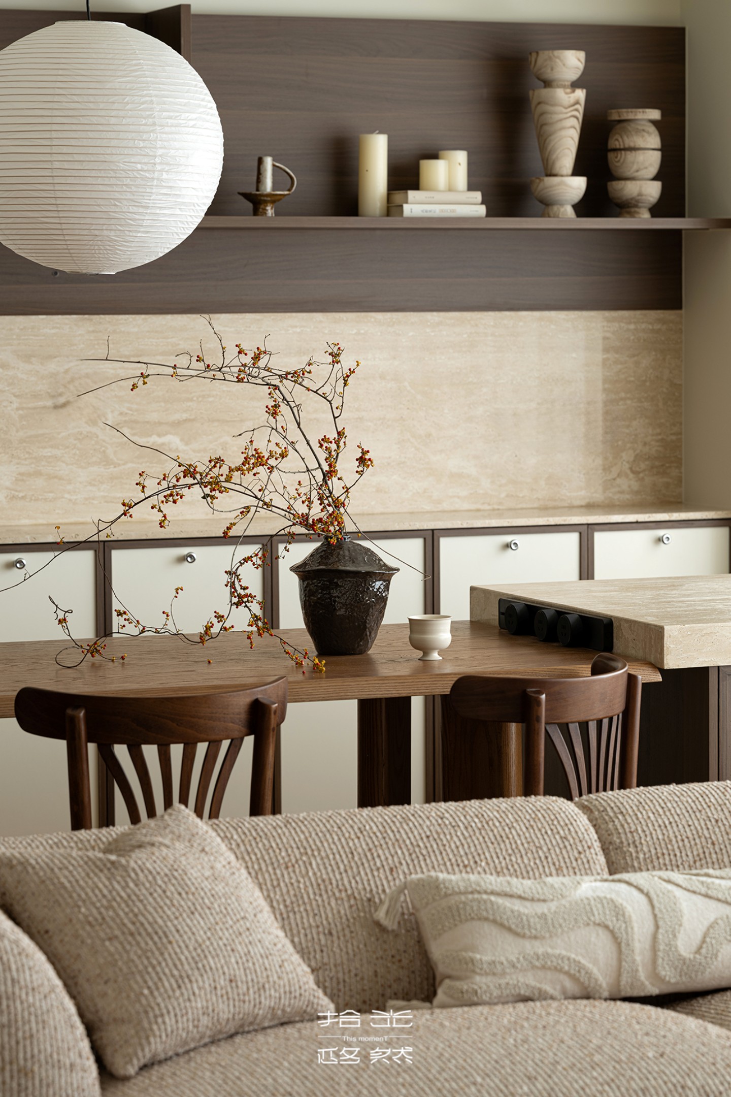 餐厅岛台与餐桌相连,不仅丰富了用餐场景的使用功能,更拓展了收纳维度。背后的餐边柜以浅色系面板为底,深棕色骨骼线勾勒轮廓,既能从容容纳餐具、餐垫等杂物,又避免了全封闭柜体的压抑感;上方的木质置物架用来陈列装饰摆件,藏露之间,让餐厅始终保持整洁通透的呼吸感。