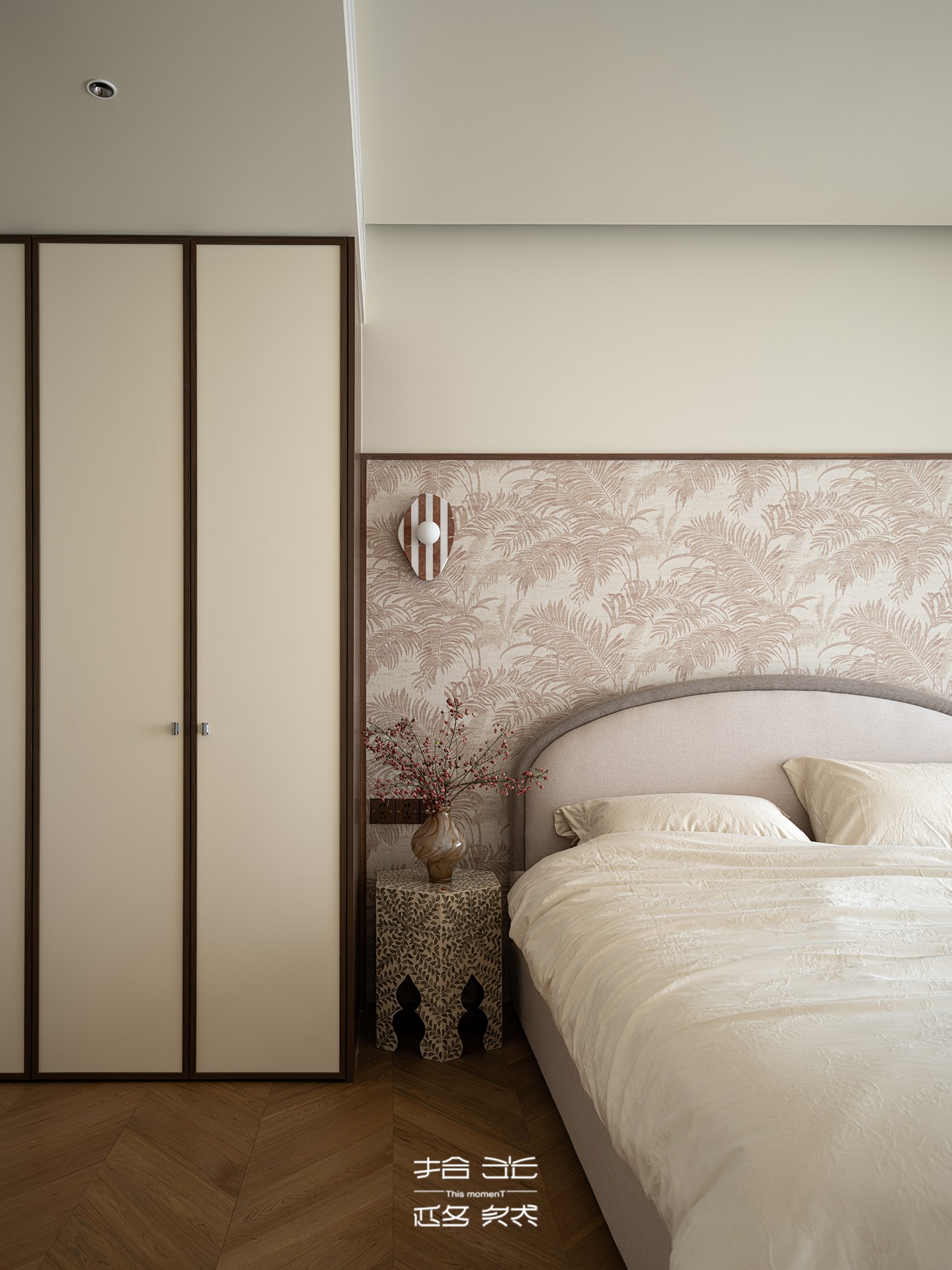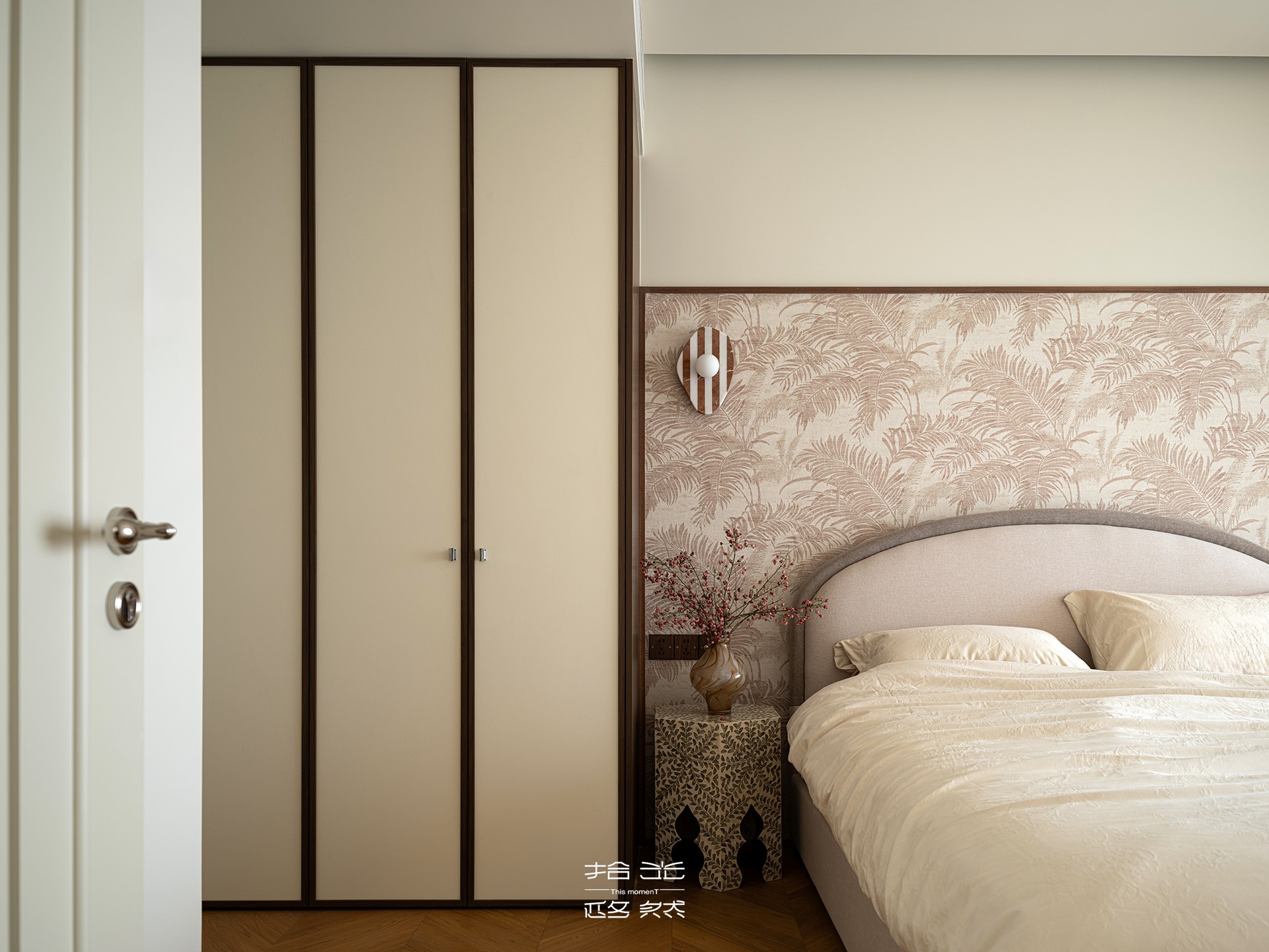 床头背景墙选用棕榈叶肌理的浅棕壁纸,为空间注入自然温馨的气息,却不显繁杂。床头的弧形软包、阳台区域的弧形窗帘,与客厅弧面吊顶形成巧妙呼应,彻底弱化了空间的生硬感,让睡眠氛围愈发松弛惬意。