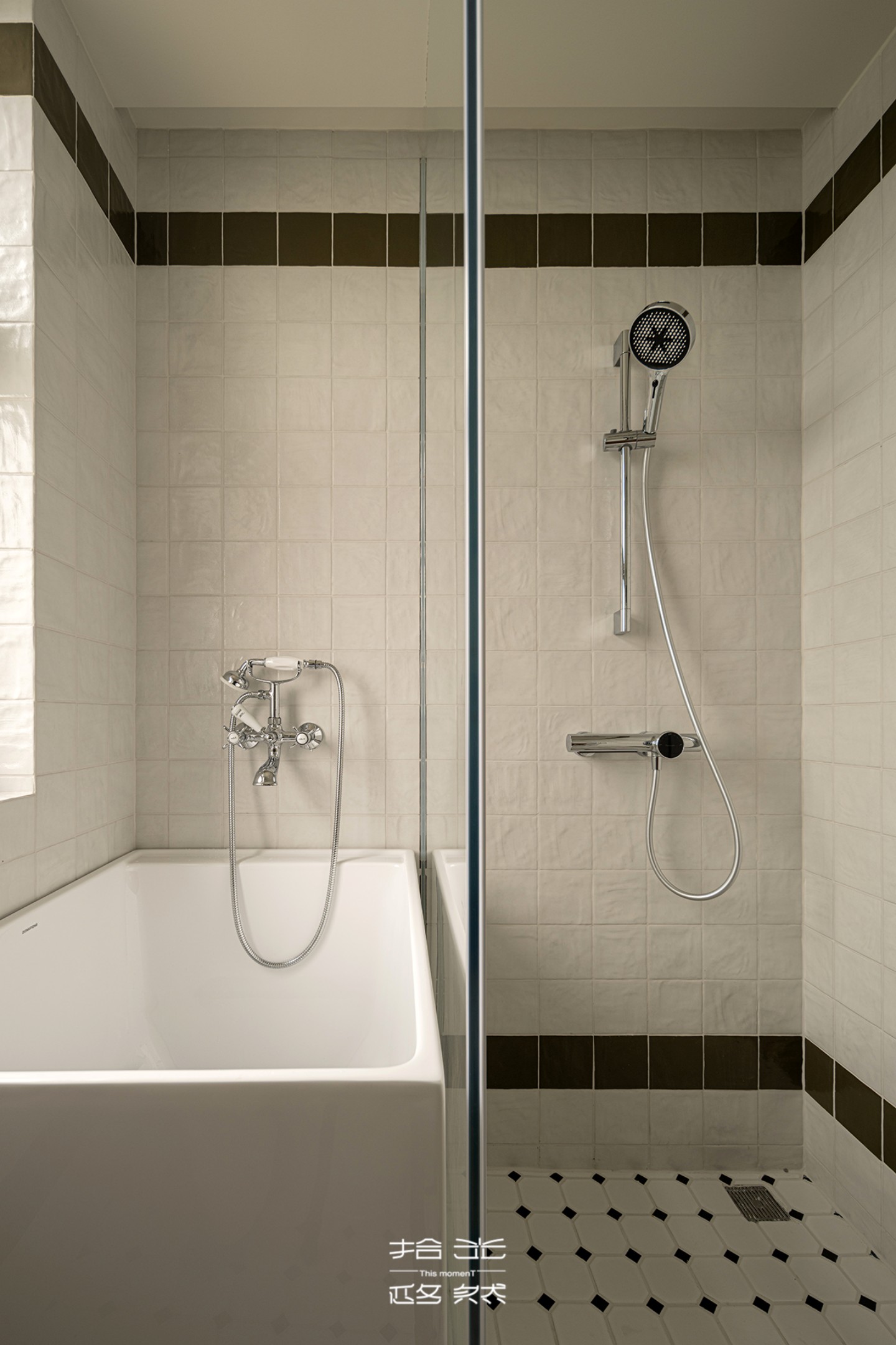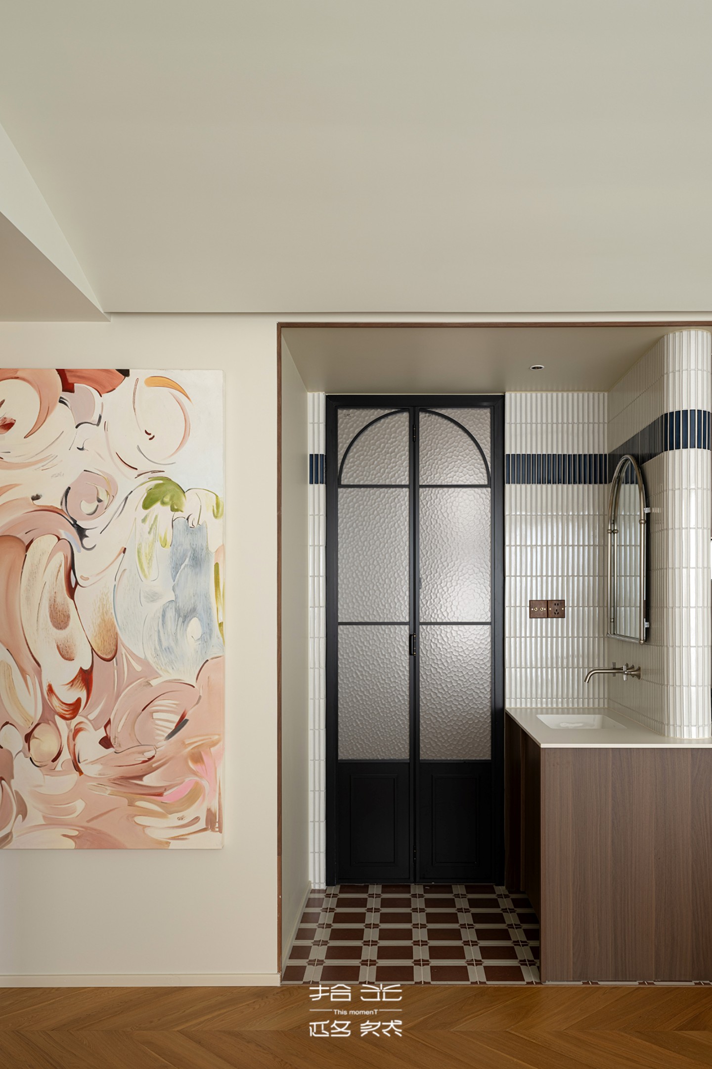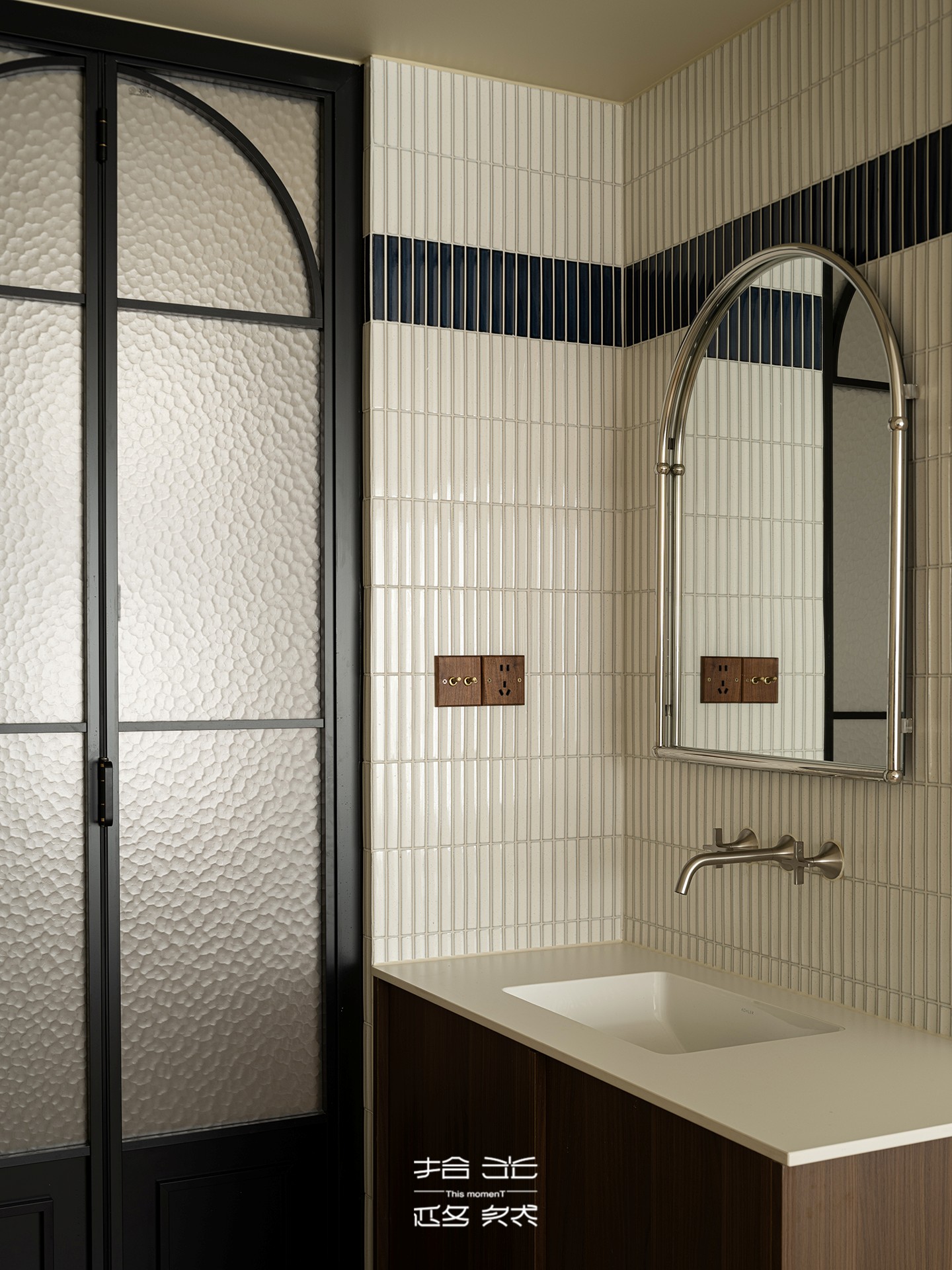 厨房的黑白长条小砖同步延伸至客卫洗漱台墙面,既强化了全屋风格的连贯性,又让小空间的质感愈发精致。即便是功能性空间,也未曾牺牲美学体验,每一处细节都彰显着设计的用心。