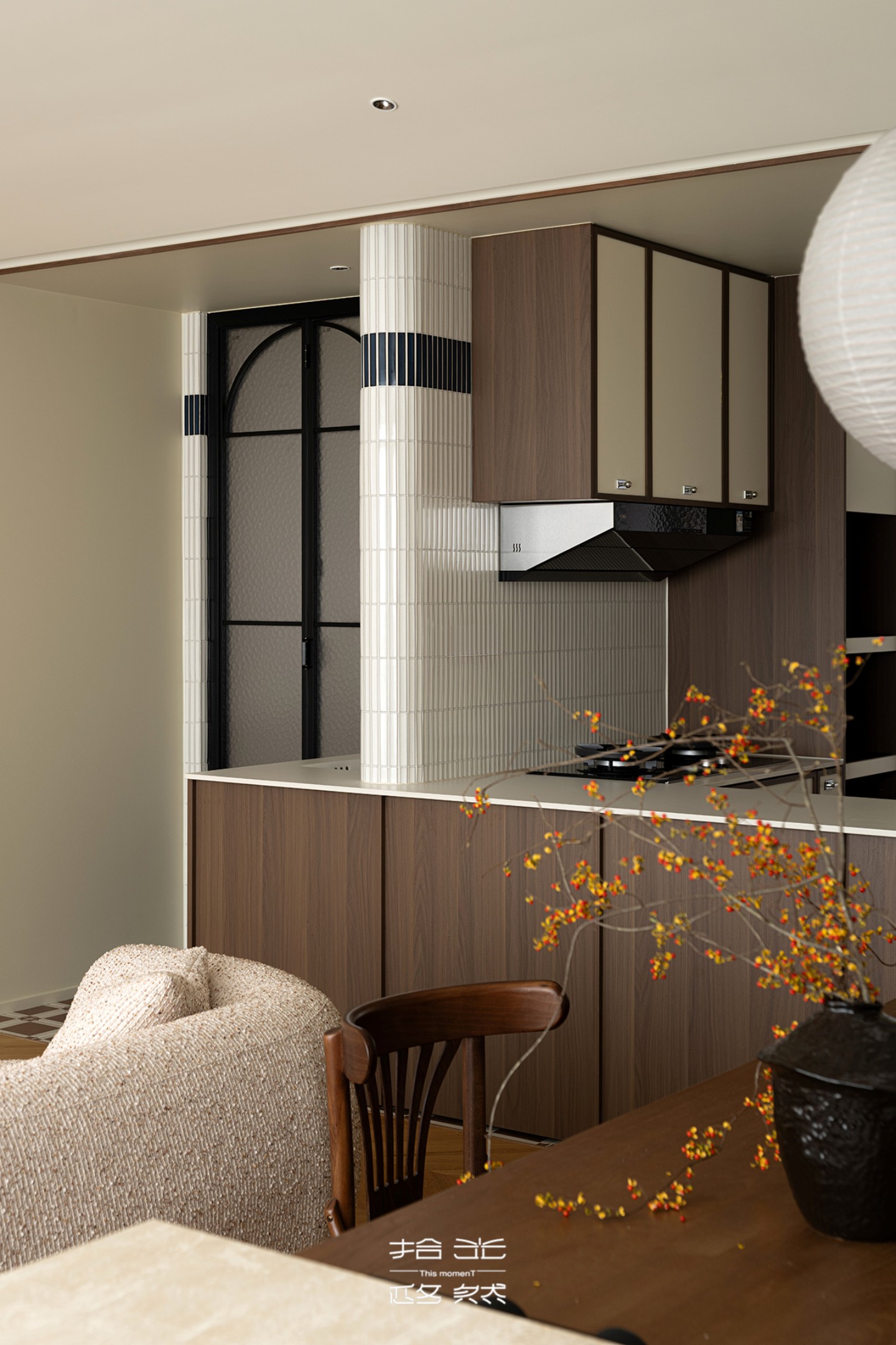 橱柜采用双面设计,面向客餐厅的一侧选用色彩同源的板材,保障了空间视觉的统一性;内侧则以 “浅色系面板 + 深棕色骨骼线” 的搭配,与客餐厅木作风格一脉相承,复古韵味油然而生。简约金属拉手作为点睛之笔,为空间注入精致细节,让定制柜体不仅是高效收纳的载体,更成为厨房的 “颜值担当”。