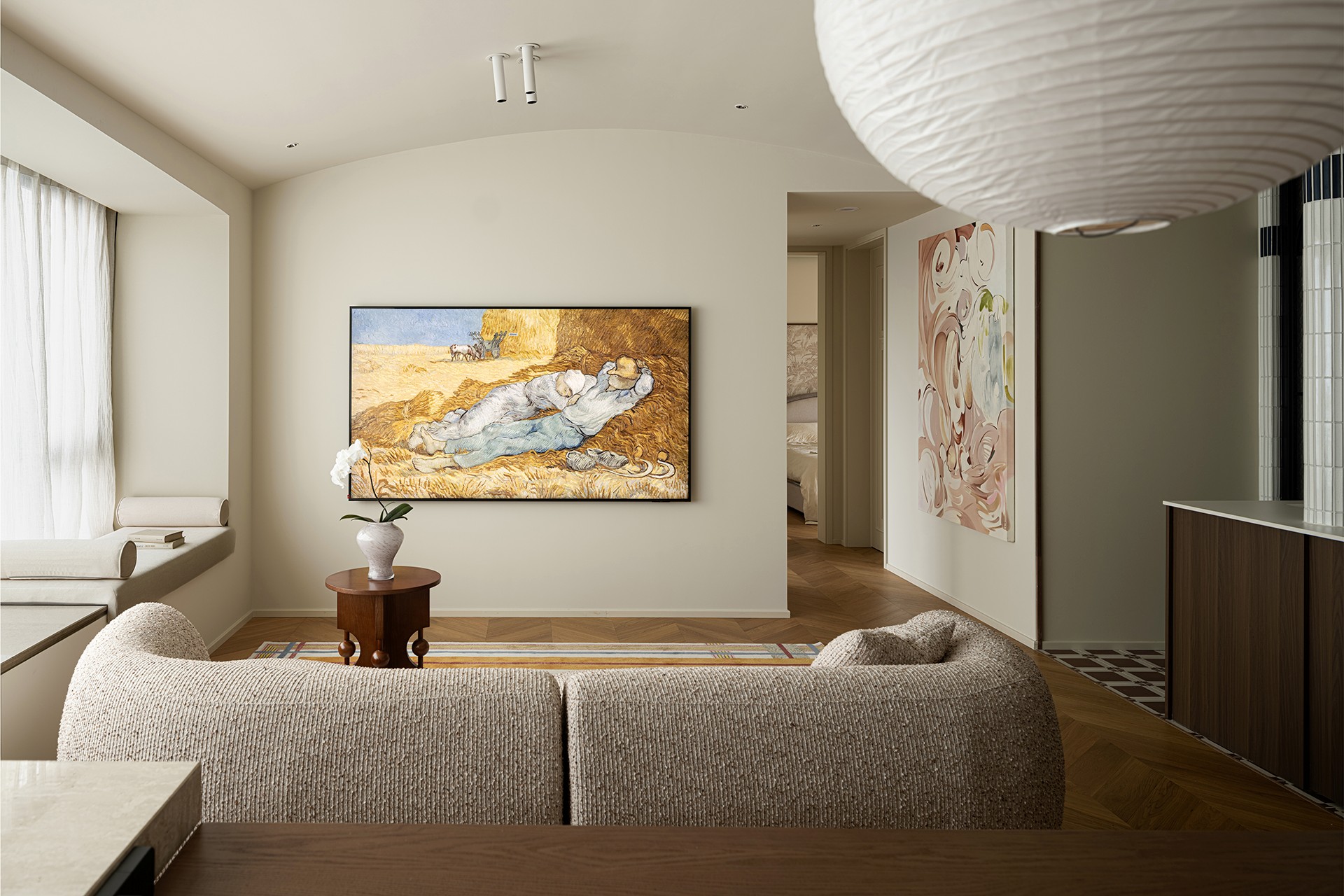 顶部的弧面吊顶与粗粝肌理的弧形沙发形成自上而下的视觉联动,彻底消解了空间的棱角感。流畅的生活动线与温柔的视觉氛围相得益彰,让人一进门便卸下外界的疲惫与喧嚣。