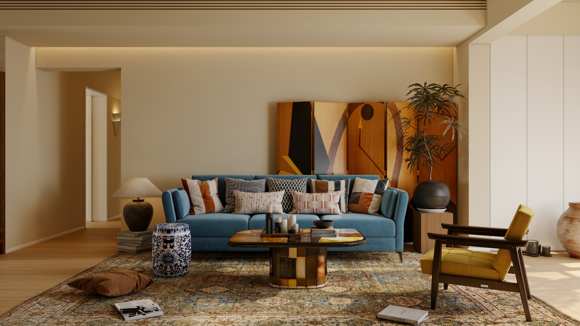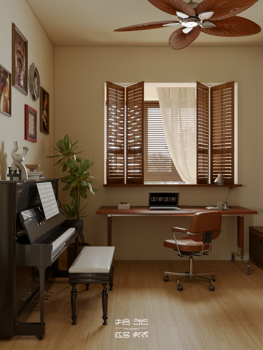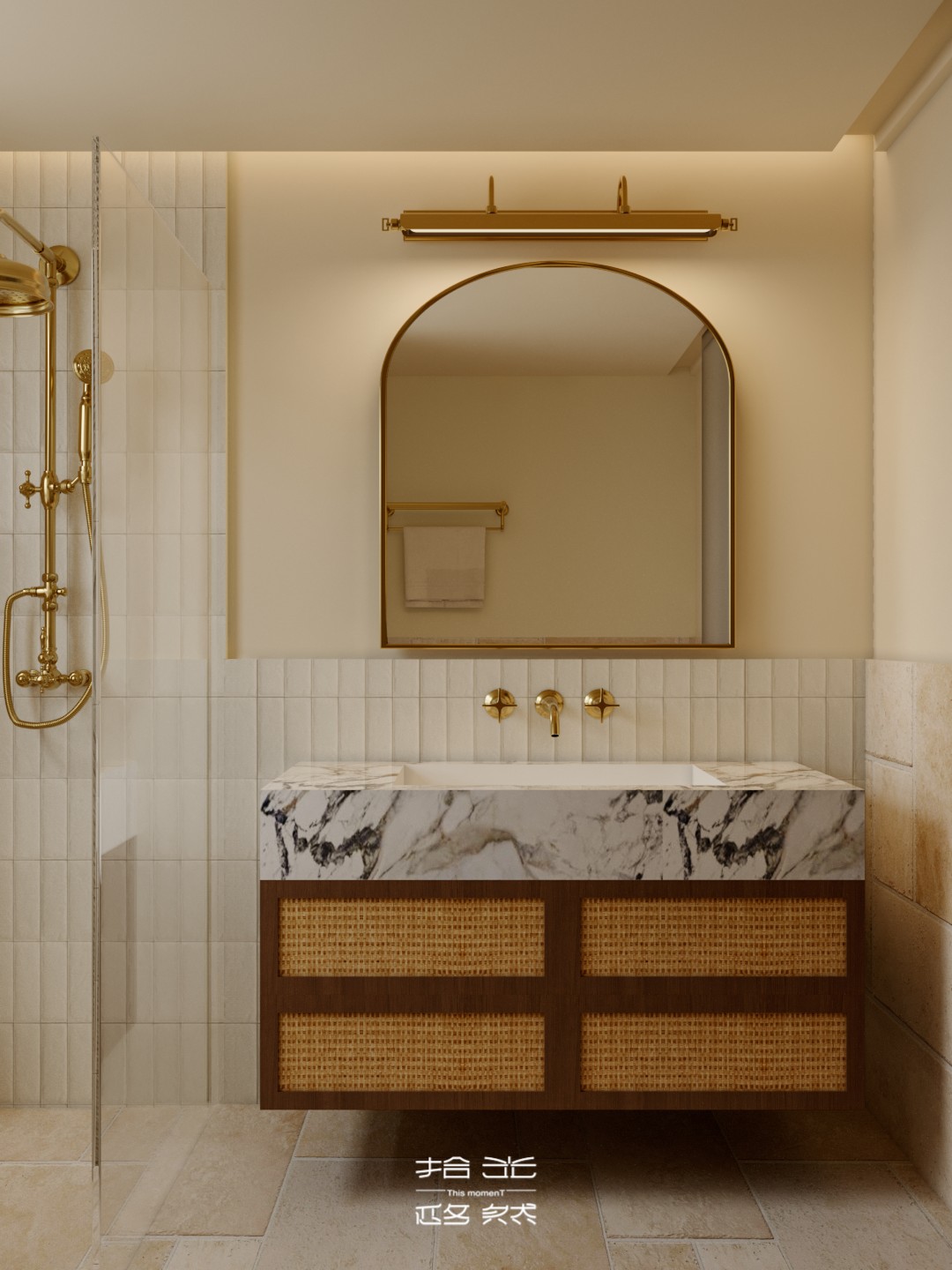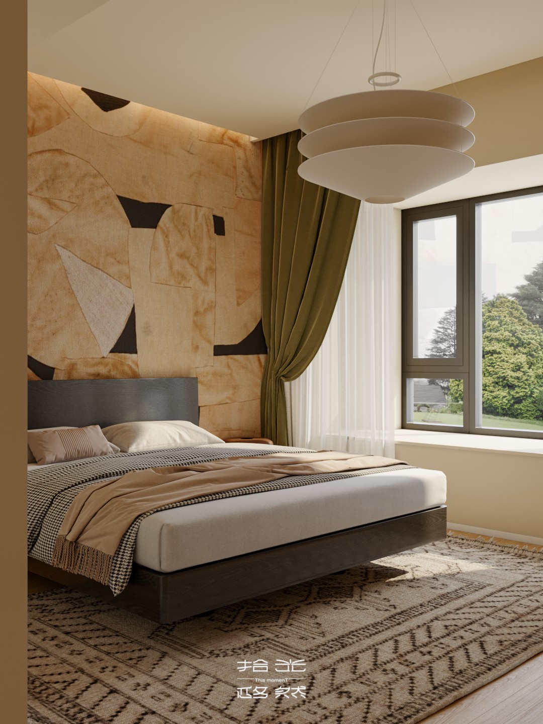 当复古不再是风格的复刻,而是设计语言的解构,这套住宅便成了一场关于质感与情绪的空间实验。设计师以暖棕为基底,用精准的材质碰撞、层次丰富的光影系统和充满叙事感的动线规划,将复古元素拆解重组,在当代生活场景中生长出既有设计张力、又能容纳烟火的居住空间。 设计的巧思藏在每一处细节的精准控制里:客厅的肌理感墙面与蓝色沙发形成色彩对冲,复古花纹地毯串联起空间层次,黄铜壁灯的金属光泽为暖棕底色注入精致感;餐厅的实木餐桌搭配藤编与铁艺混搭的座椅,刻意营造的 “不统一” 让空间更具呼吸感;主卧的橄榄绿窗帘与肌理艺术墙形成材质对话,三层叠级吊灯在睡眠区柔化光线,让设计感与舒适感达成平衡。 从钢琴区的木质百叶窗控光系统,到浴室的藤编柜与大理石台面的材质碰撞,再到走廊序列感营造的空间仪式感,每个区域都在讲述设计的逻辑 —— 它不追求表面的复古符号,而是通过材质、光影与动线的交织,让复古成为一种可感知的空间情绪,最终让家既是屋主青睐的设计范本,也是能承载日常烟火的温暖容器。
