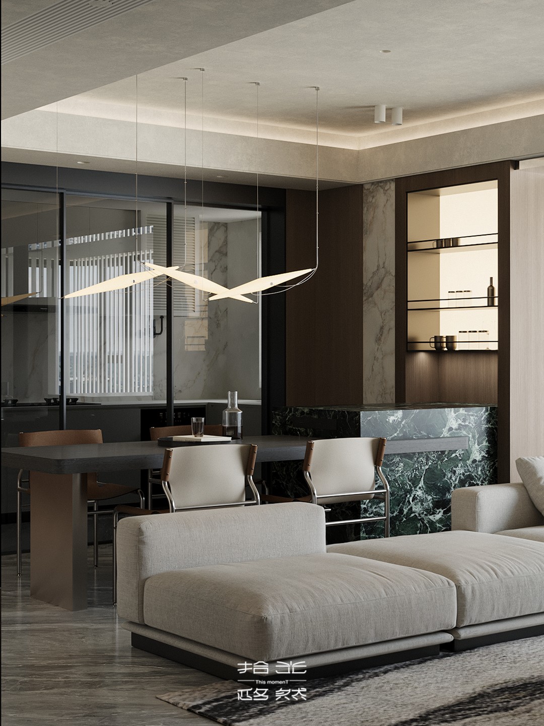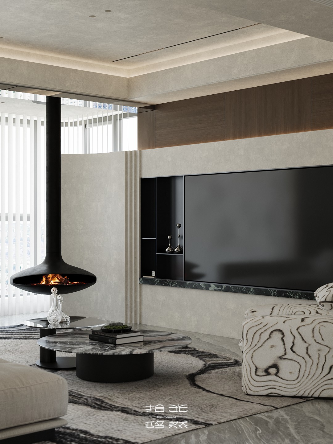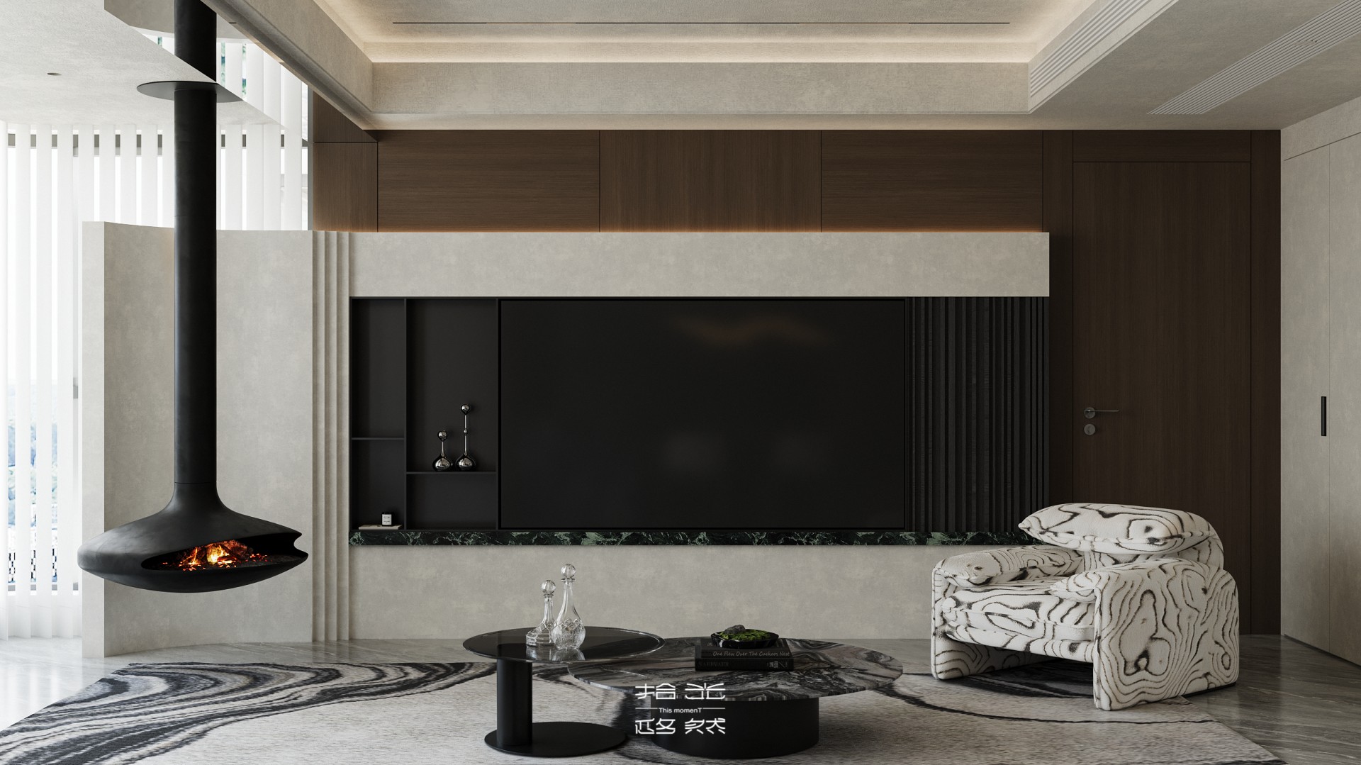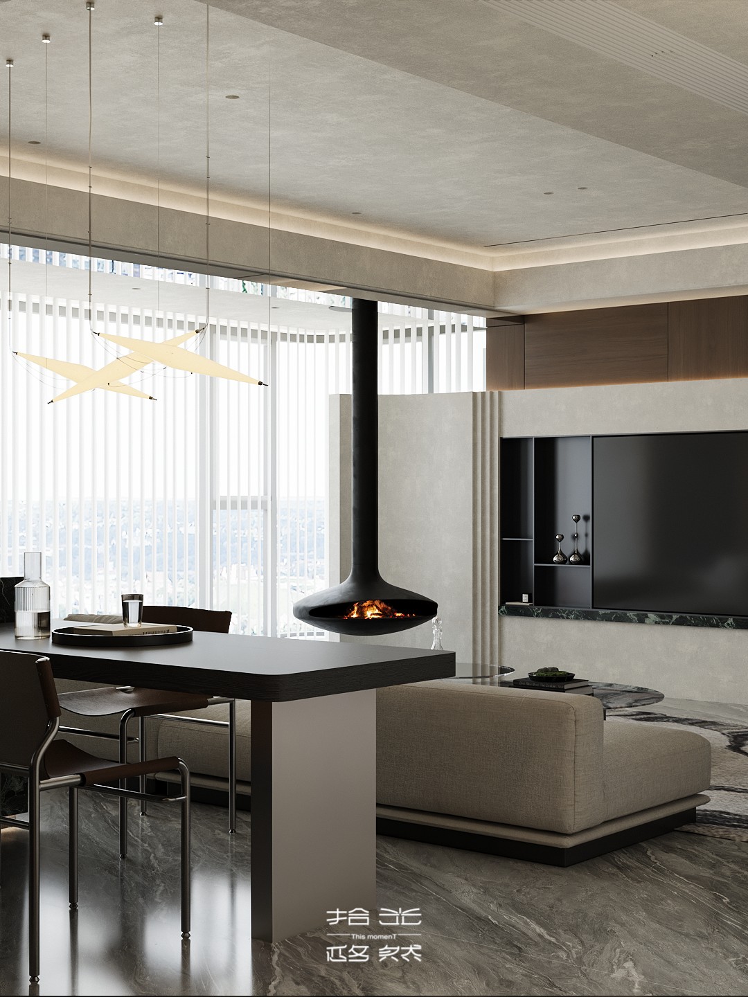 傍晚的风穿过竖百叶窗,悬浮壁炉里的火光在微水泥墙面漾开暖纹,男主人窝在艺术感单人椅里翻书,开放式餐厨区飘来刚烤好的巴斯克香气。这套 124㎡的精装房没有困在标准化的模板里,设计团队以「材质层次化、空间无界化、功能场景化」为核心策略,在保留原有结构的基础上,用精准的设计巧思打破精装房的刻板印象,让空间既承载都市精英的质感日常,也容纳一家人的松弛相处。 设计的核心,在于重构精装房的空间逻辑与质感表达:拆除冗余墙体,让客餐厨三大公区形成洄游动线,阳光从落地窗涌入时,能穿透整个公共空间;以低饱和米灰为基底,用深色木饰面、墨绿大理石与微水泥形成材质碰撞,在极简框架下注入温润层次;悬浮壁炉作为视觉锚点,搭配艺术感单人椅与水纹地毯,让都市客厅拥有壁炉旁的松弛仪式感;整屋隐藏式收纳系统与墙面齐平,将功能需求隐于美学秩序之下,让空间既整洁又充满设计张力。 从公共区的开阔通透到私密区的静谧包裹,从材质的精准碰撞到功能的场景营造,每一处设计都在回应「精装房如何拥有专属质感」的命题。它没有彻底推翻原有结构,而是用设计的力量激活空间潜能。