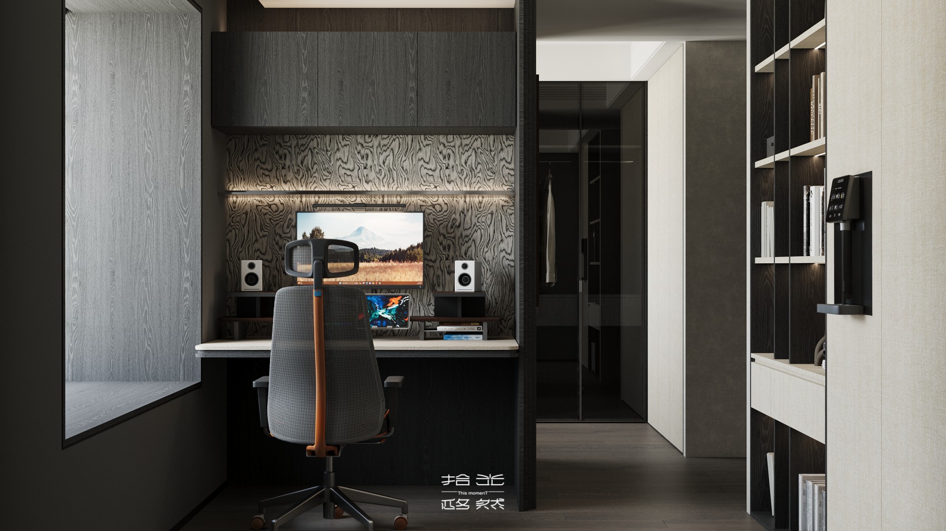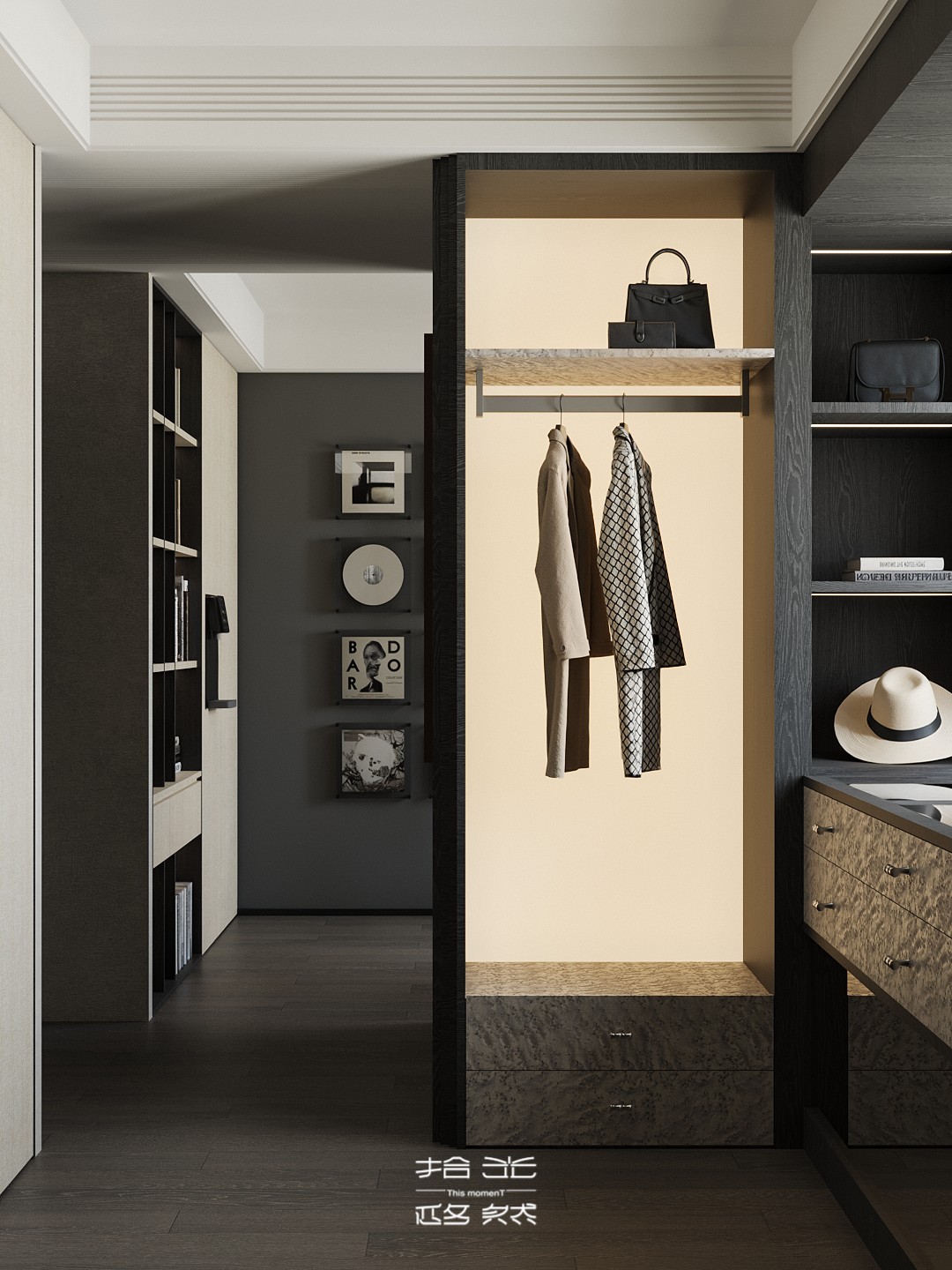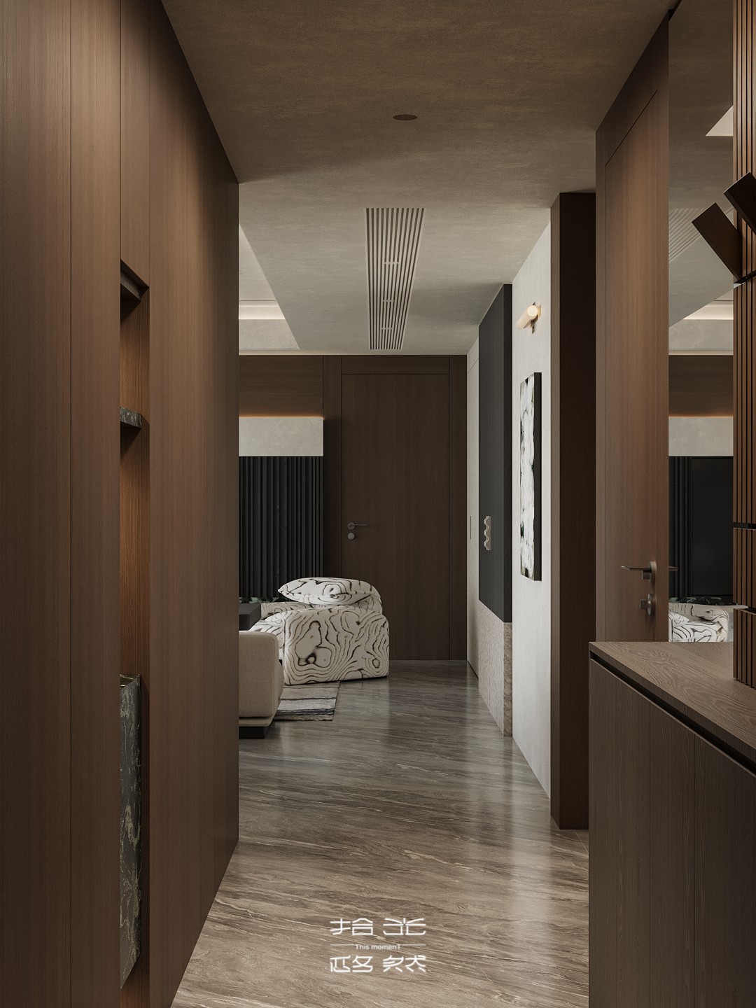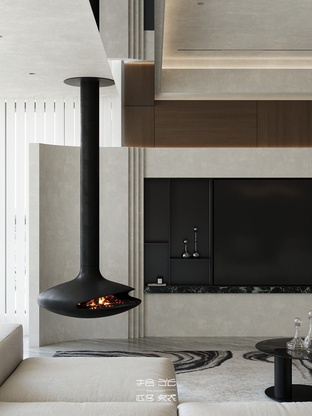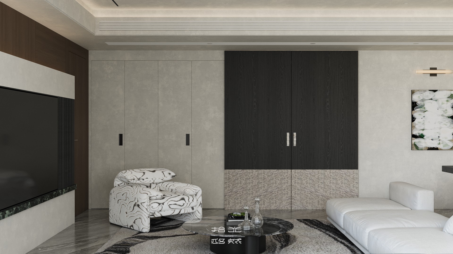 傍晚的风穿过竖百叶窗,悬浮壁炉里的火光在微水泥墙面漾开暖纹,男主人窝在艺术感单人椅里翻书,开放式餐厨区飘来刚烤好的巴斯克香气。这套 124㎡的精装房没有困在标准化的模板里,设计团队以「材质层次化、空间无界化、功能场景化」为核心策略,在保留原有结构的基础上,用精准的设计巧思打破精装房的刻板印象,让空间既承载都市精英的质感日常,也容纳一家人的松弛相处。 设计的核心,在于重构精装房的空间逻辑与质感表达:拆除冗余墙体,让客餐厨三大公区形成洄游动线,阳光从落地窗涌入时,能穿透整个公共空间;以低饱和米灰为基底,用深色木饰面、墨绿大理石与微水泥形成材质碰撞,在极简框架下注入温润层次;悬浮壁炉作为视觉锚点,搭配艺术感单人椅与水纹地毯,让都市客厅拥有壁炉旁的松弛仪式感;整屋隐藏式收纳系统与墙面齐平,将功能需求隐于美学秩序之下,让空间既整洁又充满设计张力。 从公共区的开阔通透到私密区的静谧包裹,从材质的精准碰撞到功能的场景营造,每一处设计都在回应「精装房如何拥有专属质感」的命题。它没有彻底推翻原有结构,而是用设计的力量激活空间潜能。