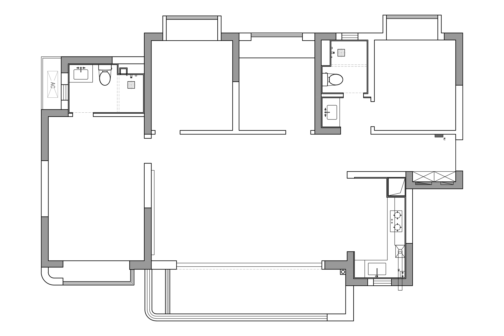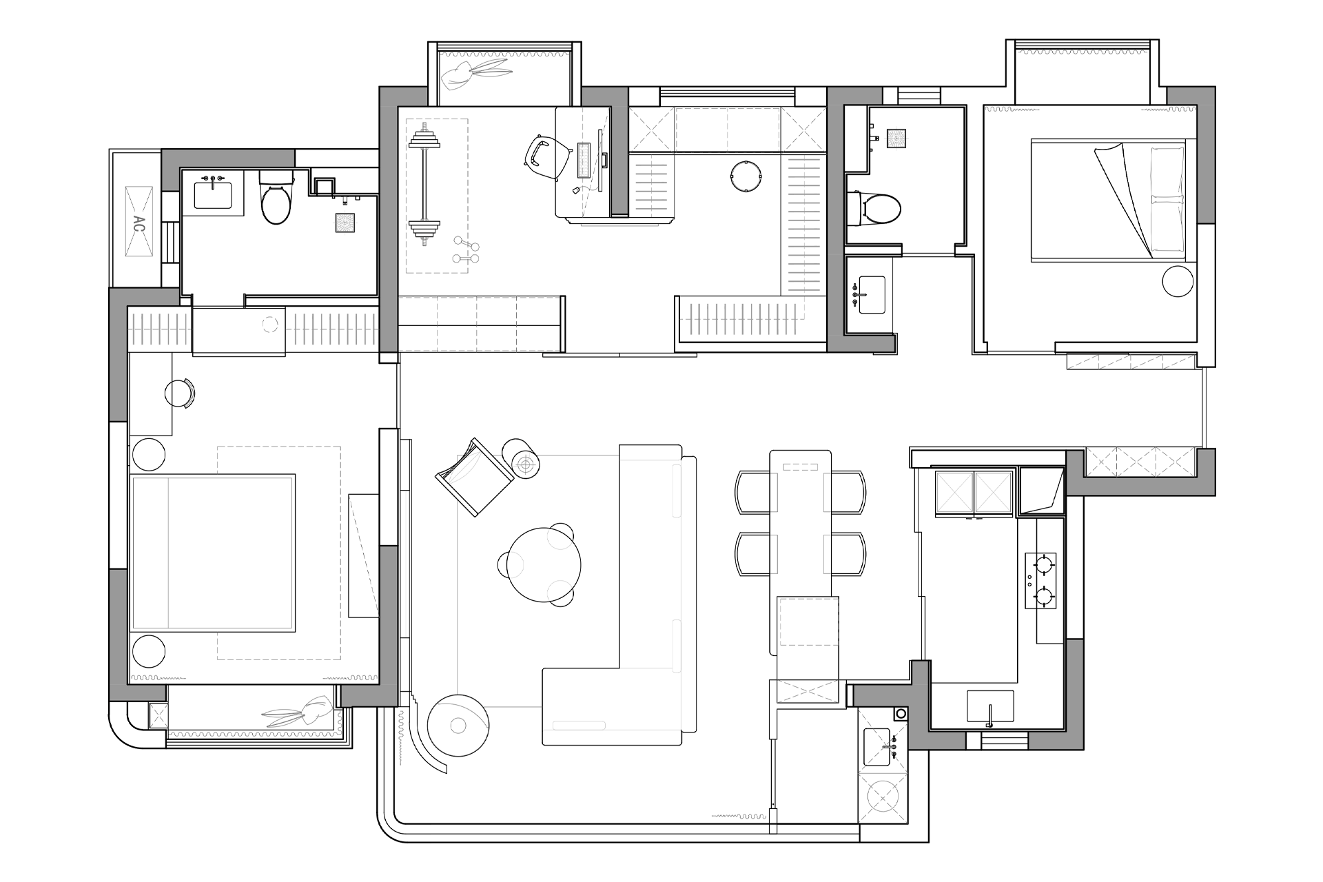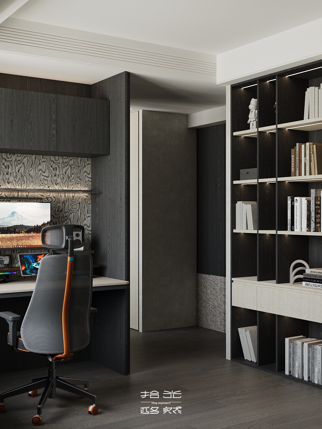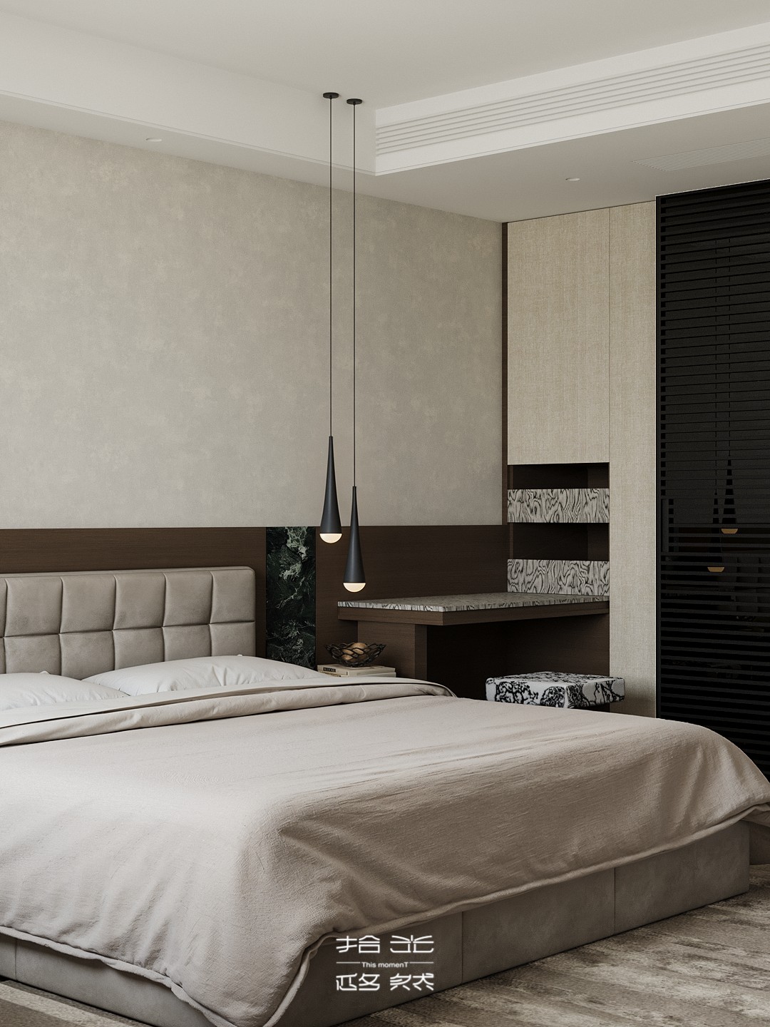 傍晚的风穿过竖百叶窗,悬浮壁炉里的火光在微水泥墙面漾开暖纹,男主人窝在艺术感单人椅里翻书,开放式餐厨区飘来刚烤好的巴斯克香气。这套 124㎡的精装房没有困在标准化的模板里,设计团队以「材质层次化、空间无界化、功能场景化」为核心策略,在保留原有结构的基础上,用精准的设计巧思打破精装房的刻板印象,让空间既承载都市精英的质感日常,也容纳一家人的松弛相处。 设计的核心,在于重构精装房的空间逻辑与质感表达:拆除冗余墙体,让客餐厨三大公区形成洄游动线,阳光从落地窗涌入时,能穿透整个公共空间;以低饱和米灰为基底,用深色木饰面、墨绿大理石与微水泥形成材质碰撞,在极简框架下注入温润层次;悬浮壁炉作为视觉锚点,搭配艺术感单人椅与水纹地毯,让都市客厅拥有壁炉旁的松弛仪式感;整屋隐藏式收纳系统与墙面齐平,将功能需求隐于美学秩序之下,让空间既整洁又充满设计张力。 从公共区的开阔通透到私密区的静谧包裹,从材质的精准碰撞到功能的场景营造,每一处设计都在回应「精装房如何拥有专属质感」的命题。它没有彻底推翻原有结构,而是用设计的力量激活空间潜能。