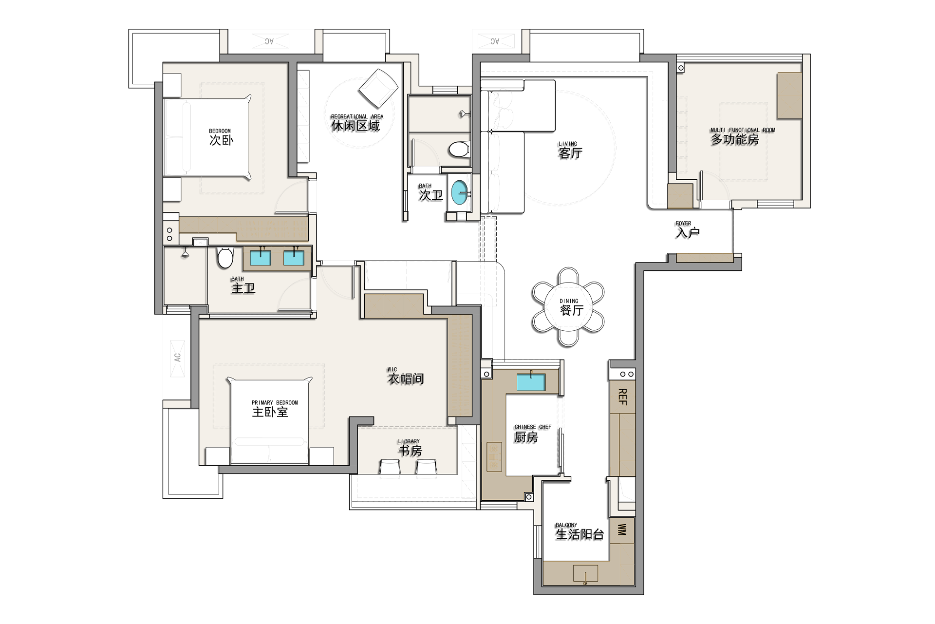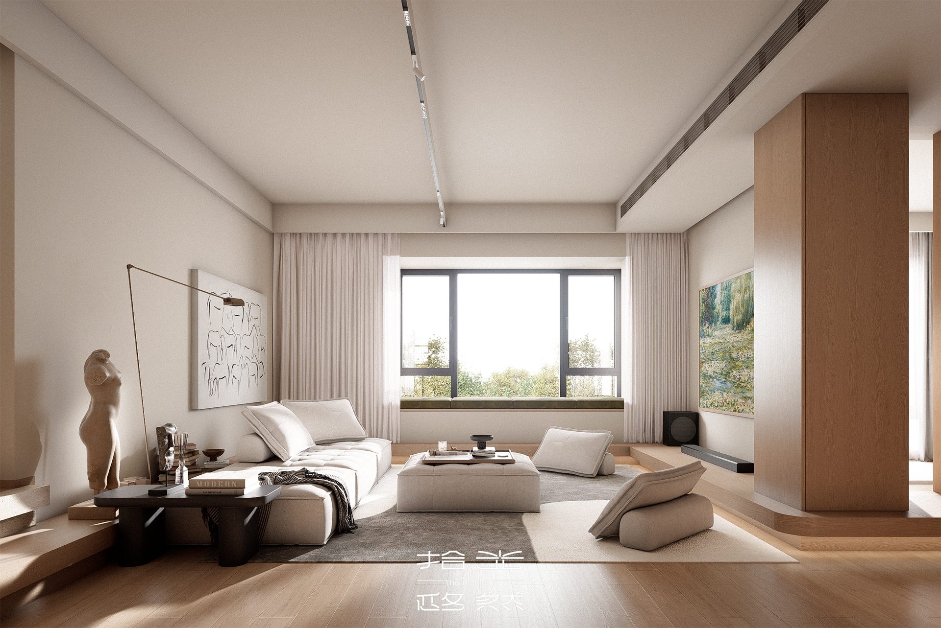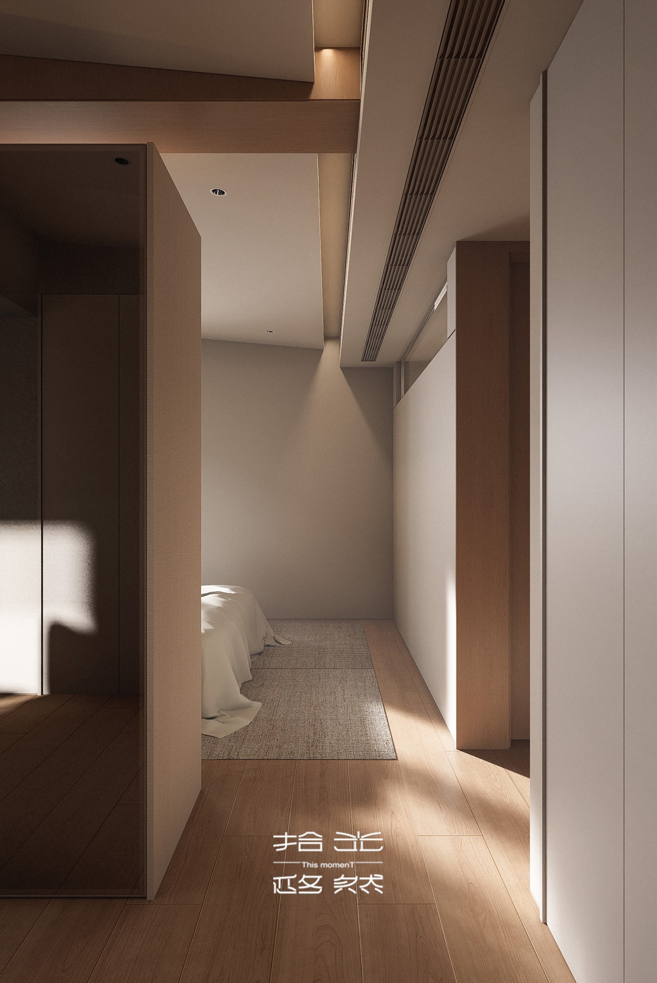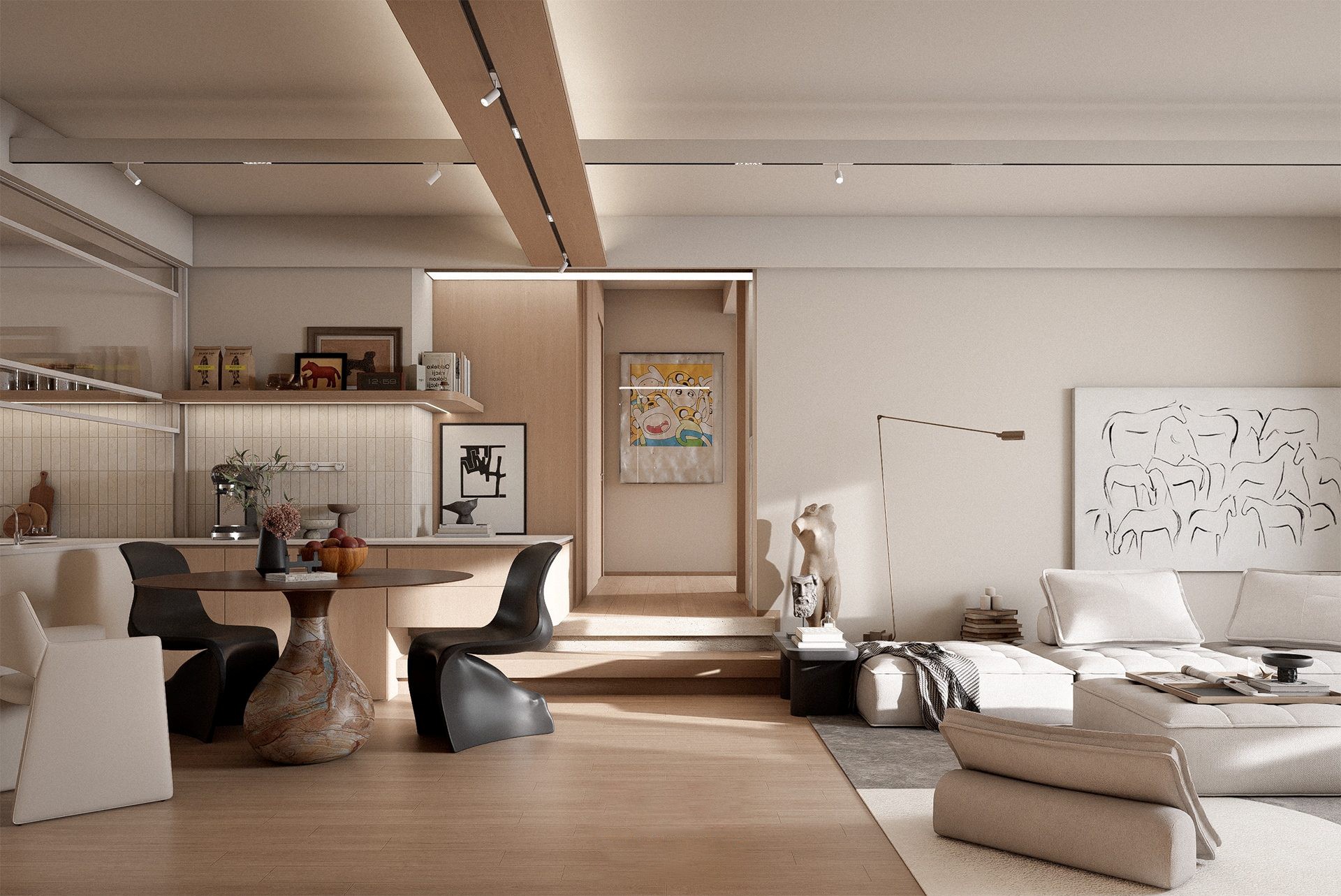 这套 155㎡的旧房改造项目,我们以「去繁就简、回归本真」为核心,打破原有空间的刻板格局,用温润木色与低饱和柔色为基底,让光与风在空间里自由流动,为三口之家打造一处无压、舒适、充满生活温度的疗愈居所。 原始户型的封闭隔墙,割裂了客餐厅与厨房的互动性,也压缩了公共空间的采光与尺度。我们拆除了不必要的墙体,将餐厨、客厅、书房等功能区以开放式或半开放式的方式串联,打造出洄游式的 LDK 一体化公区。浅木色的地台与墙面、温润的橡木柜体,在统一的材质语言里,弱化了空间的边界感;无主灯设计搭配线性灯与轨道灯,让自然光与人工光交织,在一天中呈现出柔和的光影层次,也让整个家的氛围更显松弛。