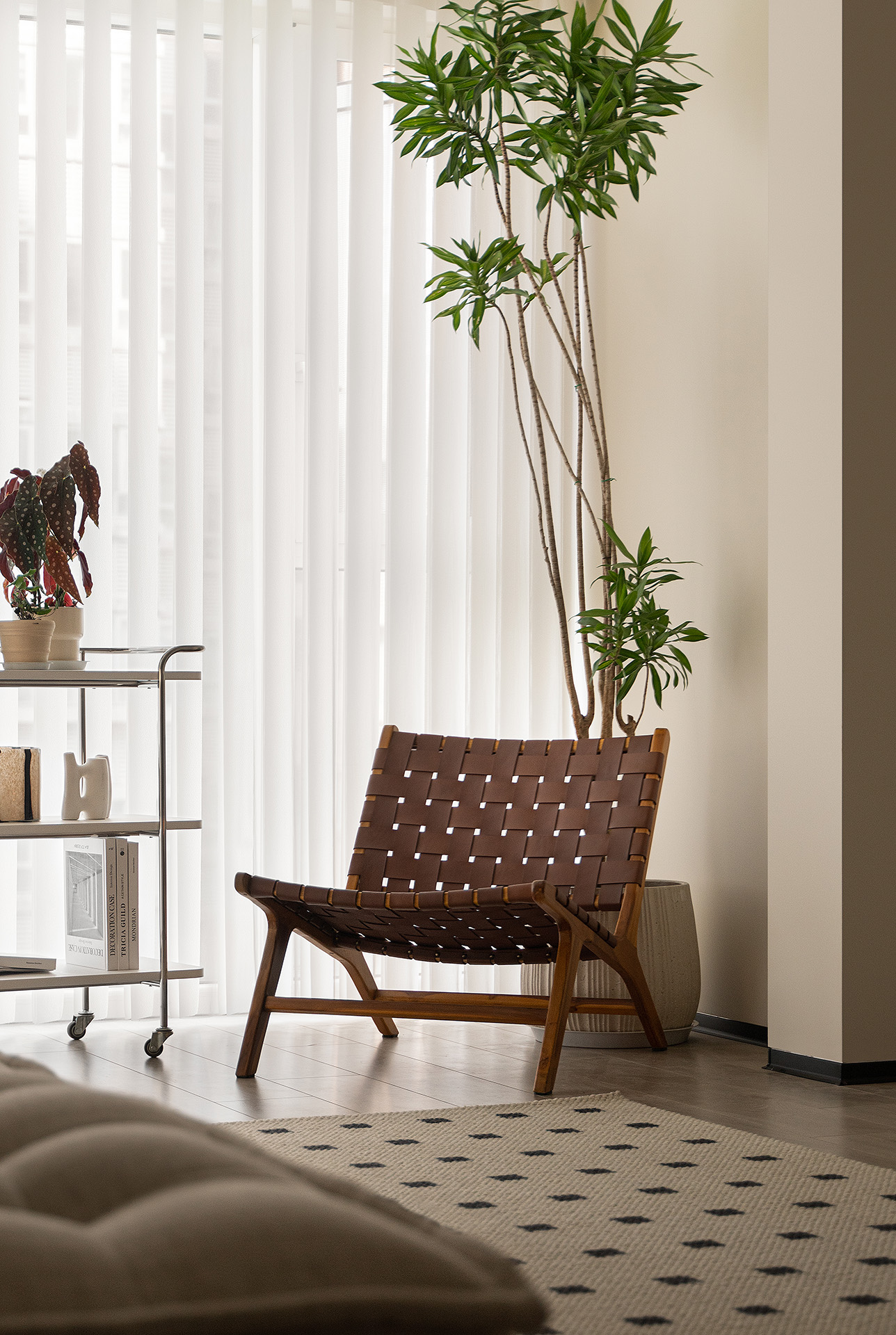 原始的阳台狭长、独立,于是将阳台并入客厅空间,增加客厅的使用面积,又让阳光没有阻碍,照射到公共空间更深入的地方。百合竹、鳟鱼秋海棠、乳脉千年芋……在客厅中散发着生机与绿意。
