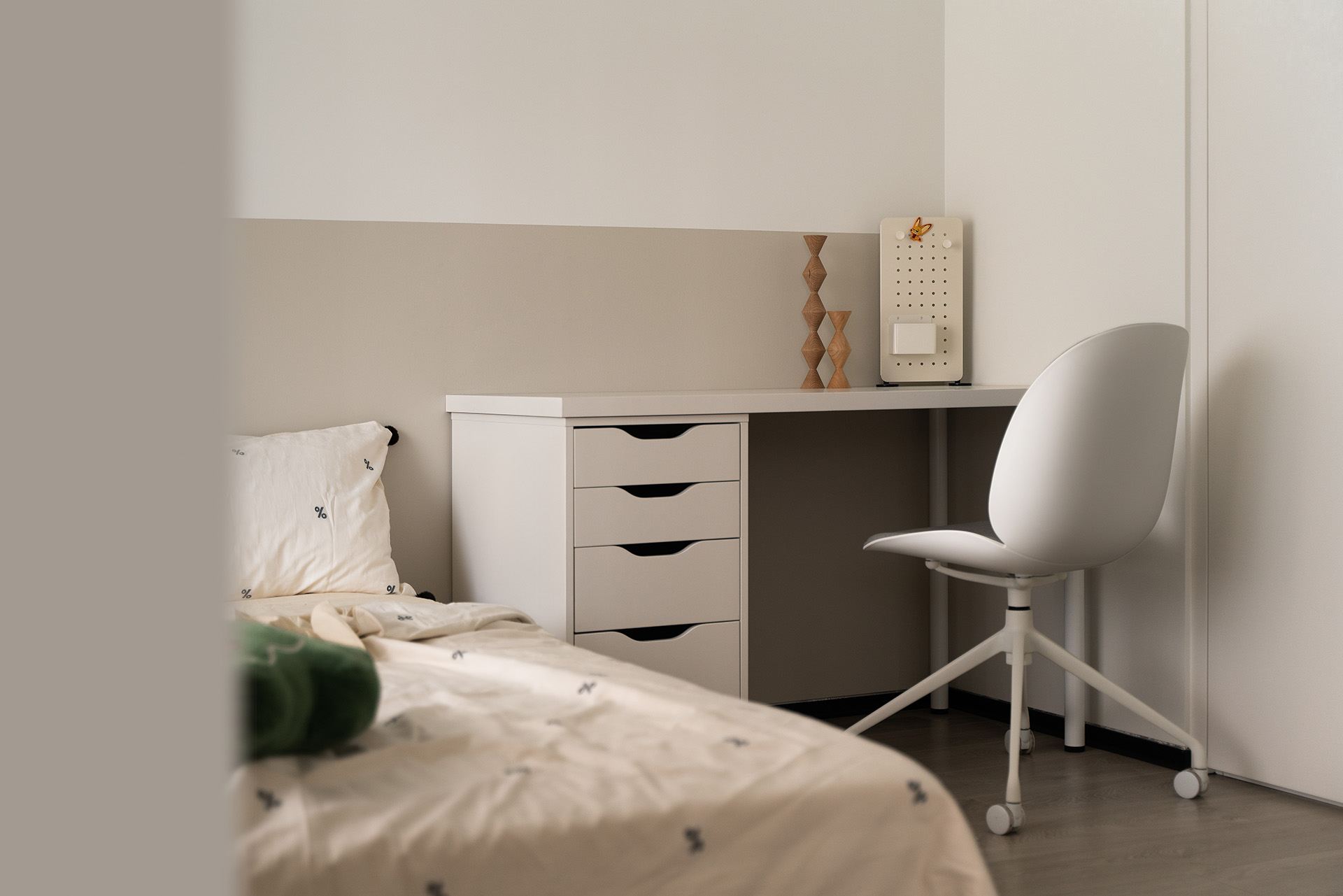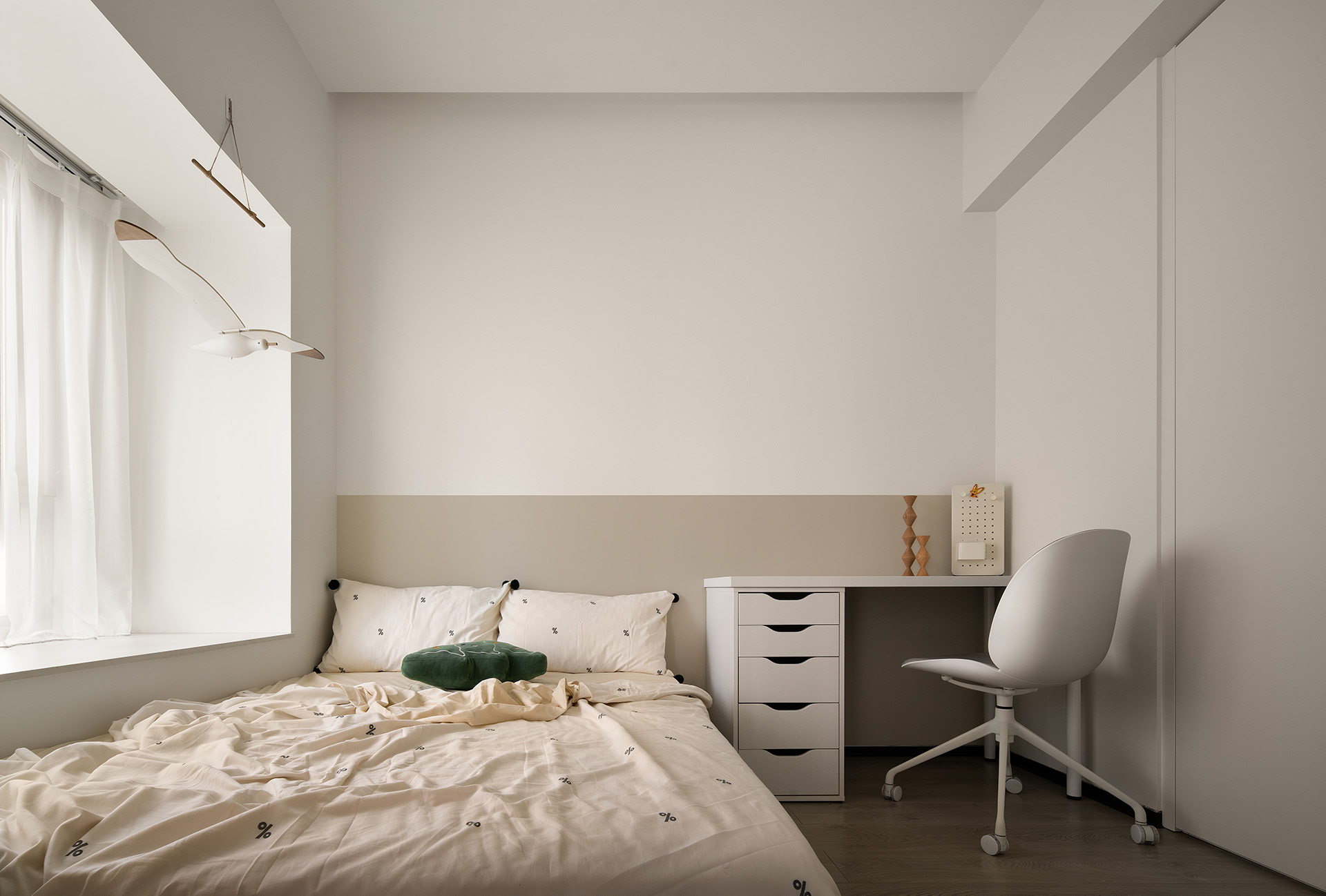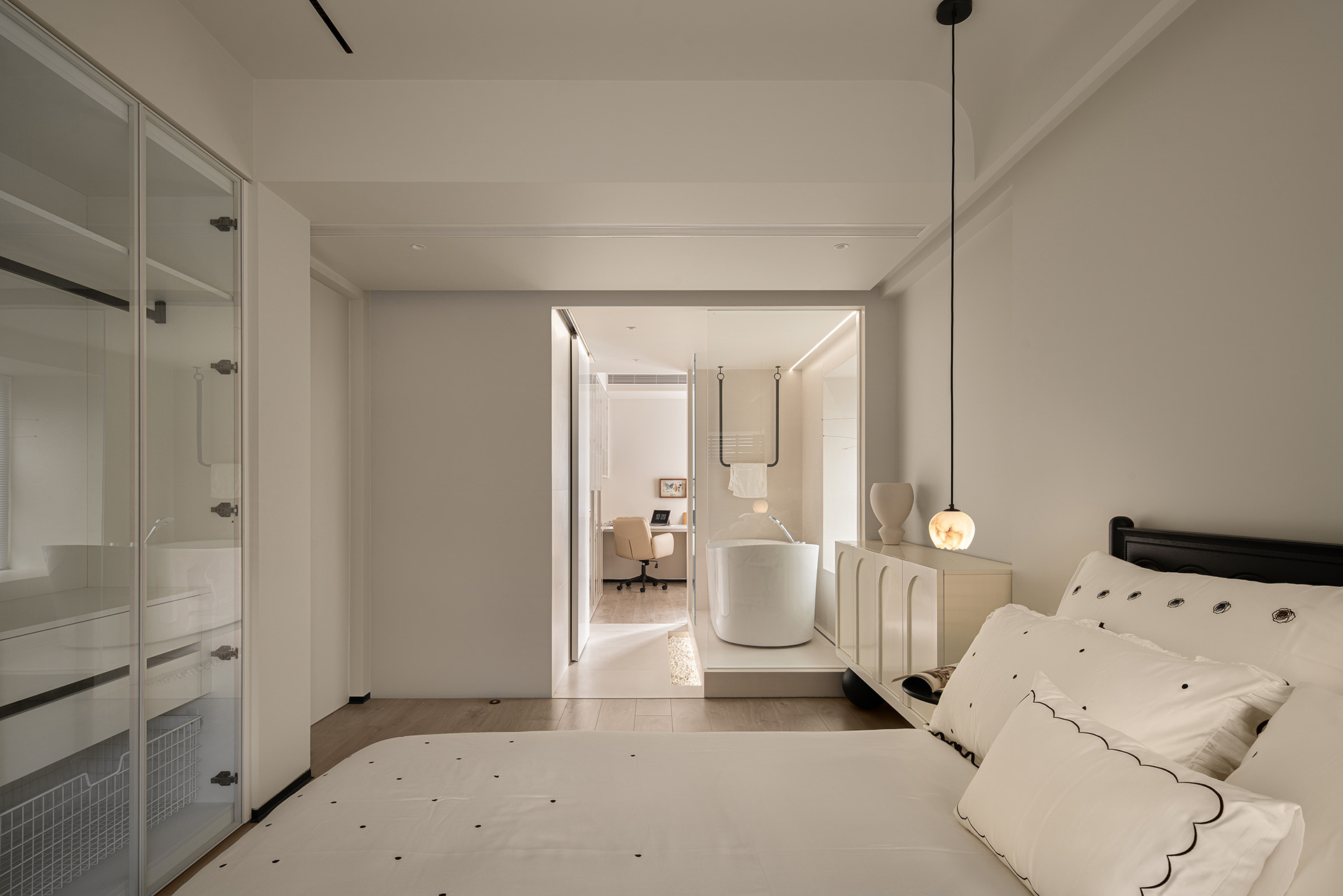 将原本的主卧与旁边的房间连通,成为现在寝居+卫浴+书房的套房形式。整个主卧采用同色乳胶漆(佐敦1376),洁净而又淡雅。顶面的弧形吊顶,弱化房屋阴角的锐利感,从床上看去,感到圆润舒适。采用无主灯的设计,让寝居空间保持舒适的休息氛围。