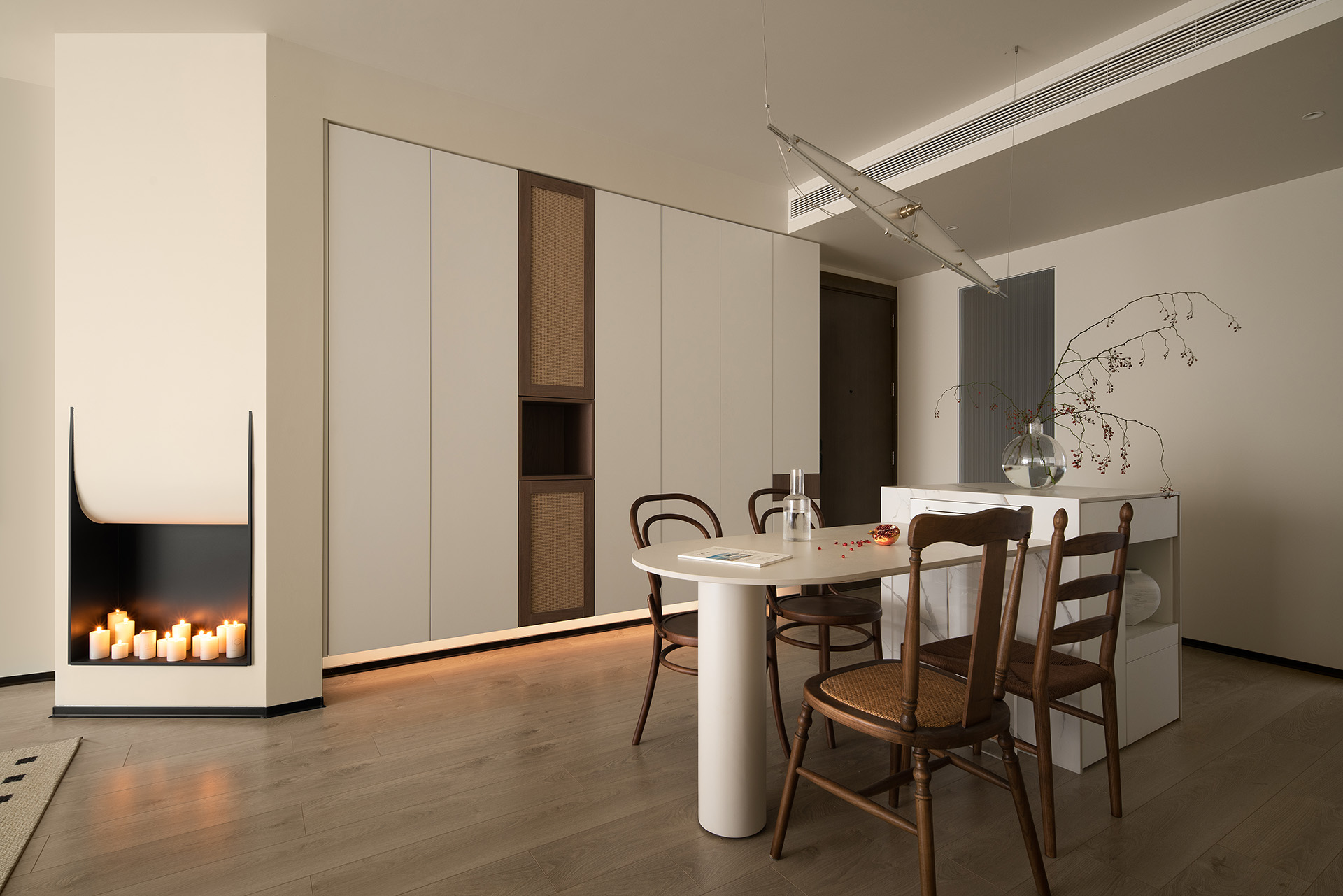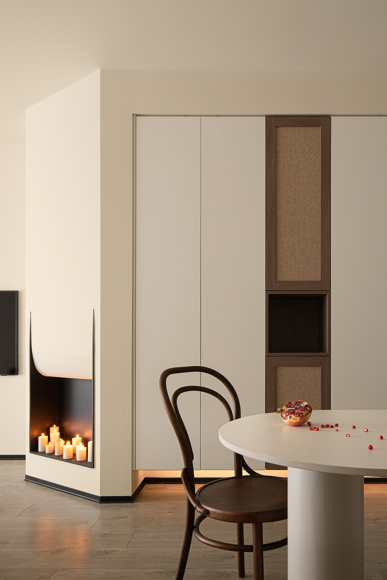 入户左边是“U然木作”定制的一整面柜体。这里除了日常可以存放的鞋子、杂物之外,还增加了存放家政区域,吸尘器、清洁用品等等物品都能收纳在这个柜子里。此外,白色的柜体中间以藤编柜门作为点缀,整理利落中又增添了些许的情致。