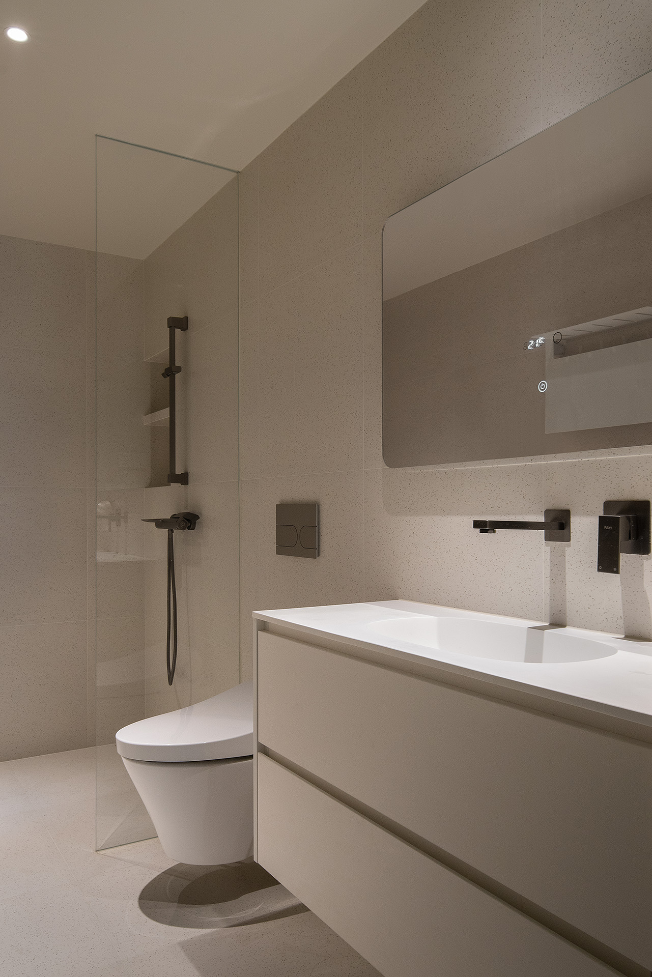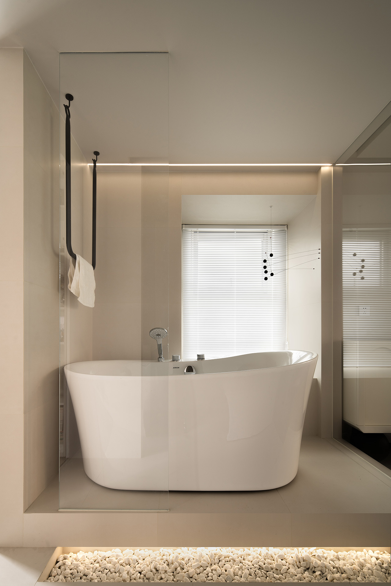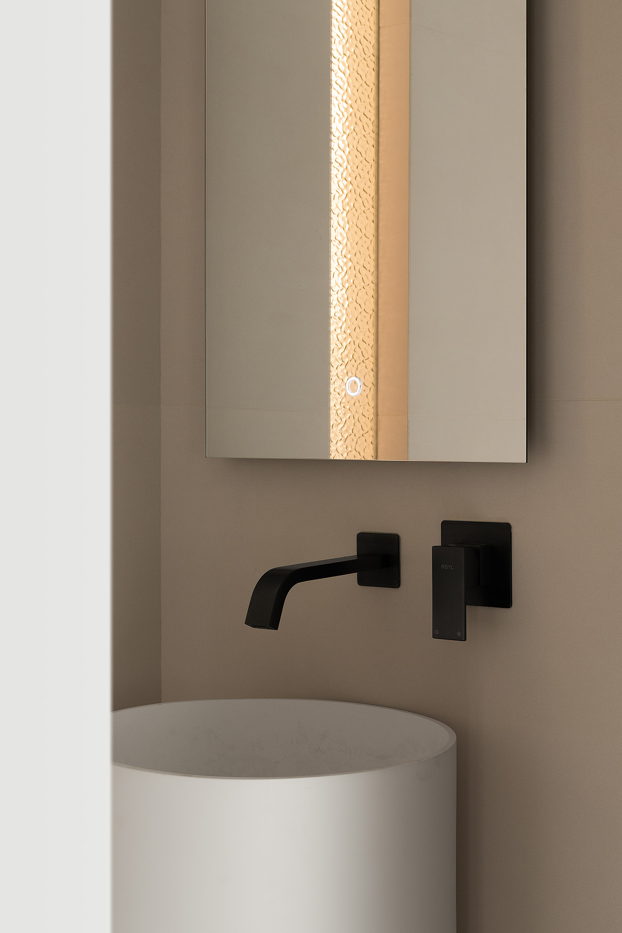 寝居空间与书房之间要穿过主卫。开放的浴缸不仅具有功能性,同样也为主卧带来高级的美感。盥洗室,没有采用传统的方形台盆,圆柱的洗手台与圆润的浴缸两相呼应。