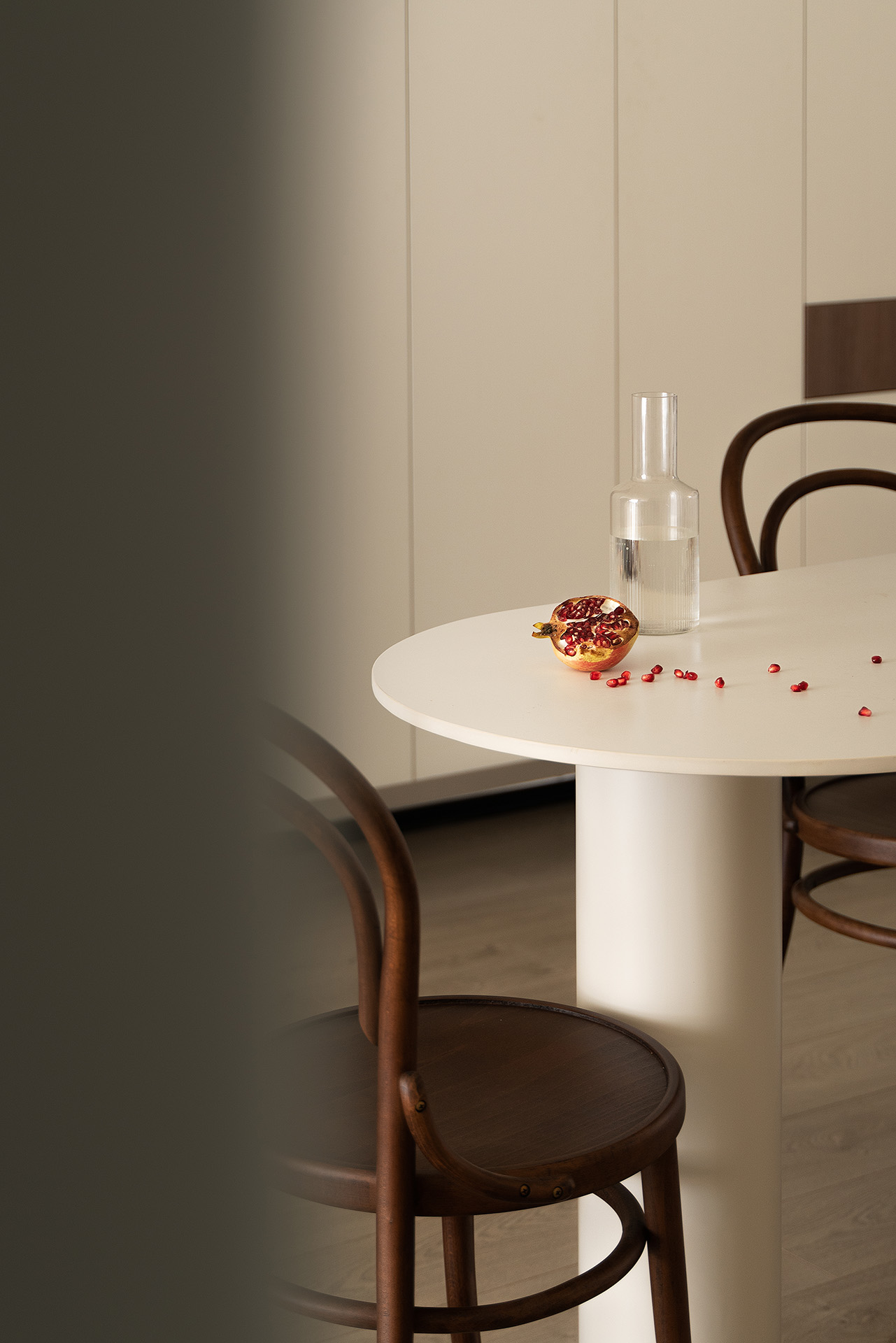 客厅旁边的餐厅,以餐桌+岛柜的形式呈现。让餐厅增加了不少功能。为帆帆一家特别设计的岛柜,中层的抽屉板拥有较高的空间,并且预留了电源,他们可以在这里使用电热水壶、电饭煲等小家电,成为帆帆他们不费力生活的开端。