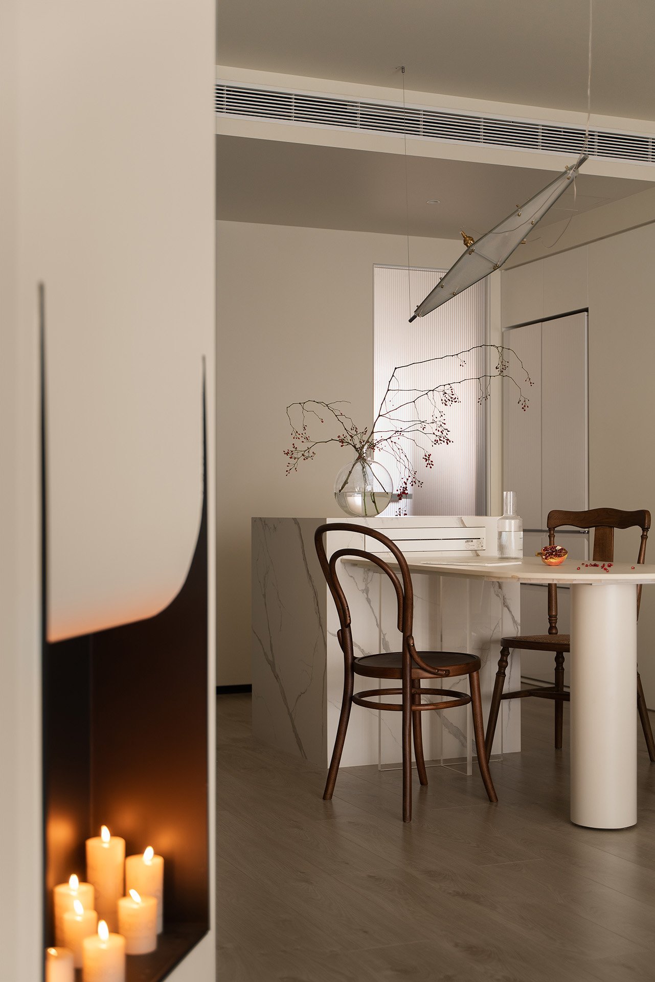 餐厅选用陈星宇的Fragmet系列吊灯。它采用常见的教堂拱顶吊灯造型,与现代工艺相结合。灯具采用不锈钢和超小纹路玻璃使光线得以延展,以及可人性化调节光冷暖的细节,科技感十足的同时,又实用到位。