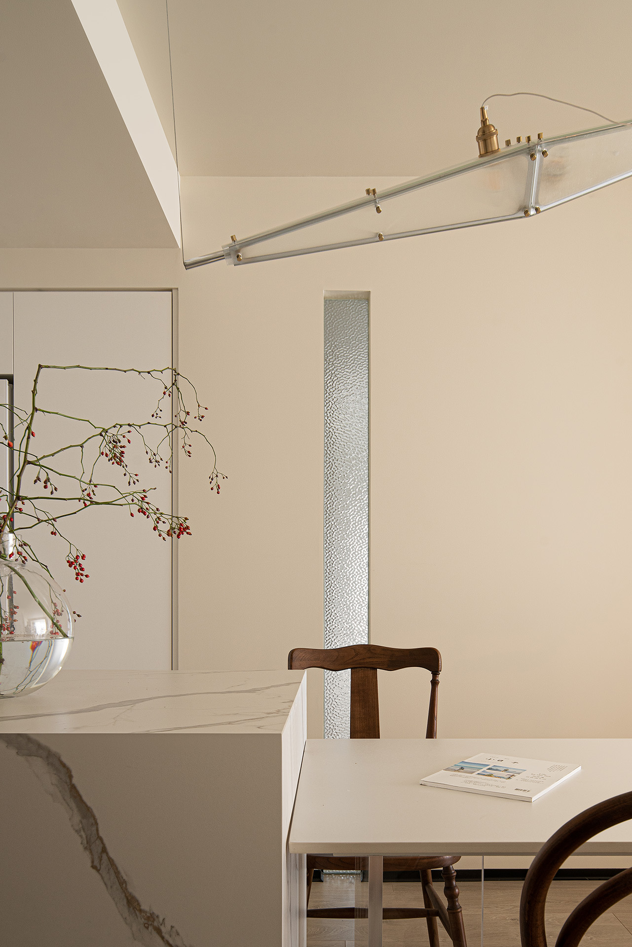 餐厅背后的墙面,利用近似水波纹路的玻璃隔断,做了一道玻璃隔断。主卫的阳光能够延伸到餐厅空间,但又能保持主卫的私密性。