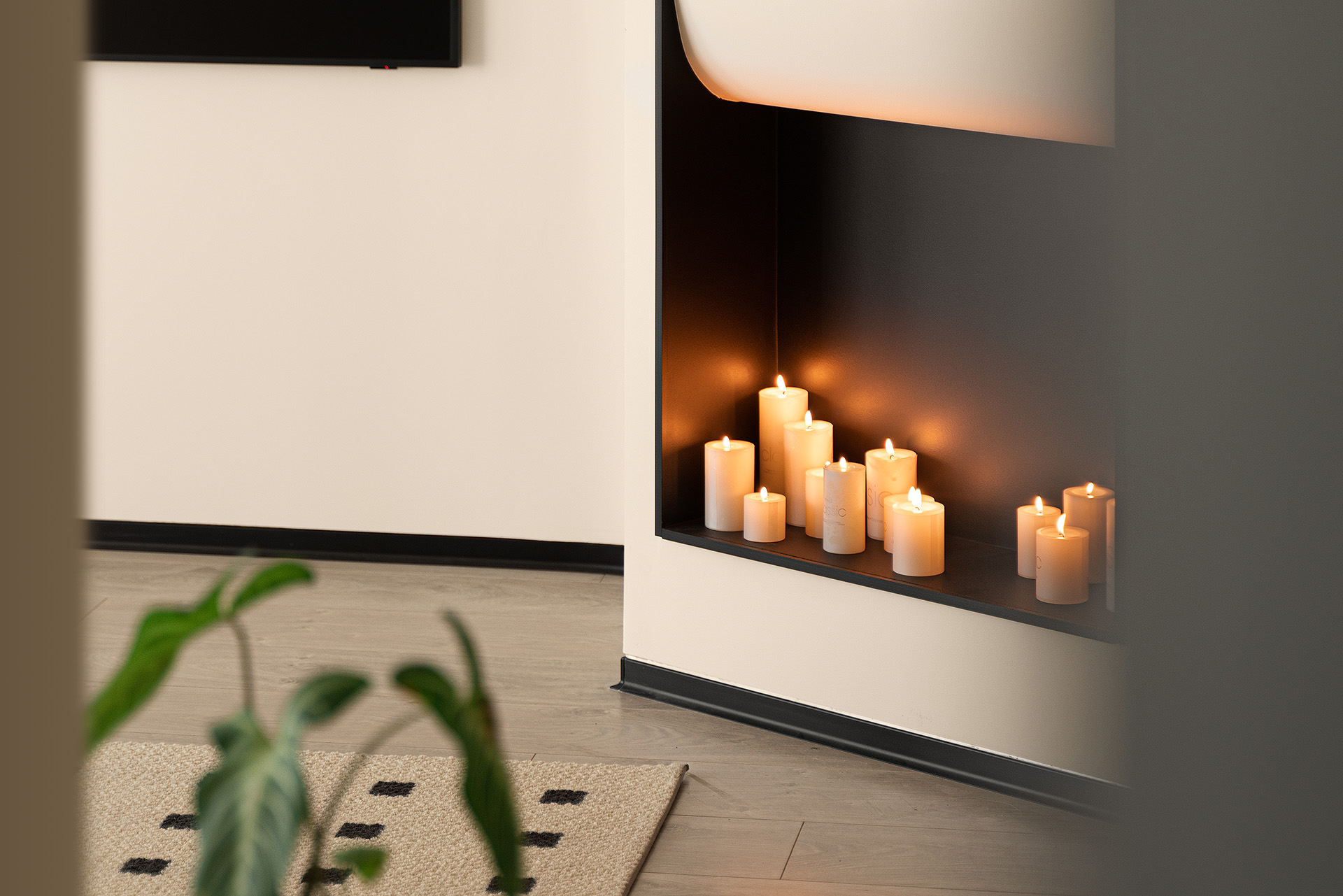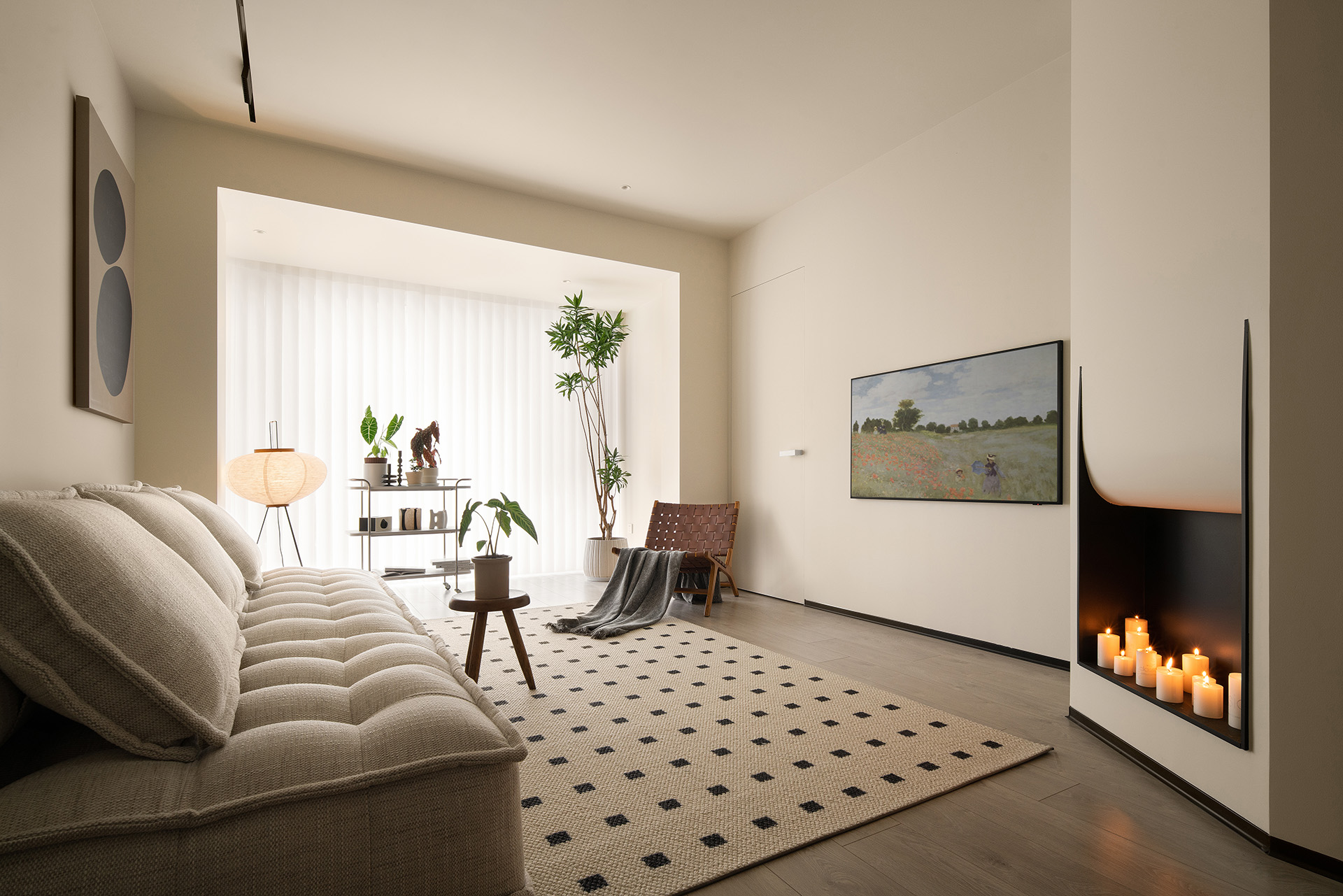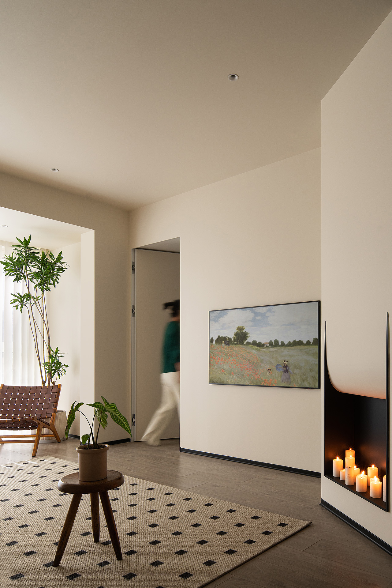 要是客厅结构里有一个斜角你会怎么处理?在帆帆他们的家,设计师并没有将其隐藏起来,而是利用这个斜角做了一个小小的装饰壁炉。点上蜡烛,温暖的烛光让客厅的氛围感大幅提升。