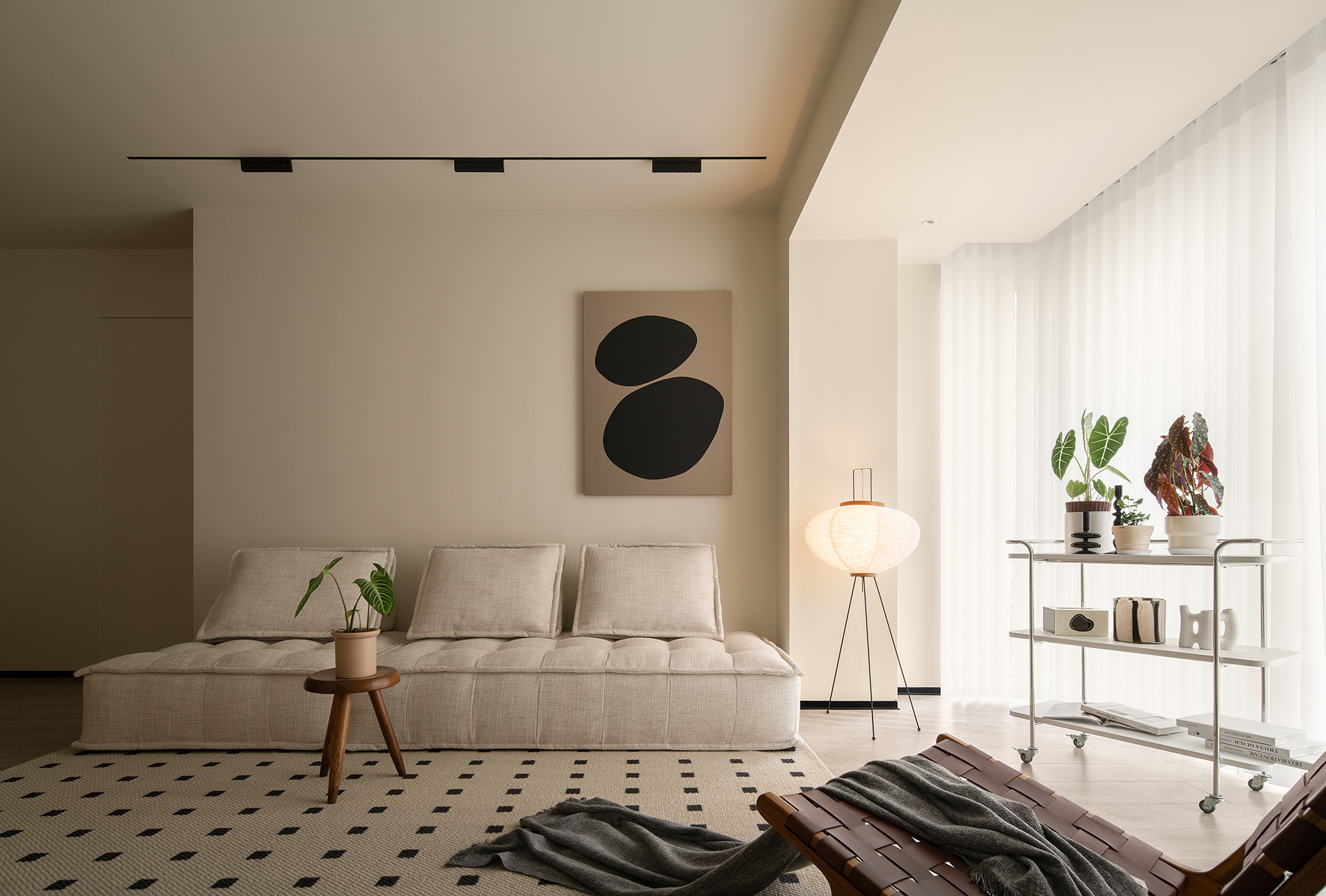 相较于主光源或较硬性的灯光,帆帆更喜欢氛围灯光,让整个空间舒适、明亮却又不刺眼。舒适、好躺,是帆帆对于客厅的基础要求。松弛感的生活方式,当然要在家的任何角落可以舒适休息。整个公共区域选用乳胶漆(佐敦1875)通刷,简洁中不失生活的暖暖情意。