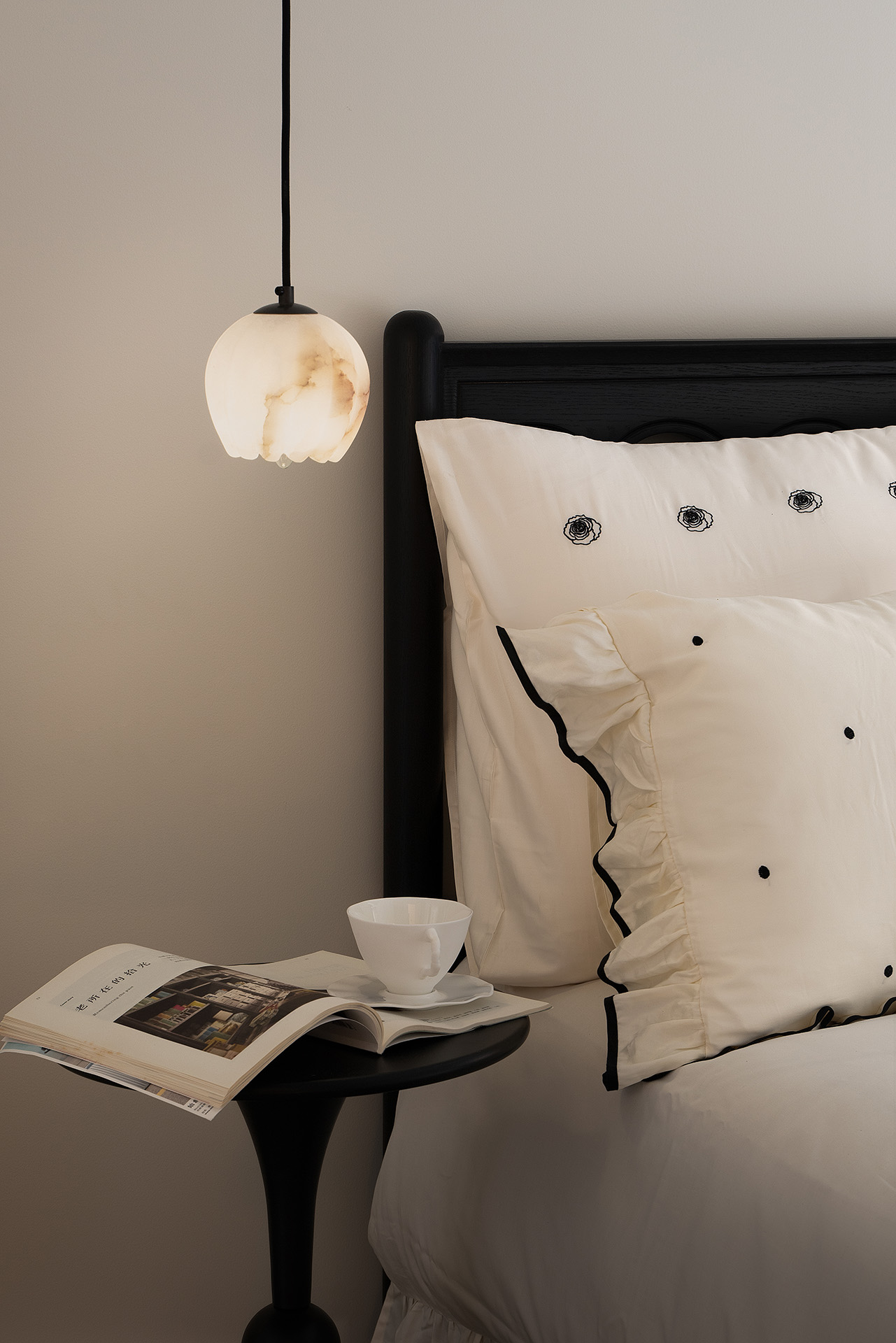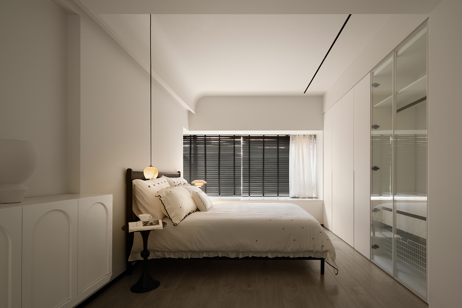 床尾一整面墙体安装了柜体,不单是为了扩大主卧的收纳储物空间,也为了避免柜体破坏空间的平整性。窗帘采用黑色的百叶,阳光明媚的日子,阳光穿过百叶在飘窗上形成一道道光影。
